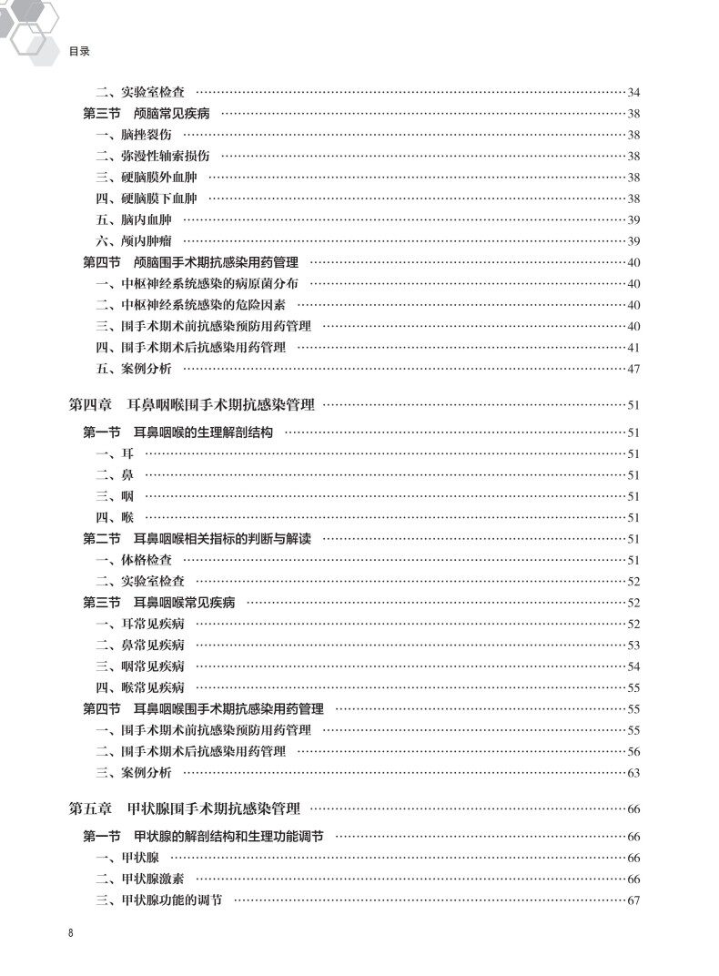 本书共14章,第一章为概述,第二章为围手术期抗感染用药,主要整体阐述围手术期抗感染治疗相关指标、用药分类等,第三章至第十四章按照人体部位进行章节划分,阐述围手术期抗感染用药,包括颅脑、耳鼻喉、甲状腺、乳房、胸腔、消化道、胆囊、胰腺、肝脏、骨及骨关节、皮肤软组织及泌尿系统器官,各章均包括生理解剖结构与常见疾病、抗感染相关指标的判断与解读、抗感染用药。本书以理论知识+案例分析为架构,除了系统性地阐述了疾病的诊断治疗之外,每个章节还附有一个由编者提供的真实案例,更有专业的临床药师全程参与治疗并进行总结分析。