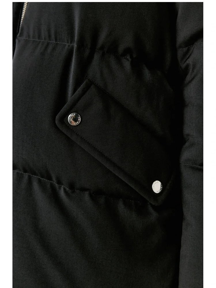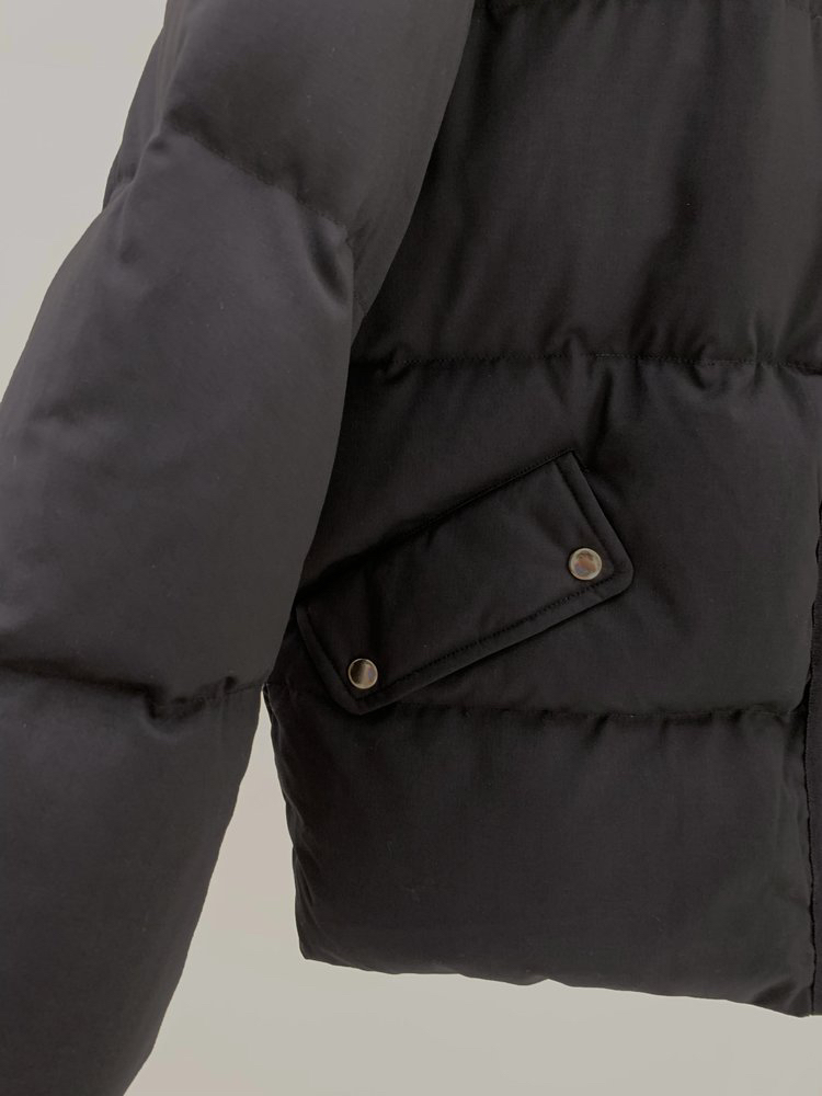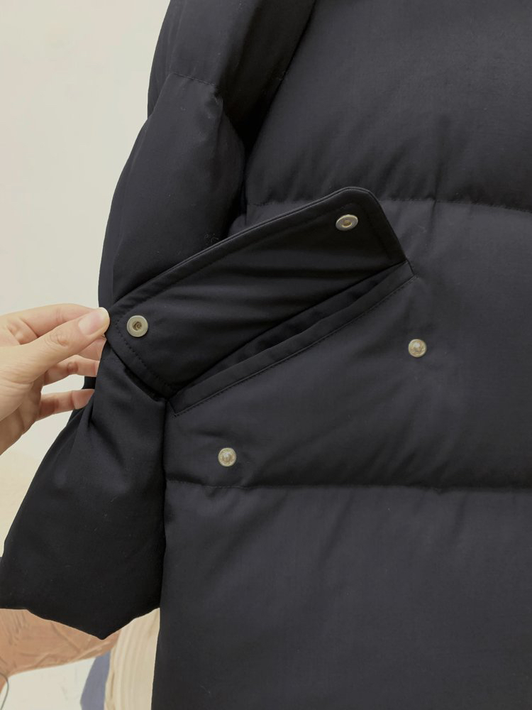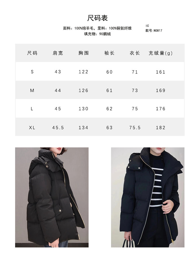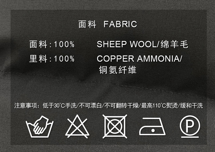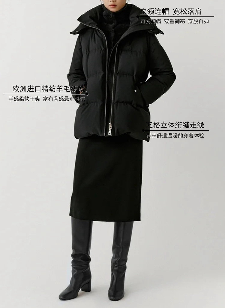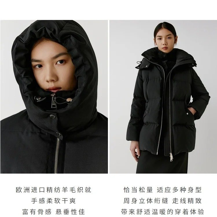 精纺羊毛白鹅绒羽绒服 重磅高暖羽绒 内填高质90鹅绒 恰当松量 周身立体绗缝 甄选100%品质绵羊毛面料 立体微阔袖型