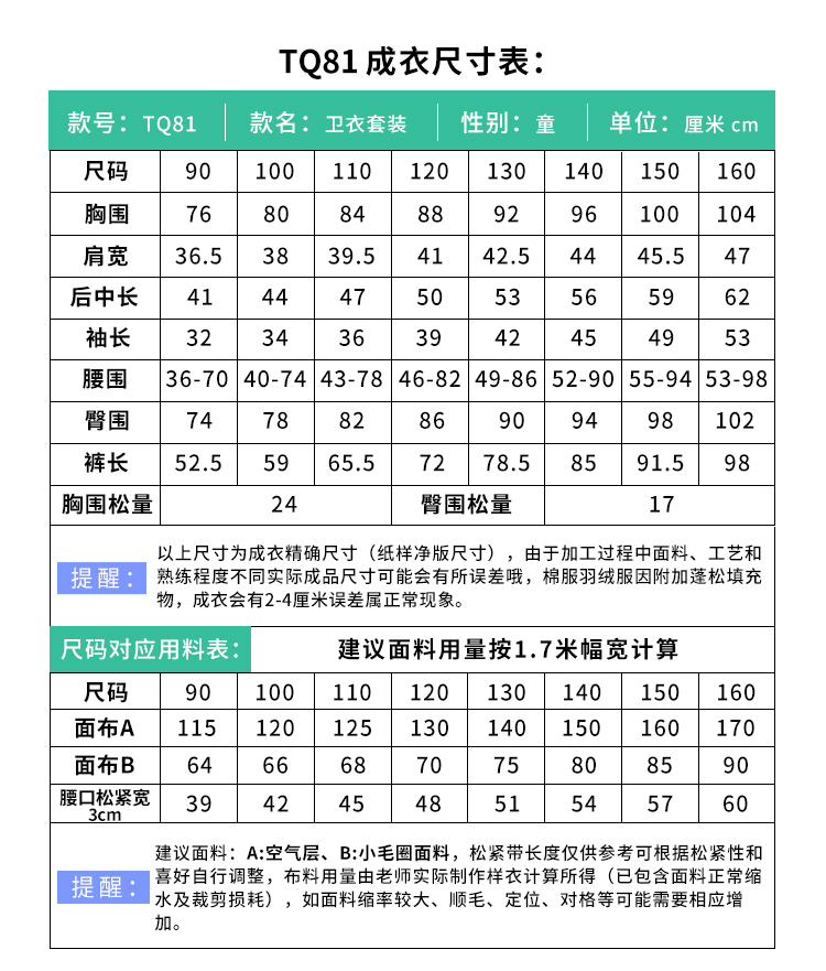 裁缝学苑TQ81 加绒卫衣纸样卫裤儿童套装裤子童装运动两件套打板