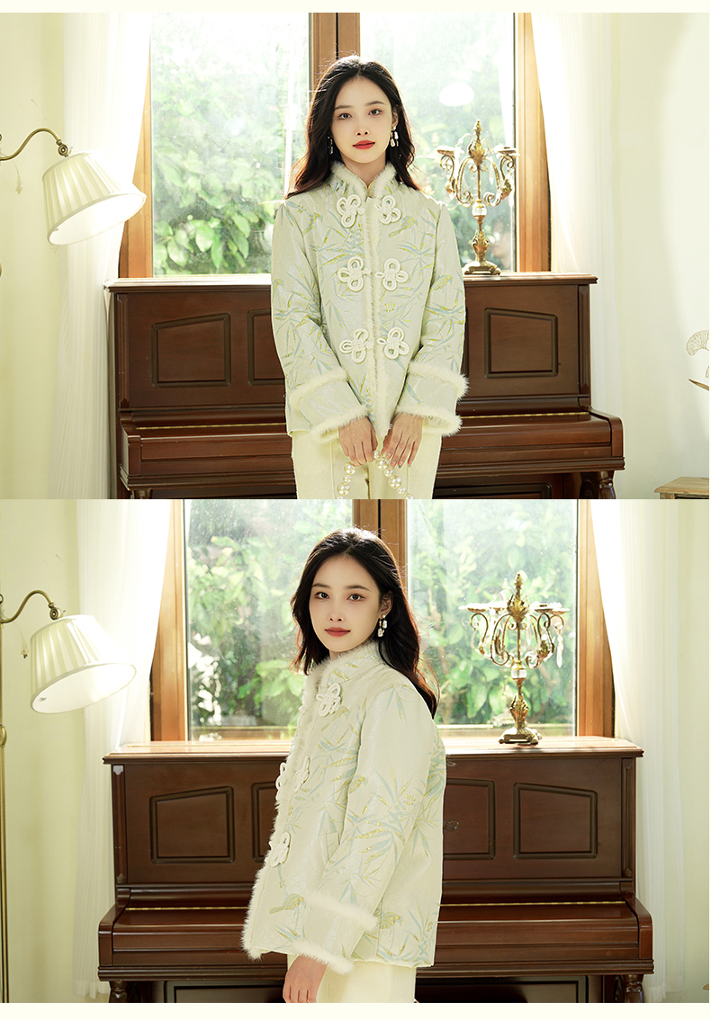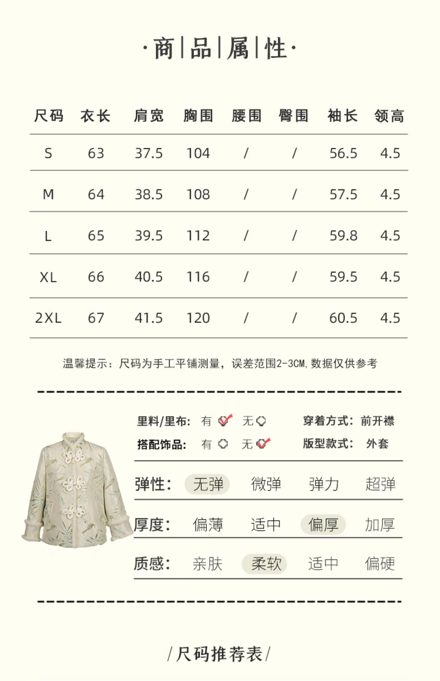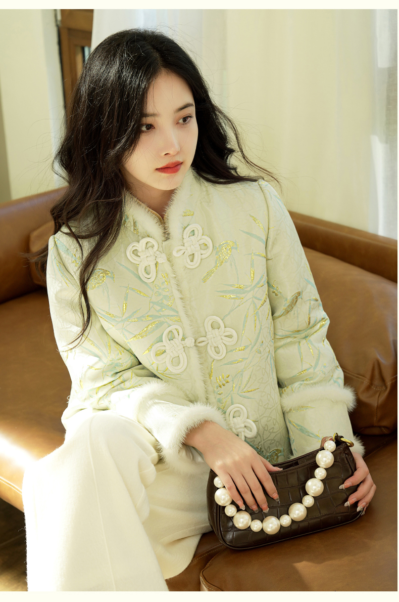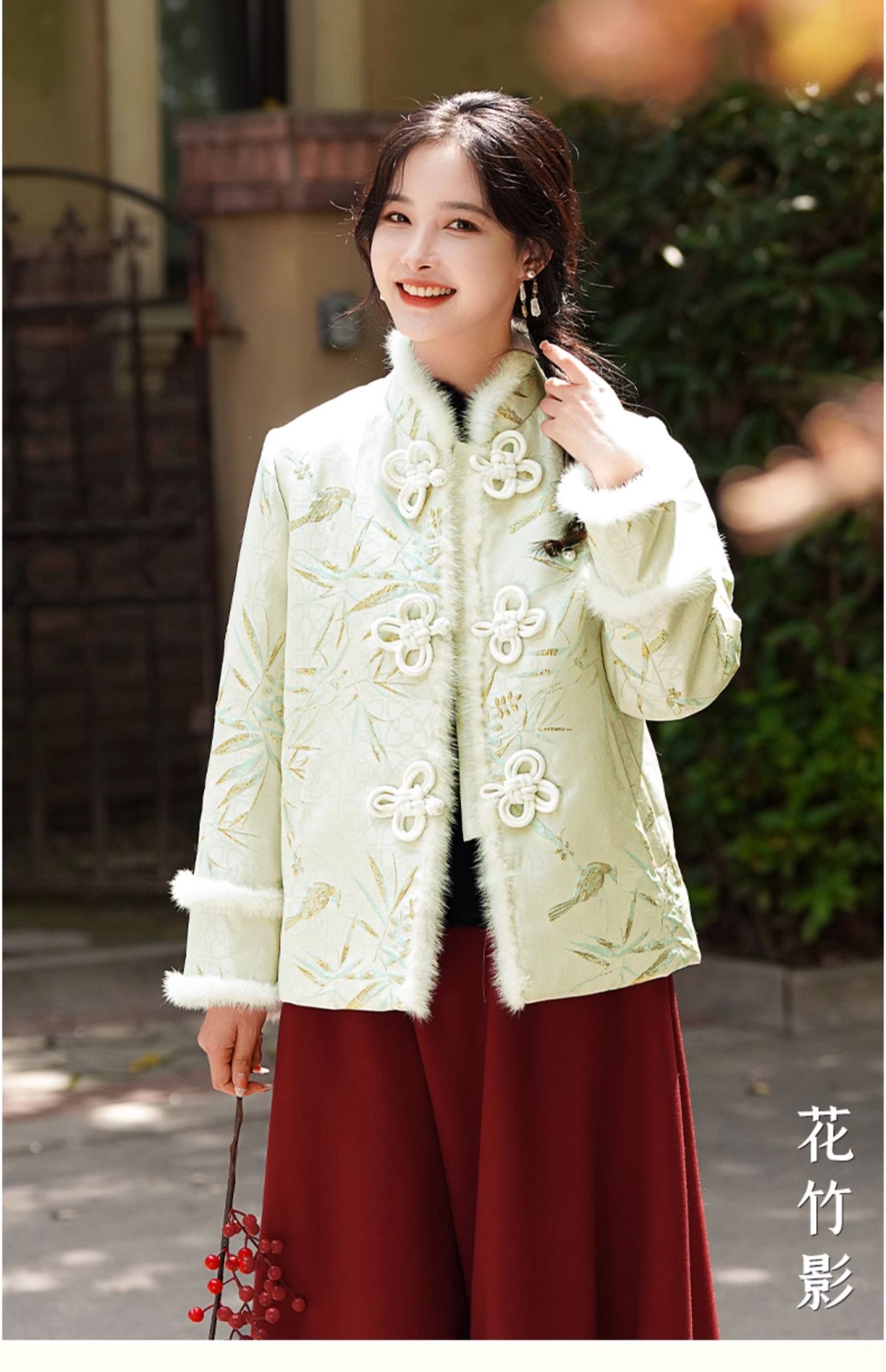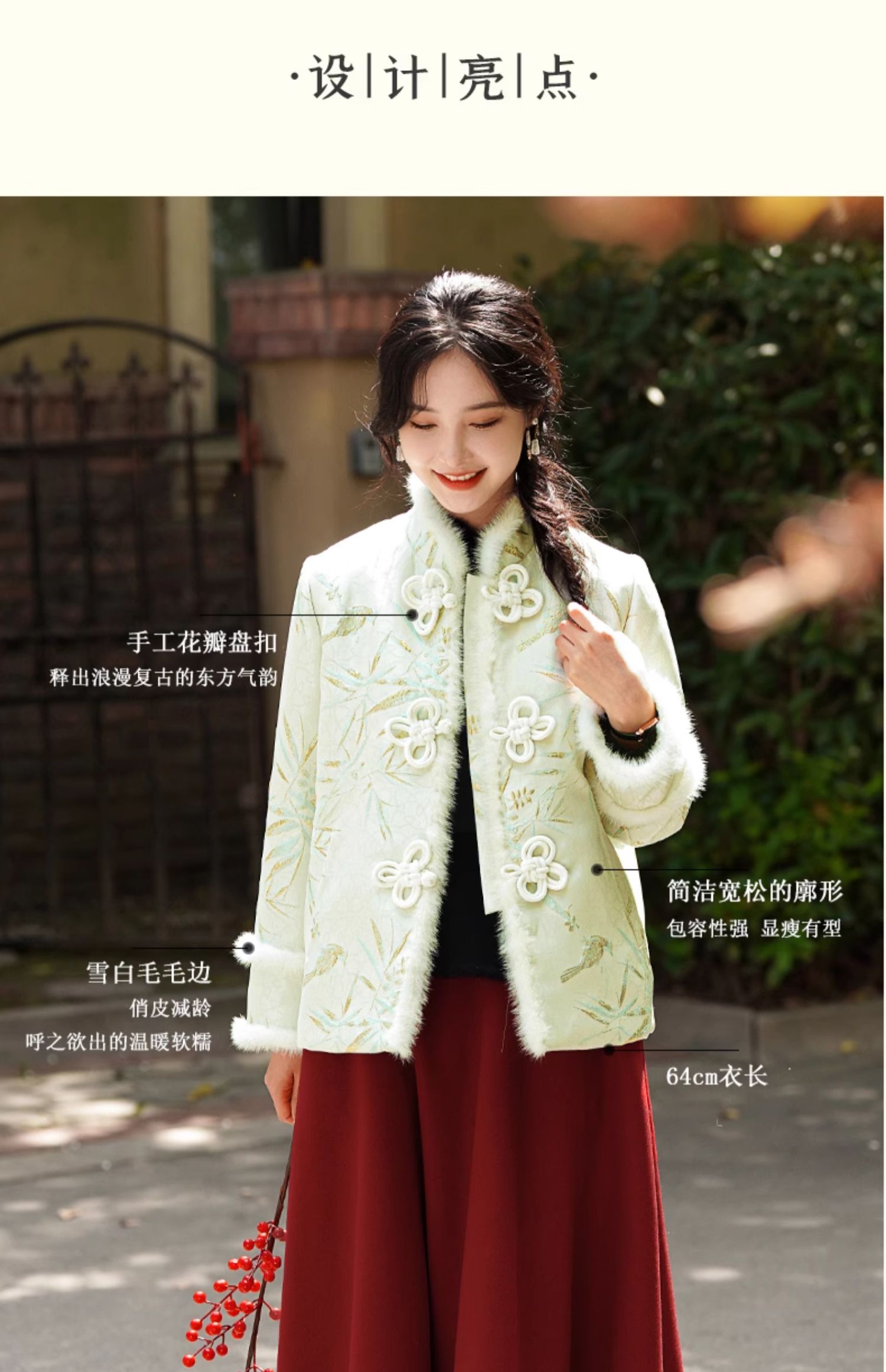 上海逸红颜花竹影2025冬季新款新中式棉服手工花瓣盘扣金丝提花料