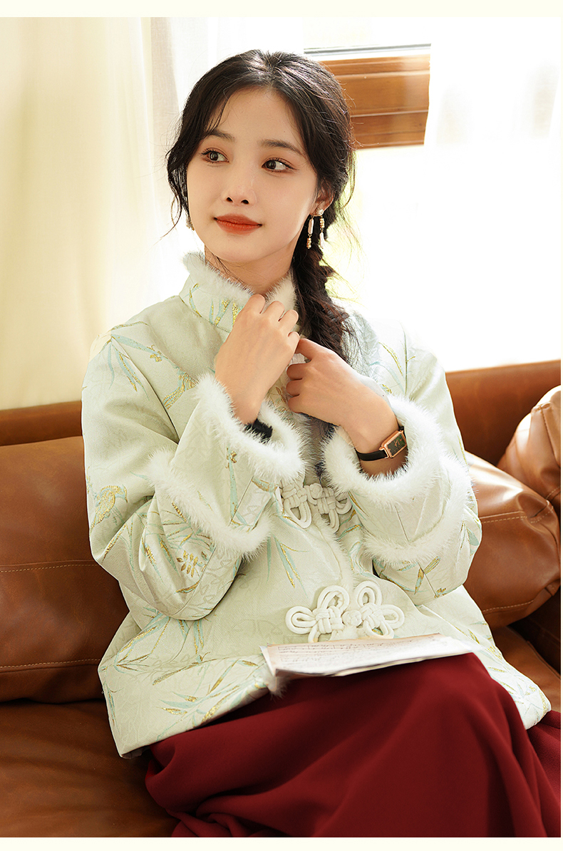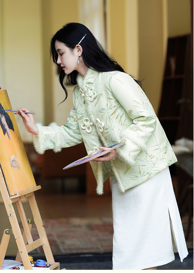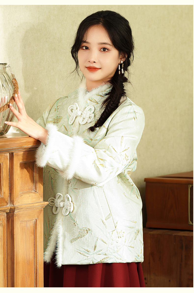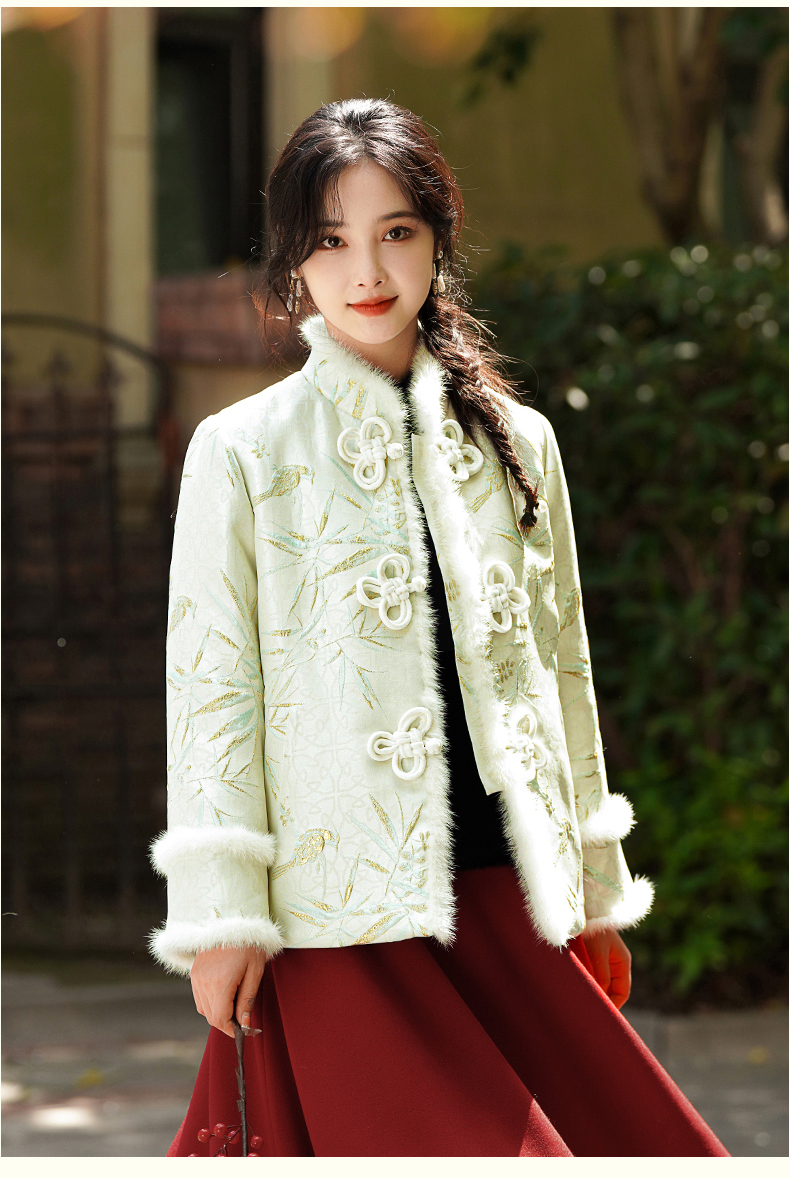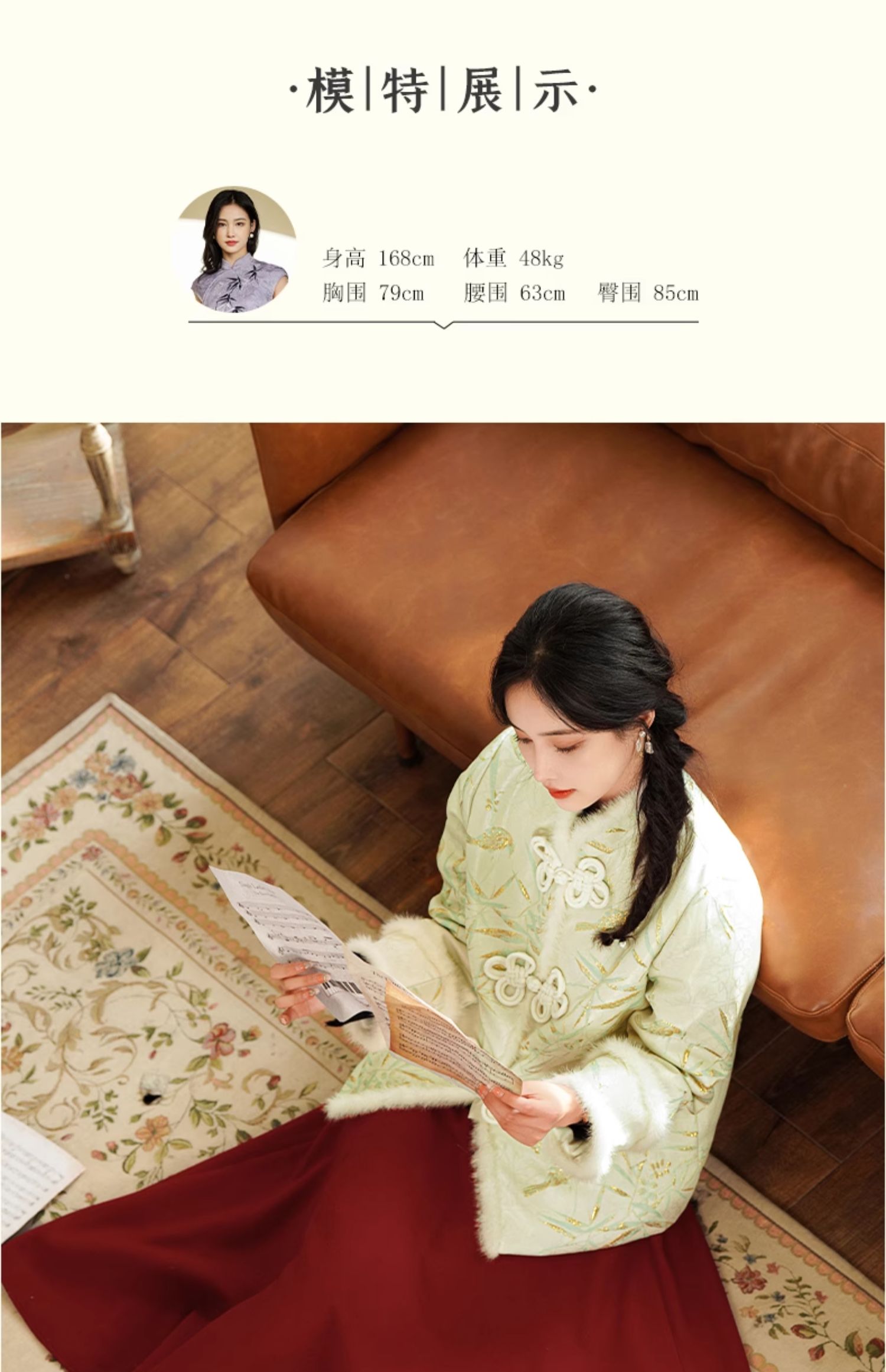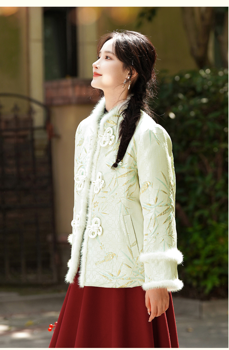 上海逸红颜花竹影2025冬季新款新中式棉服手工花瓣盘扣金丝提花料