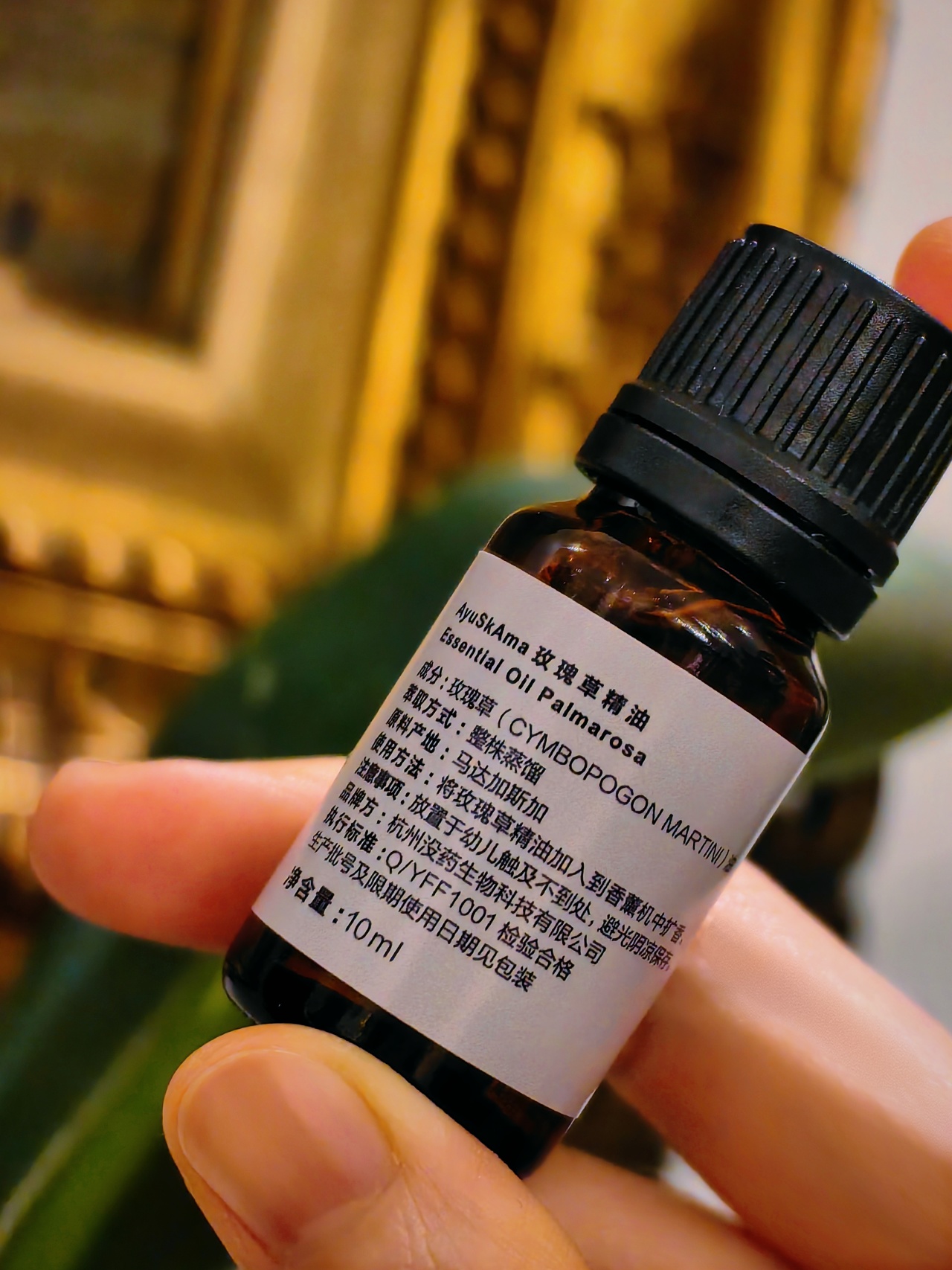 温馨小提示:玫瑰草精油虽然亲肤性极强,但敏感肌肤需再降低剂量,特别是脸部,建议稀释至 0.5%。