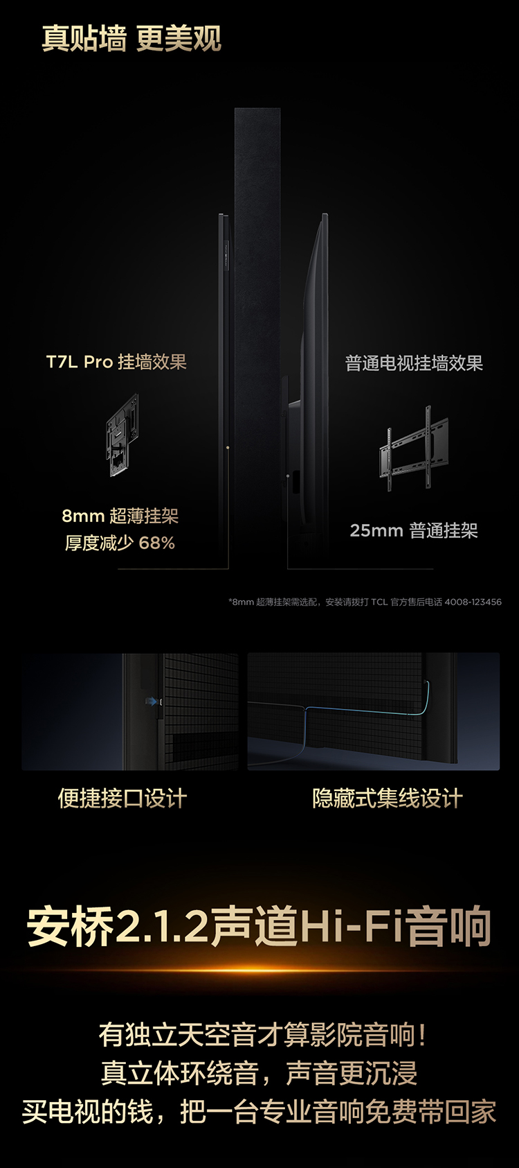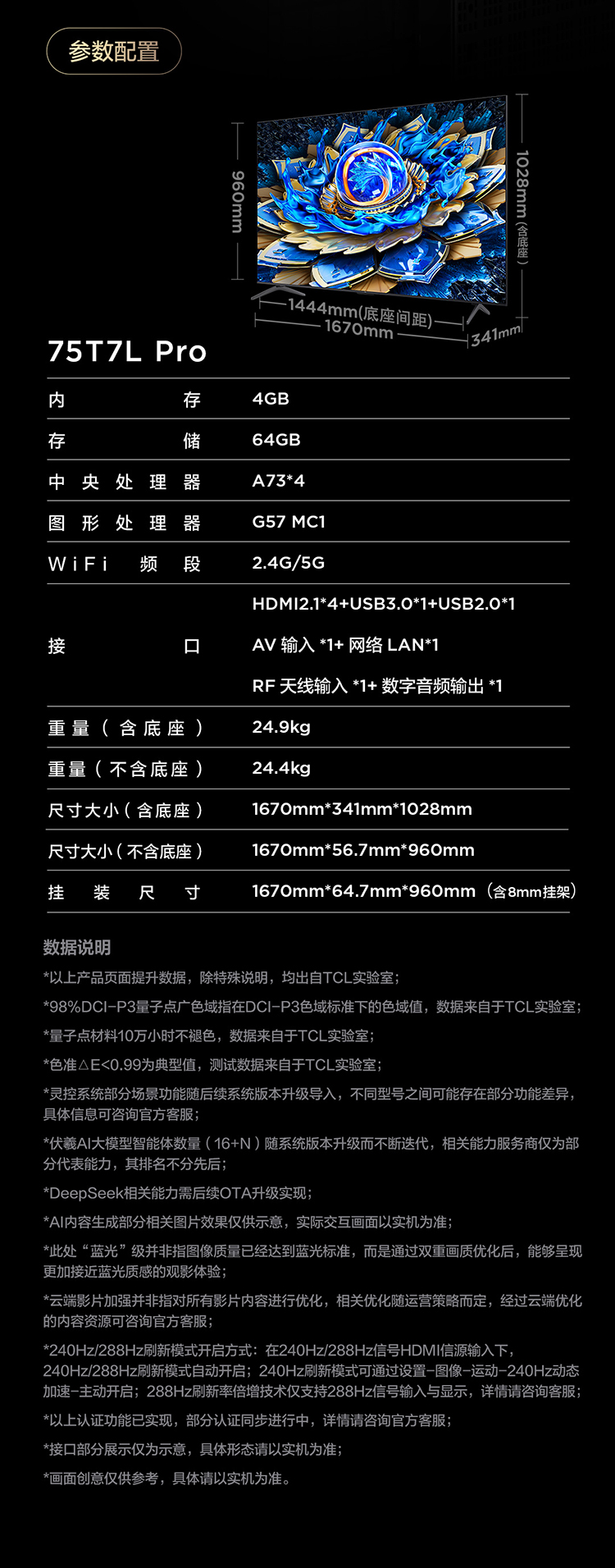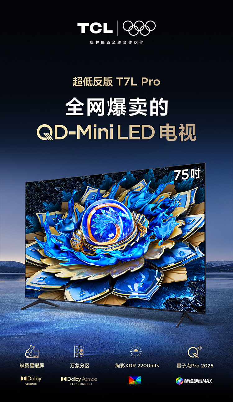 TCL电视 75T7L Pro 75英寸 QD-Mini LED 蝶翼星曜屏 万象分区 绚彩XDR 2200nits 超薄电视