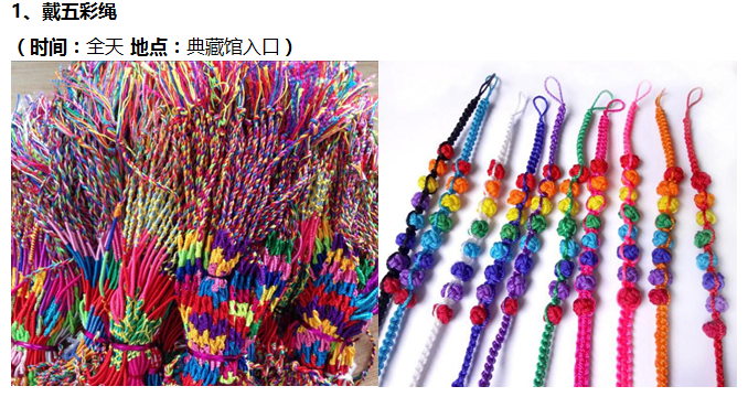 象征五方五行的五种颜色"青、红、白、黑、黄"被视为吉祥色。孩子们要在手腕脚腕上系上五色丝线,避开蛇蝎类毒虫的伤害。系线时,禁忌儿童开口说话。五色线不可任意折断或丢弃,只能在夏季第一场大雨或第一次洗澡时,抛到河里,意味着让河水将瘟疫、疾病冲走。