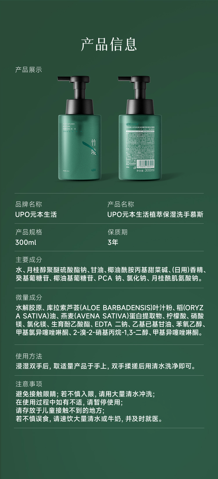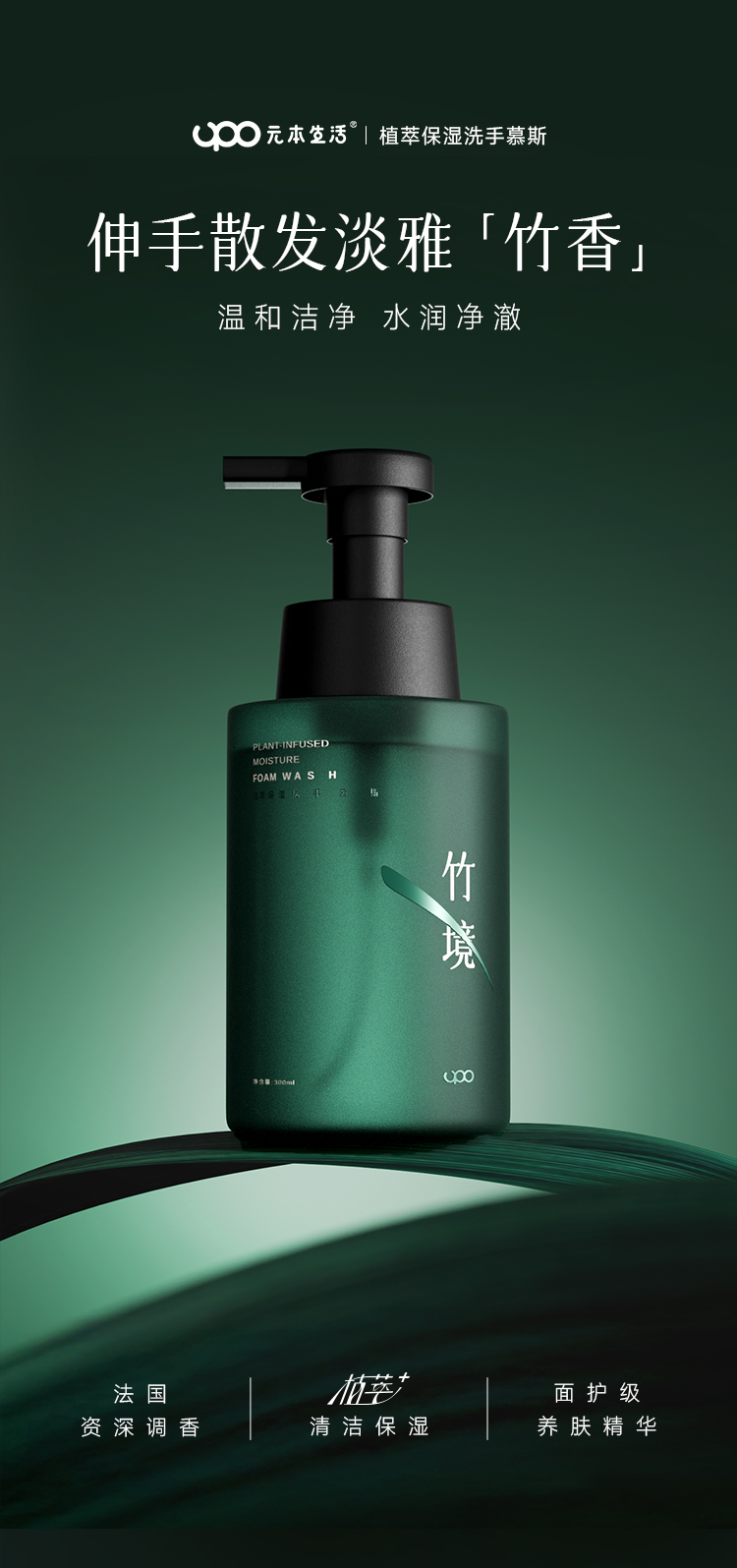 【家居生活-洗手液】UPO元本生活 植萃保湿洗手慕斯 300ml/瓶 泡沫绵密 温和洁净 水润净澈 清洁香氛护理三合一