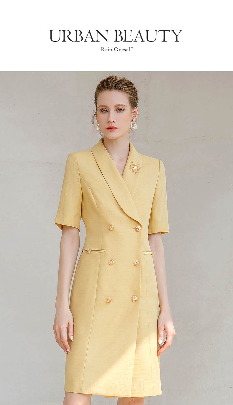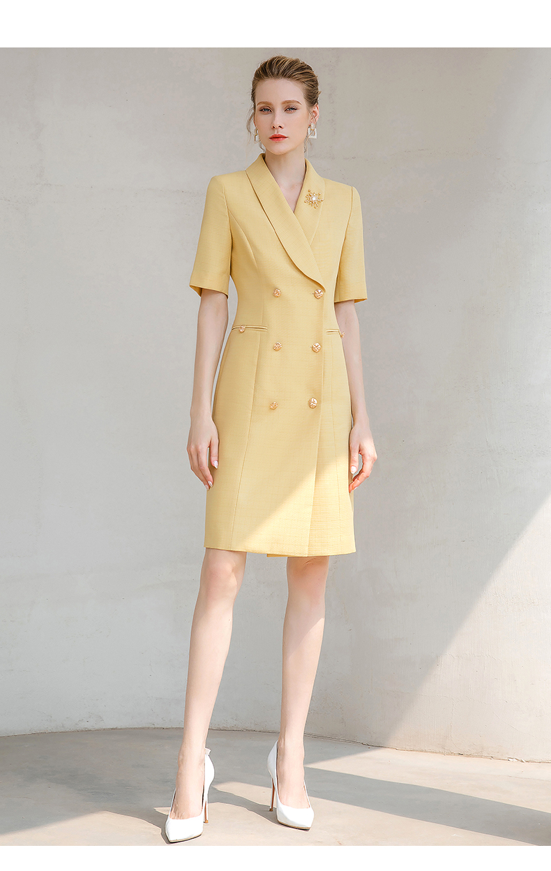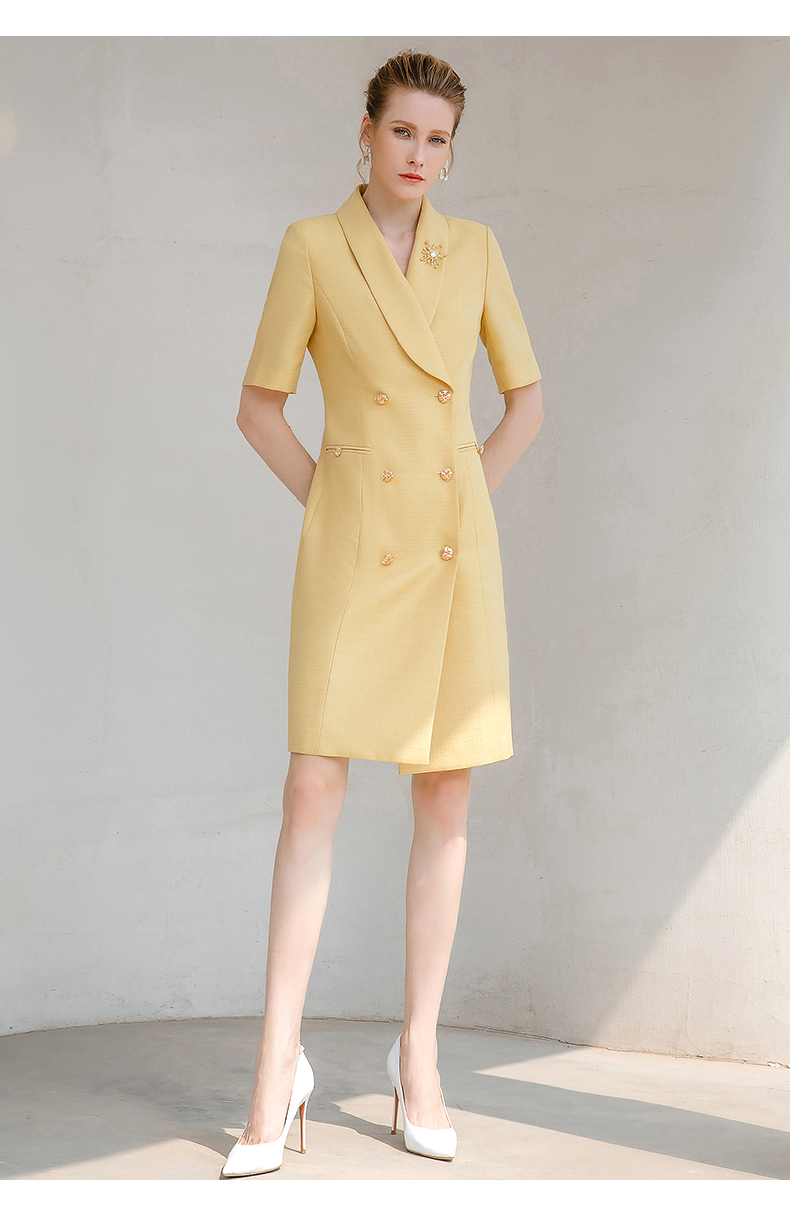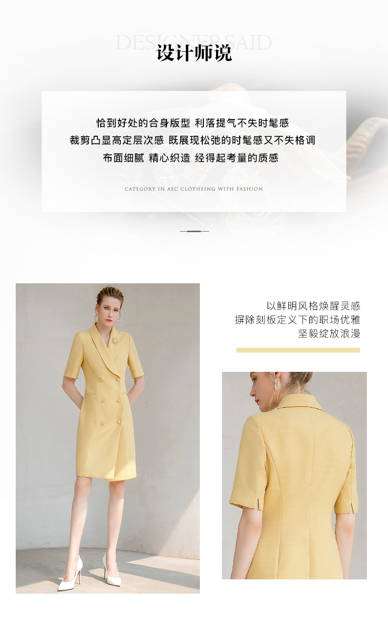 夏季新款高端黄色连衣裙女短袖职业装洋气西装裙主持人工作服套裙