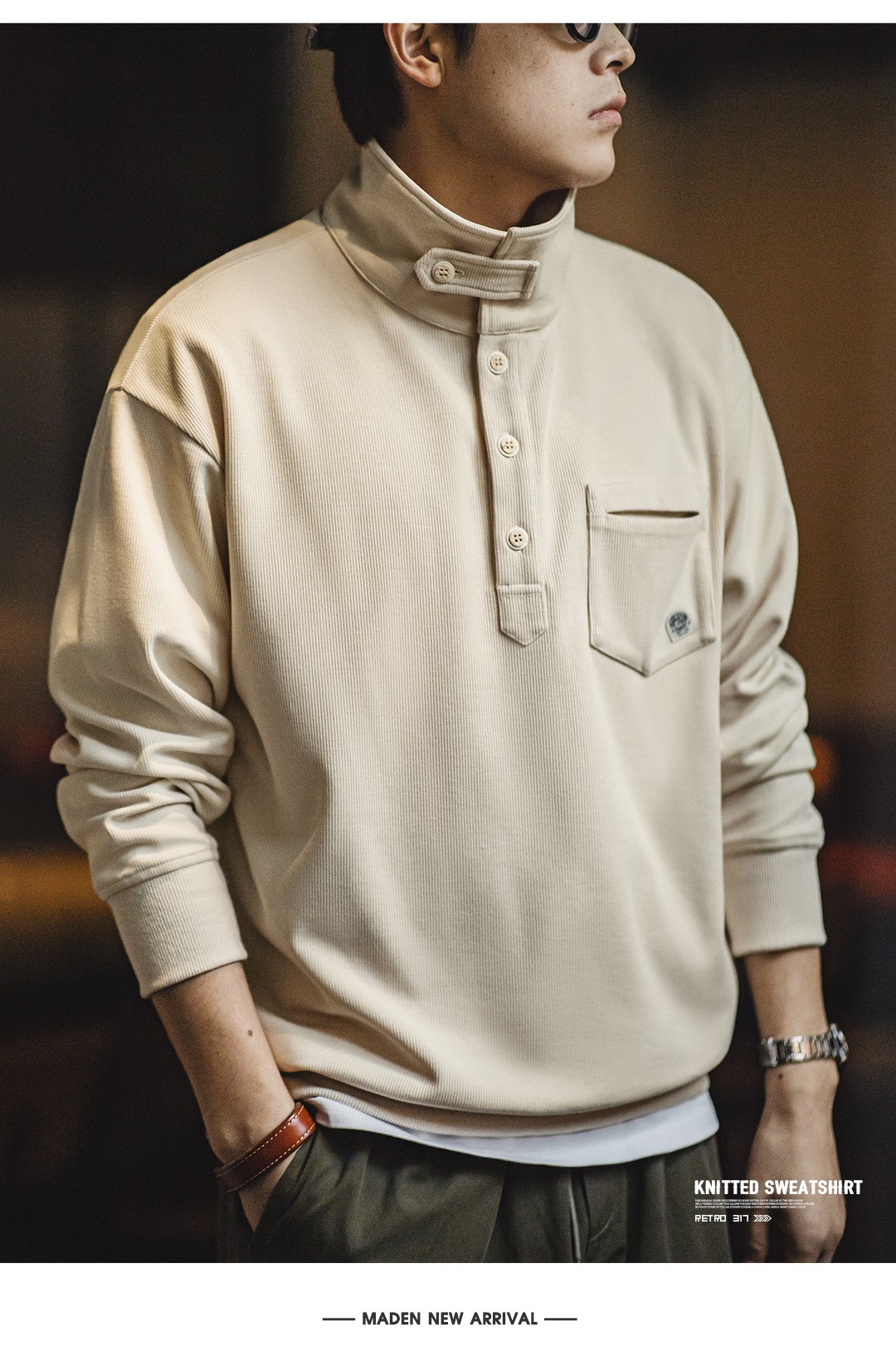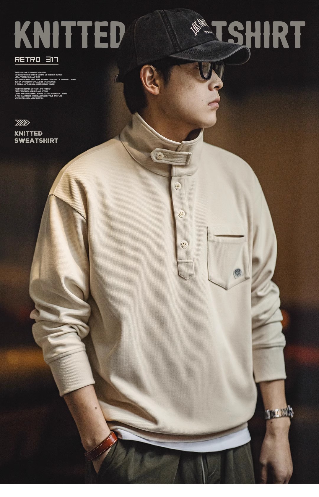 工装优选 美式休闲半开襟立领卫衣慵懒风翻领针织Polo衫男春秋