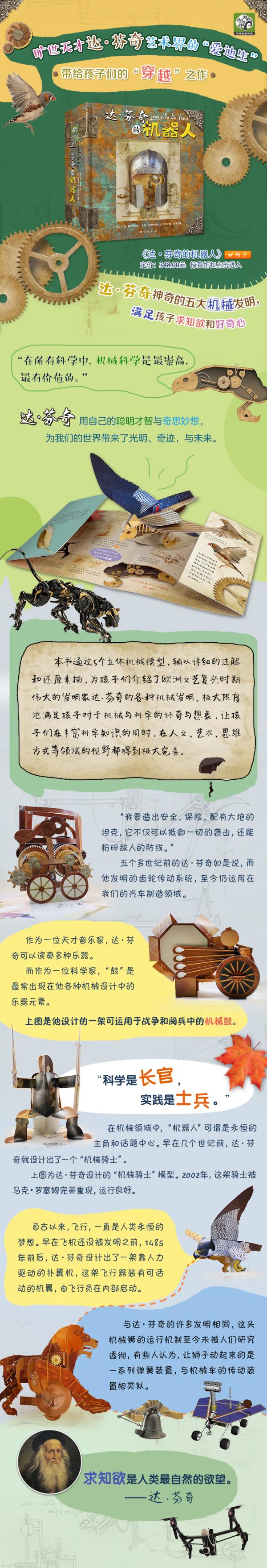 《达芬奇的机器人(立体书) 》括了达?芬奇设计的5个机械模型,立体的3D形象设计精巧绝伦,大大满足孩子对科学机械的好奇心和想象力