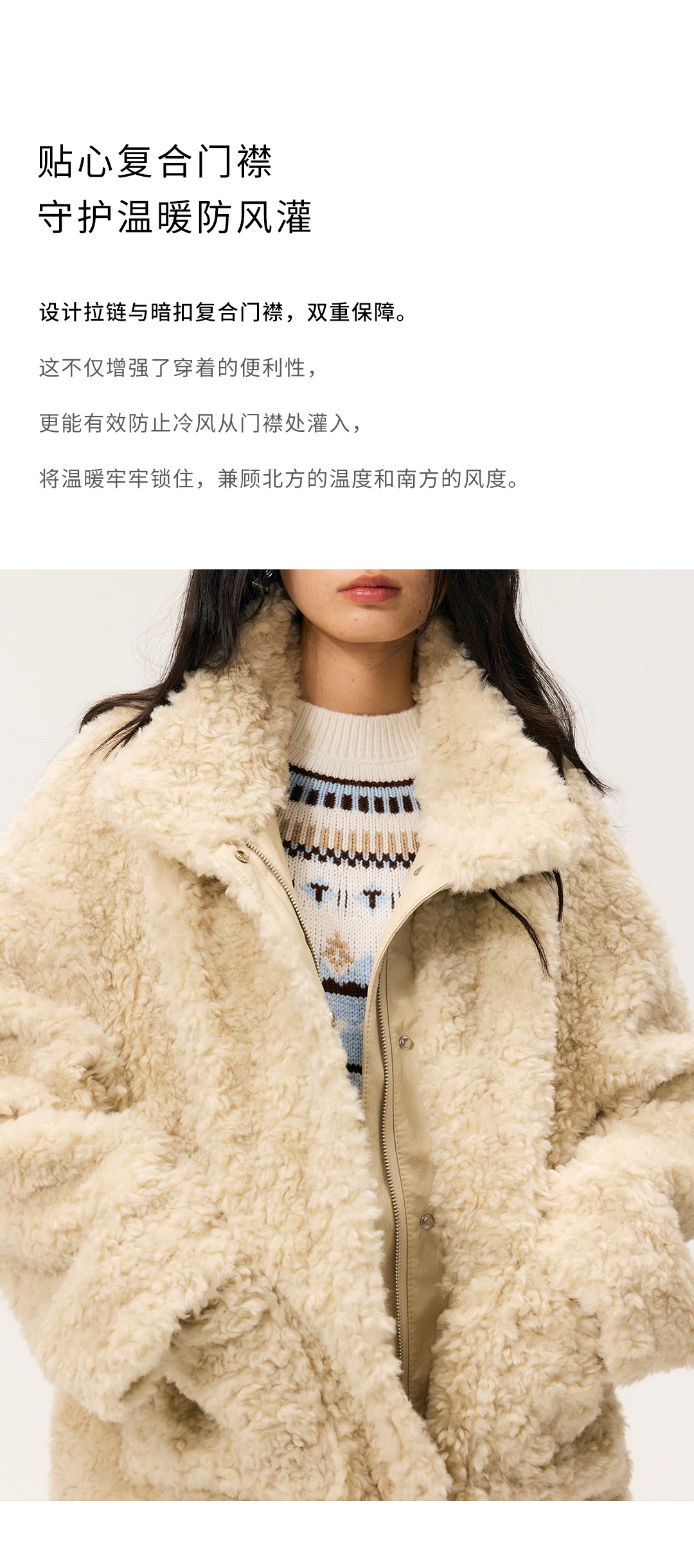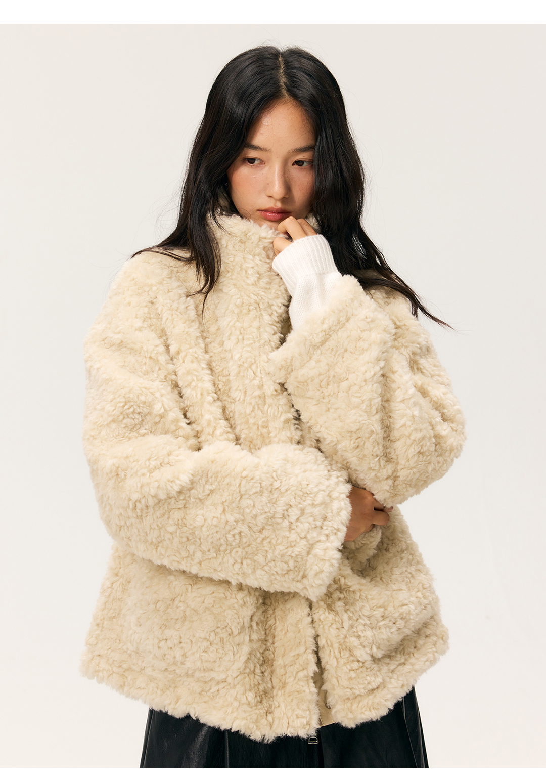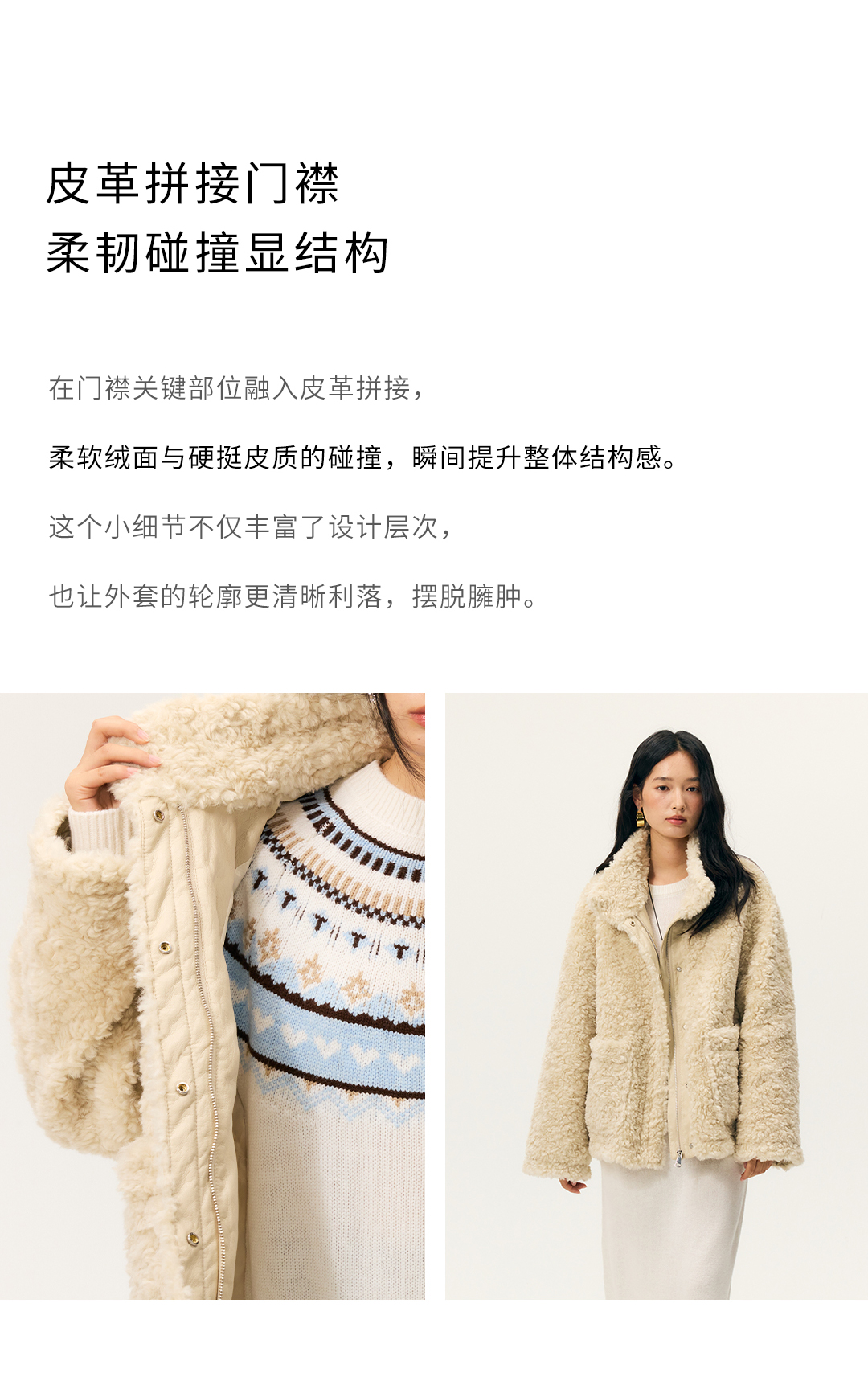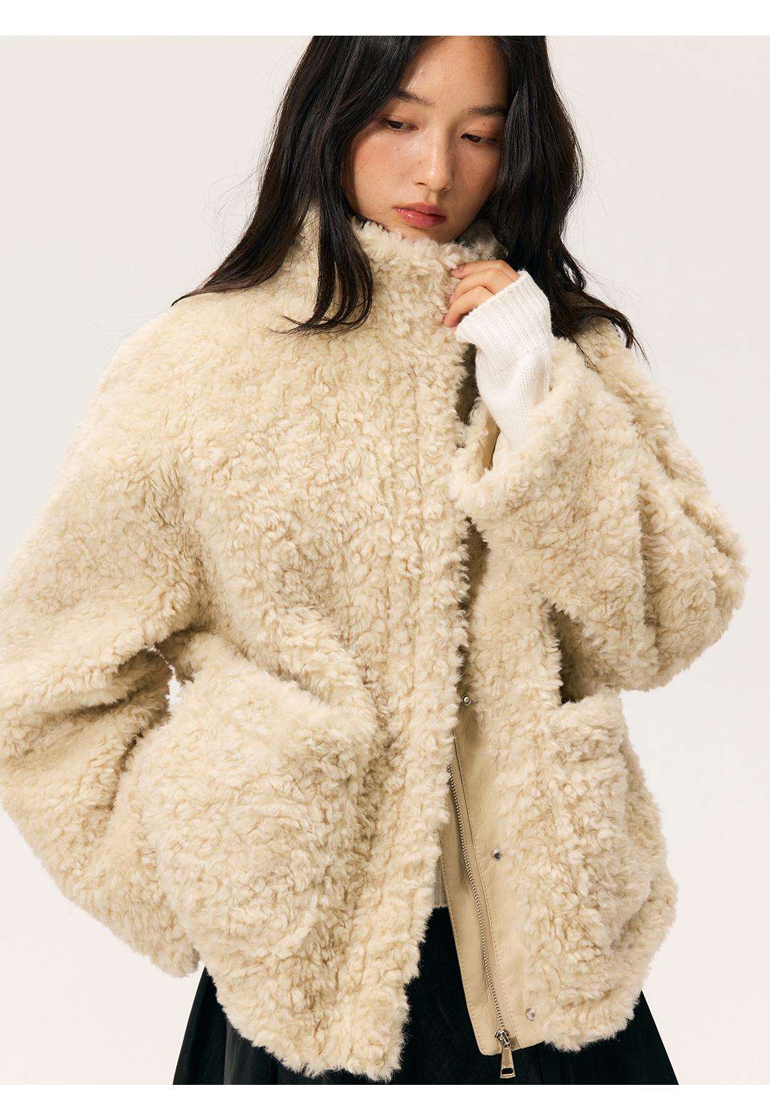 HeyDress羊剪绒卷毛立领拼皮外套