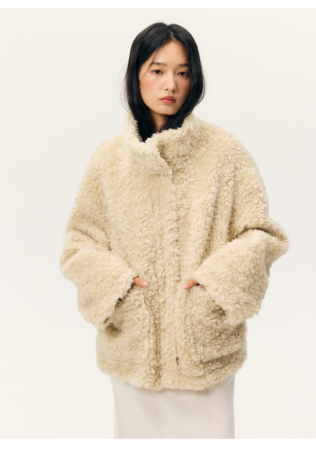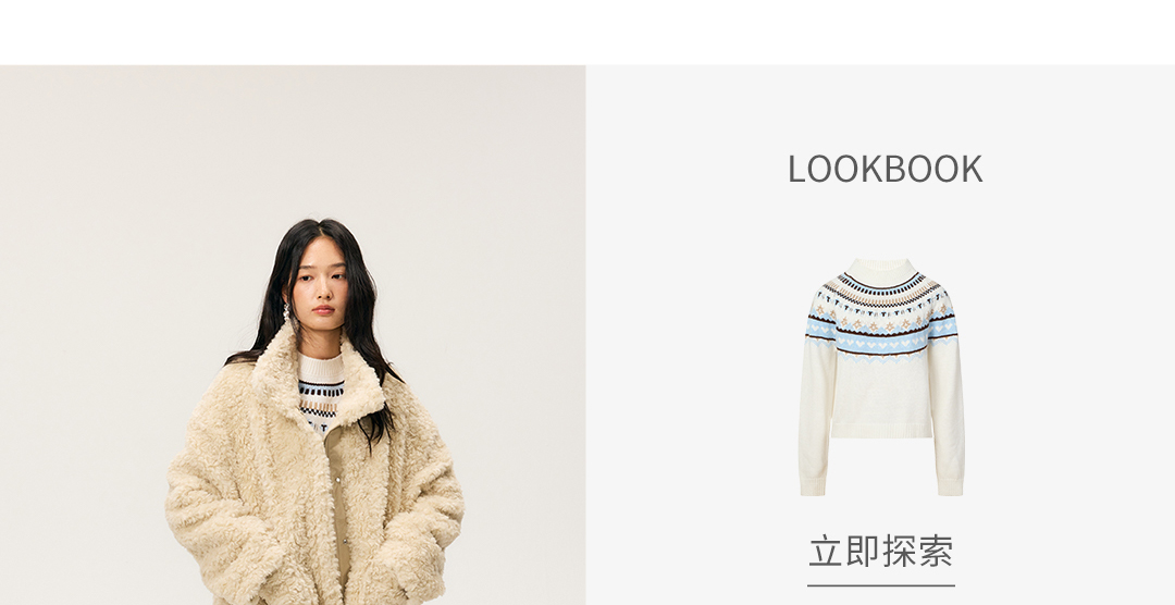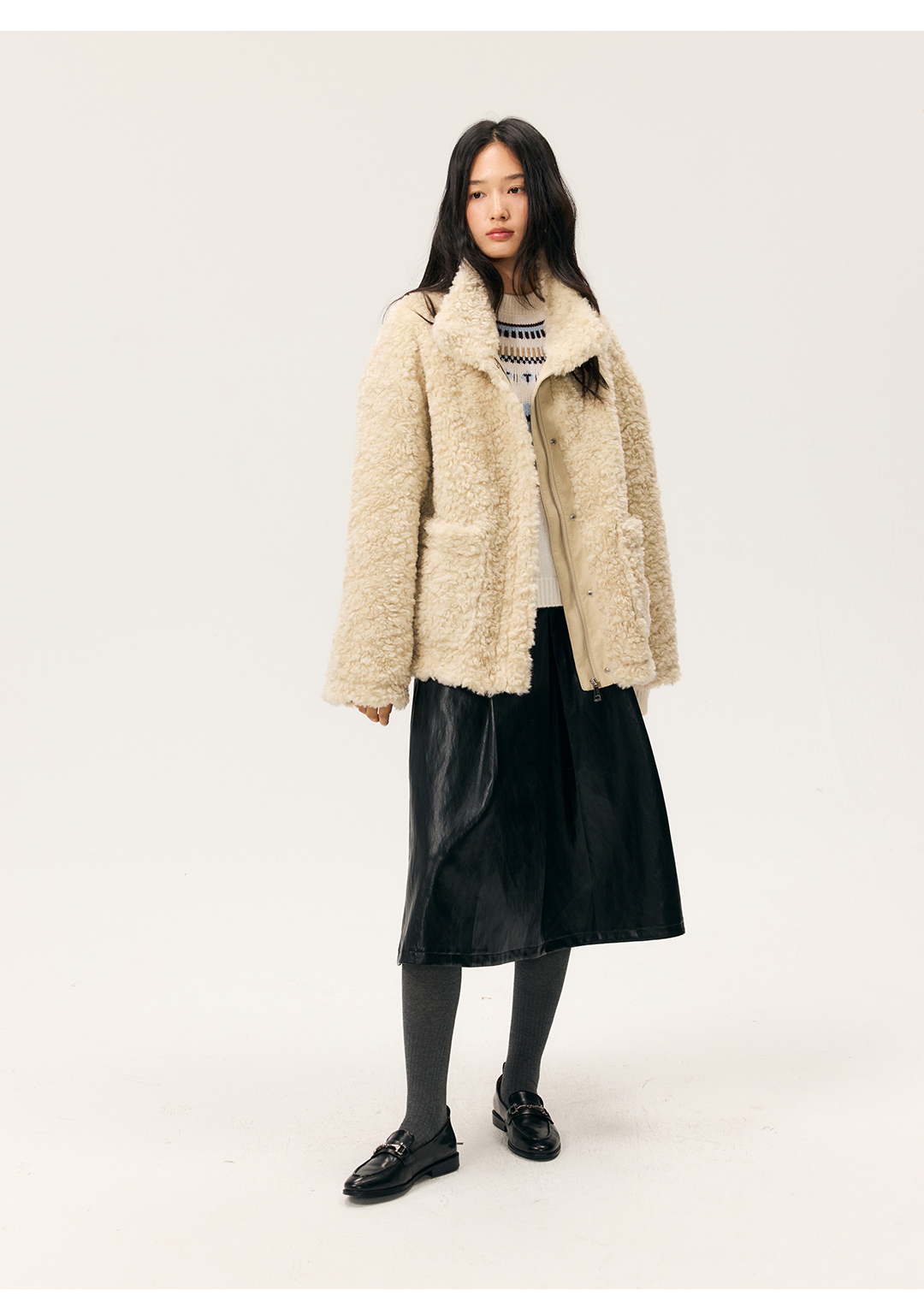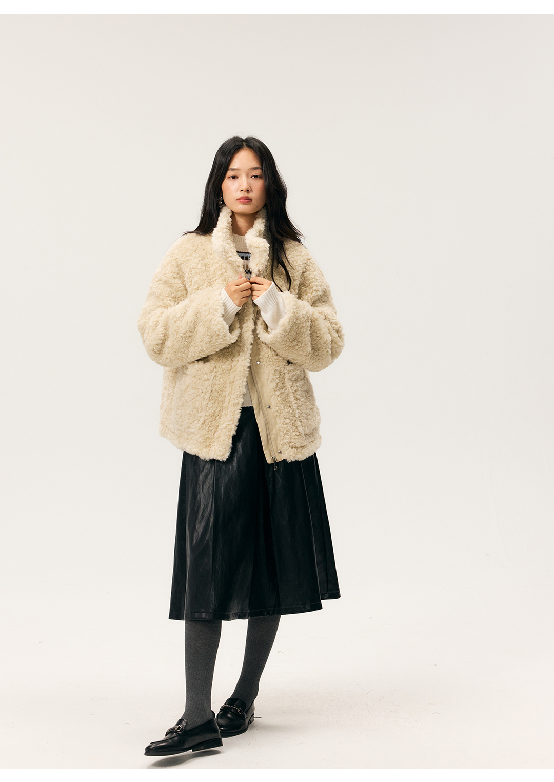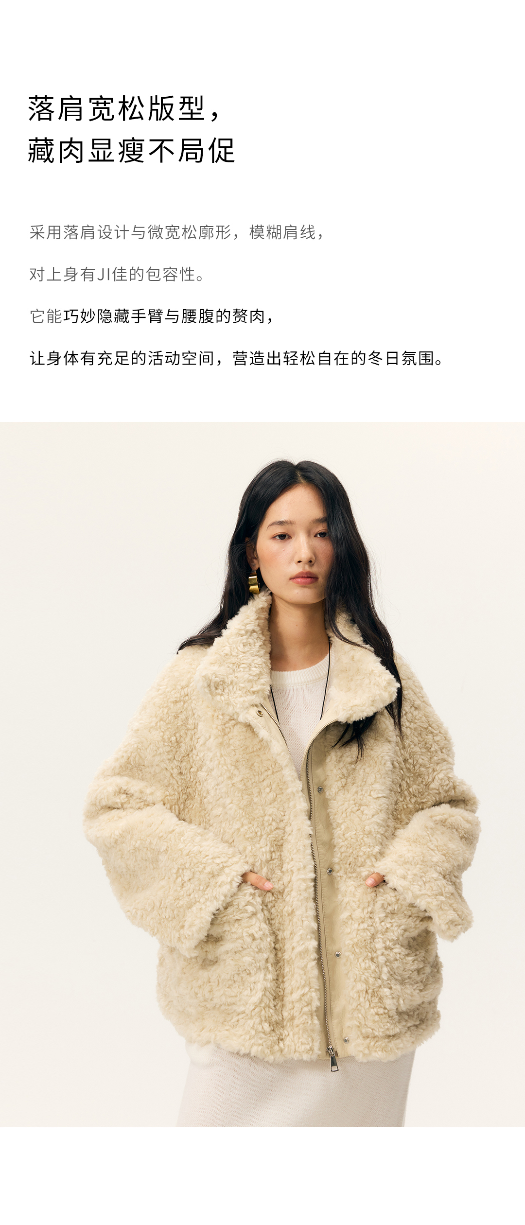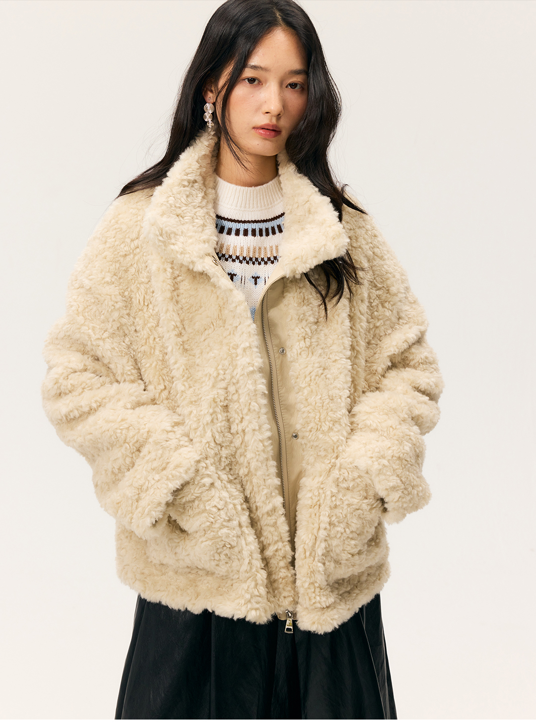 HeyDress羊剪绒卷毛立领拼皮外套