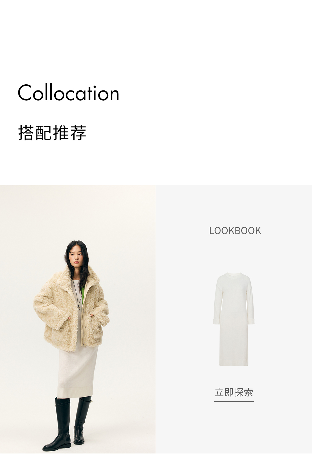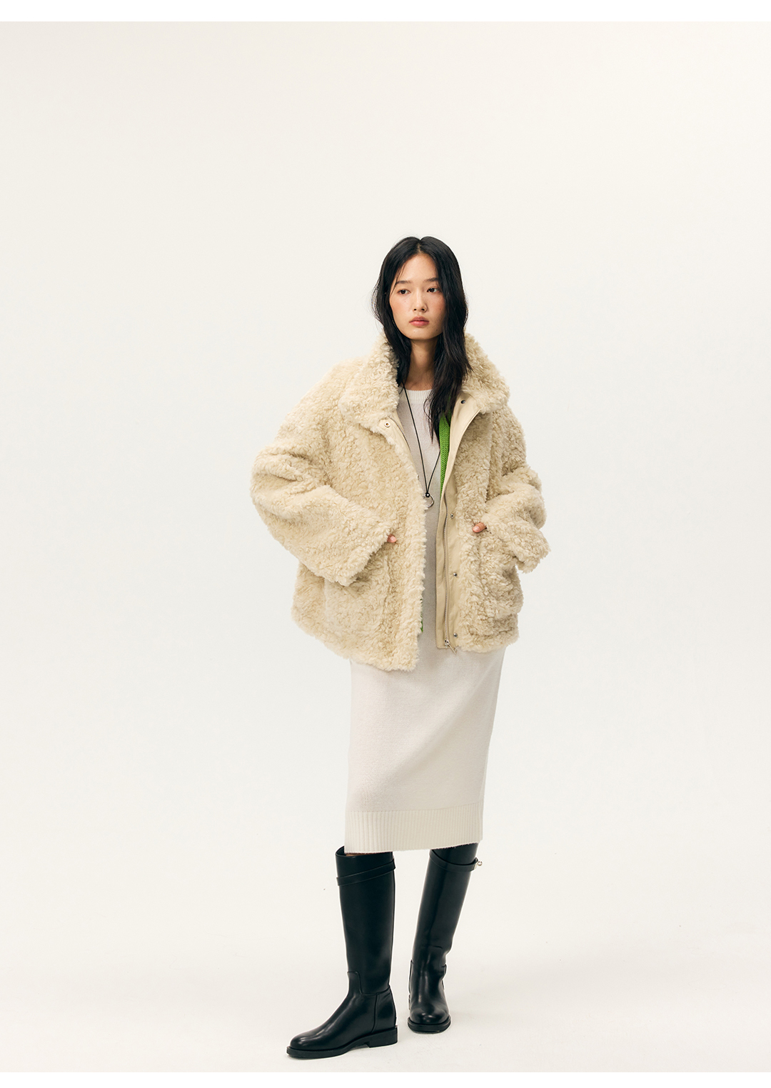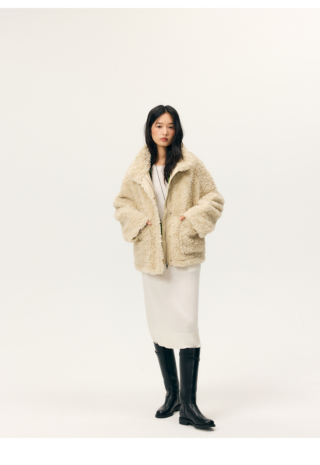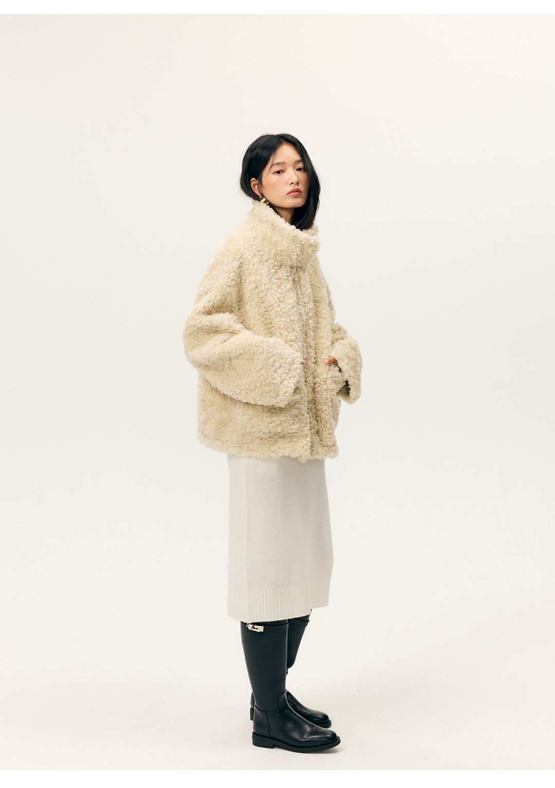 HeyDress羊剪绒卷毛立领拼皮外套
