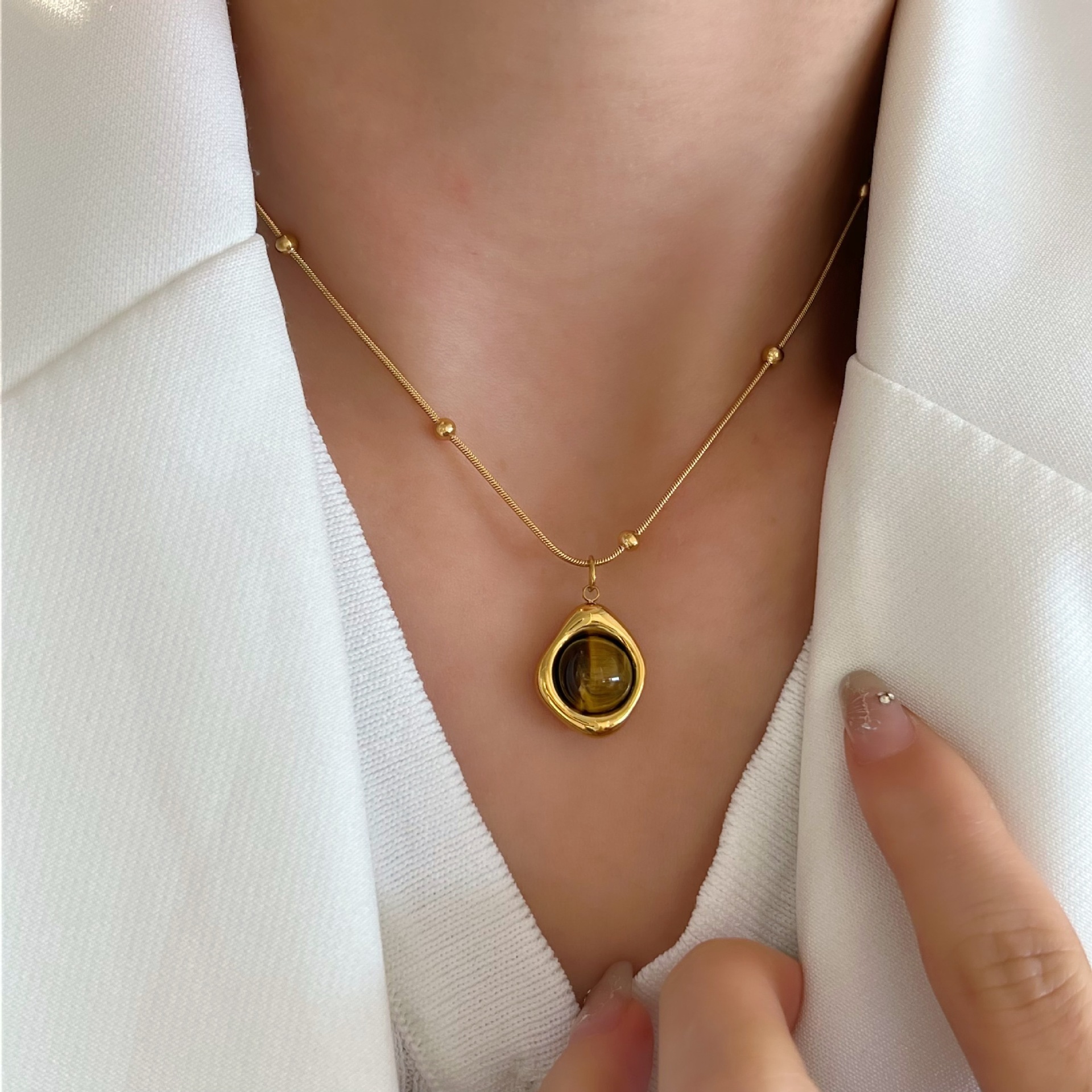 丁摩 美拉德虎眼石项链女 秋冬轻奢小众钛钢不褪色 毛衣链5ZF-191