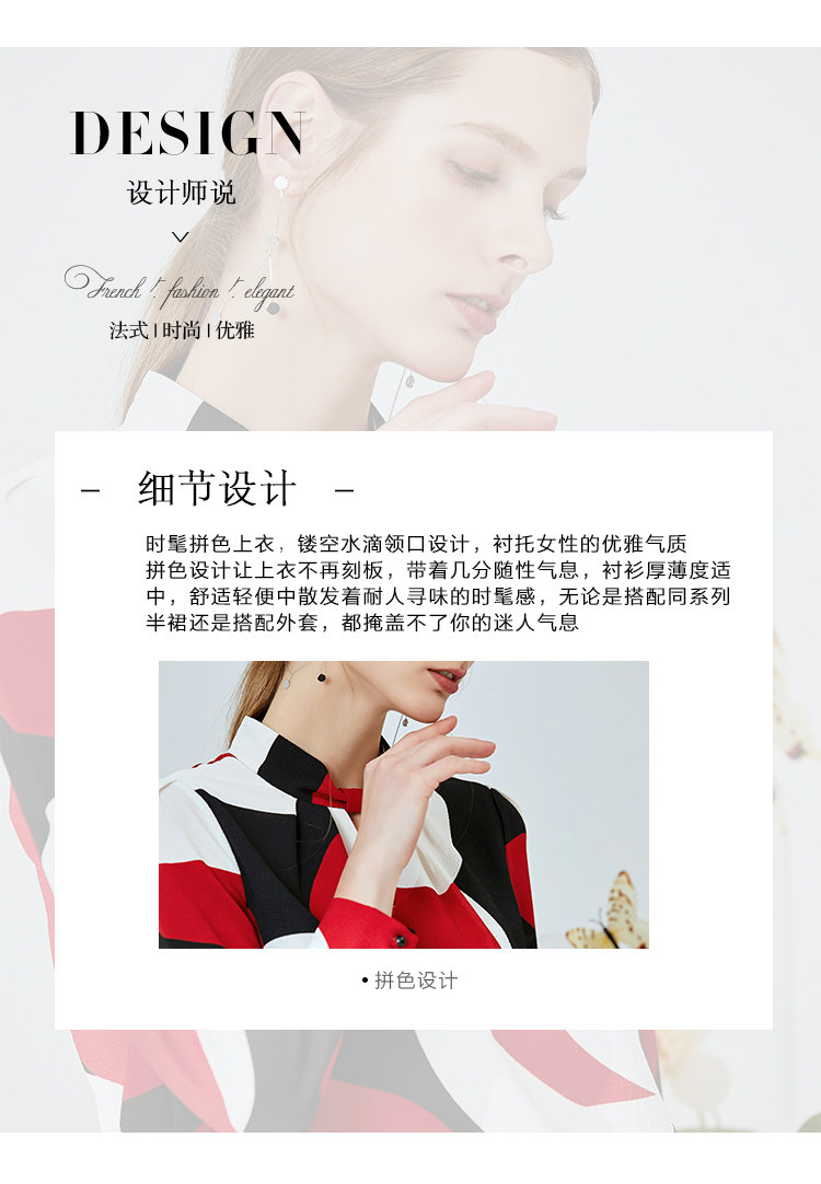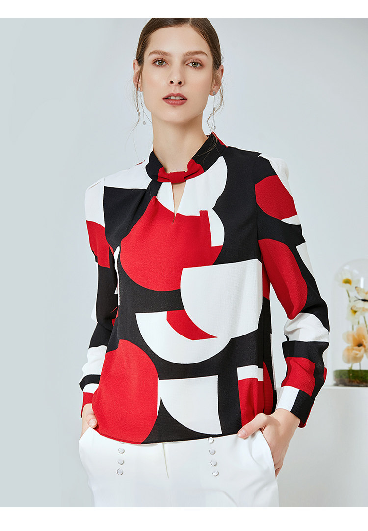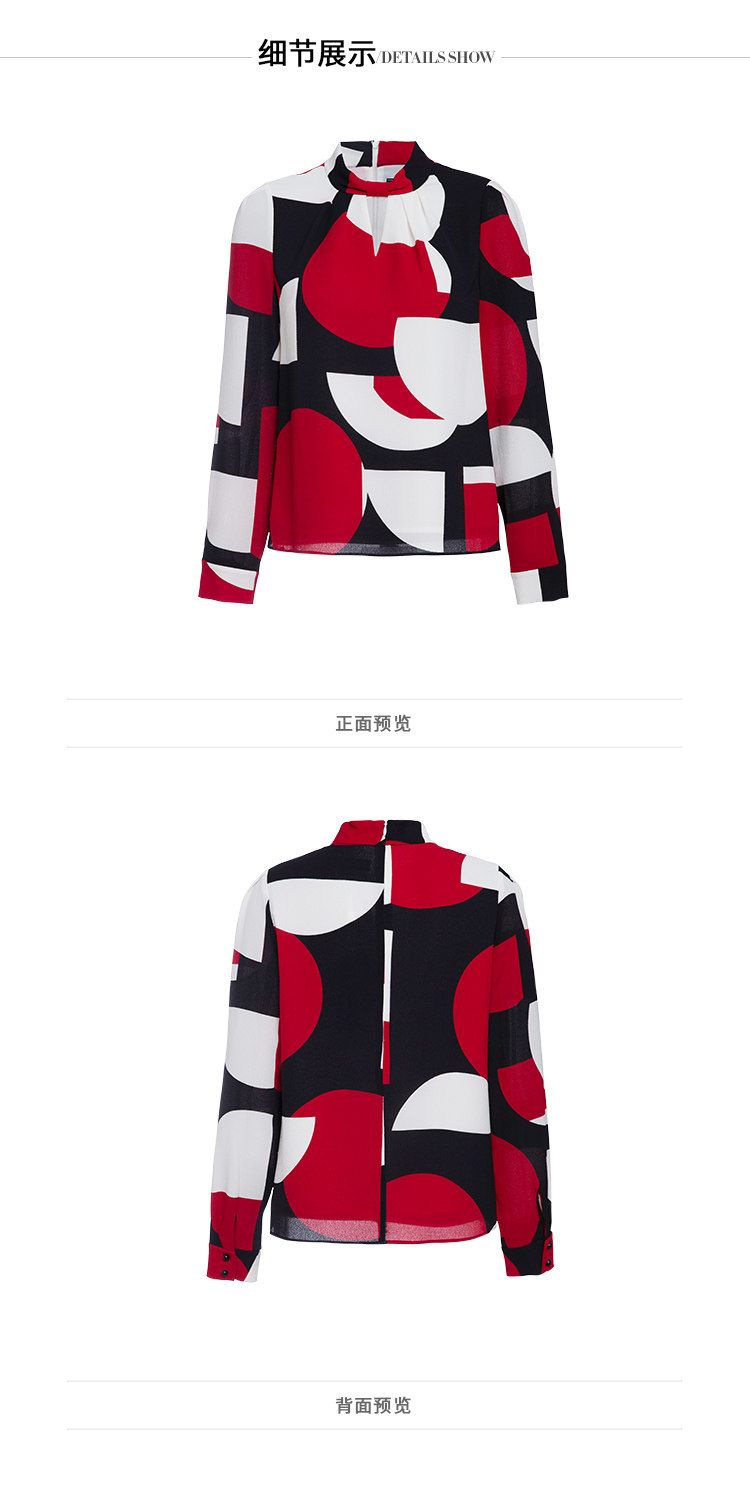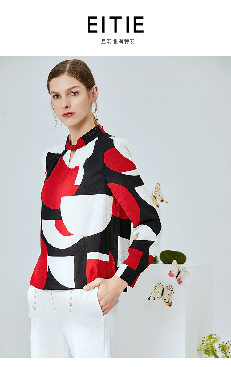 EITIE爱特爱春季新款通勤半高领镂空撞色印花长袖女上衣6113801