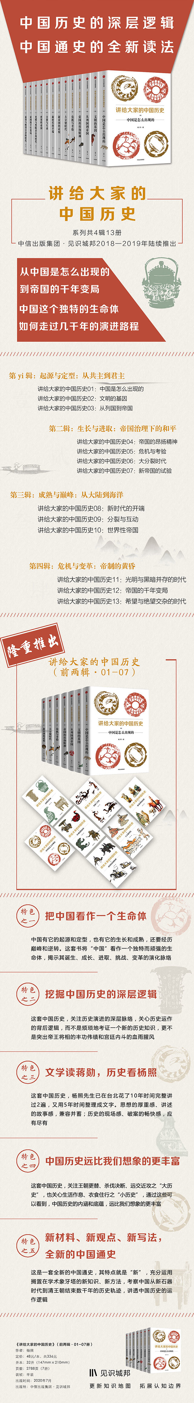 这套书是一套全新的中国通史,是今天的历史学家用今天的新视角写给今天中国人的中国历史。我们现在读的中国历史,太多都是50年前的老书,而100年以来全新的考古发现和学术成果却被人们束之高阁,我们一点都不知道。这套书提供的就是新材料、新成果、新写法,讲透中国历史的运作逻辑。