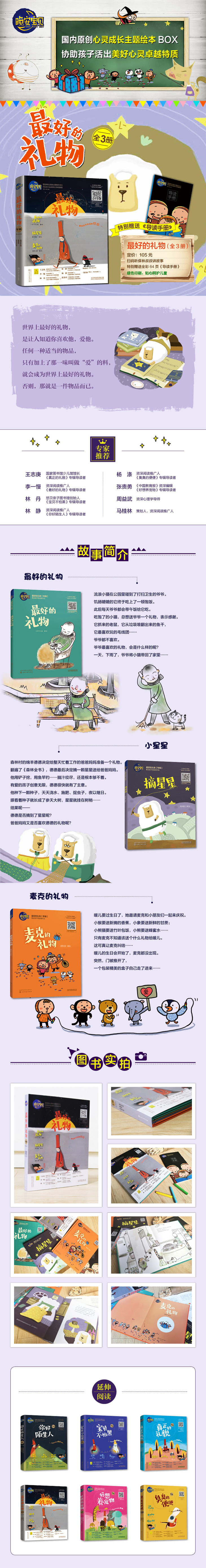 本书由《zui好的礼物》《麦克的礼物》《摘星星》三册组成。《zui好的礼物》:流浪小猫在公园里碰到了打扫卫生的爷爷。饥肠辘辘的它终于吃上了一顿饱饭。此后每天爷爷都会带午饭给它吃。吃饱了的小猫,总想送爷爷一个礼物,表示感谢。它抓来的老鼠,它从垃圾堆翻出来的鱼干,它喜欢玩的毛线团……爷爷都不喜欢。爷爷喜欢的礼物,会是什么样的呢?一天,下雨了,爷爷将小猫带回了家里…… 《麦克的礼物》:暖儿要过生日了,她邀请麦克和小朋友们一起来庆祝。小猴要送新摘的香蕉,小象要送新鲜的甘蔗;小熊猫要送竹叶包饭,小熊要送蜂蜜水……只有麦克不知道该送个什么礼物给暖儿。这可真让麦克纠结……暖儿的生日会开始了,麦克都没出现。突然,门被推开了,一个包装精美的盒子自己走了进来…… 《摘星星》:森林村的绵羊德德决定给整天忙着工作的爸爸妈妈准备一个礼物。翻遍了《森林全书》,德德决定摘一颗星星送给爸爸妈妈。他用铲子挖,用鱼竿钓……脑汁绞尽,还是根本够不着。有爱的孩子创意无限,德德很快就有了主意。他种下一颗种子,天天浇水、施肥、捉虫子,夜以继日。眼看着种子就长成了参天大树,星星就挂在树梢……结果呢——德德是否摘到了星星呢?爸爸妈妈又是否喜欢德德的礼物呢?