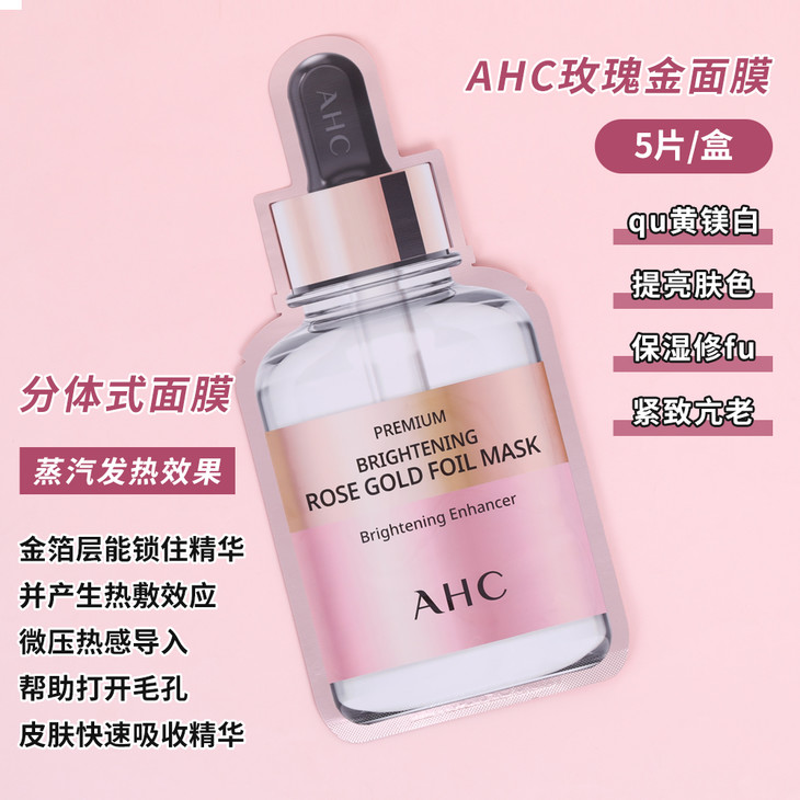 AHC玫瑰金锡纸面膜👍AHC的新品玫瑰金面膜,和它家的黄金面膜一样🌟,都是分体式设计,属于蒸汽发热面膜🌬。这款面膜主打深层补水保湿,提亮抗初老,镇静修护肌肤☑️。精华的量是不用多说了,一往的炒鸡多啊😘,一片等于三片!💦敷完之后就像做了一个美容SPA,皮肤滑滑嫩嫩的。💁特别适合干燥缺水和经常熬夜导致肌肤暗沉的妹子。依旧有温度计,建议冷藏后再使用。