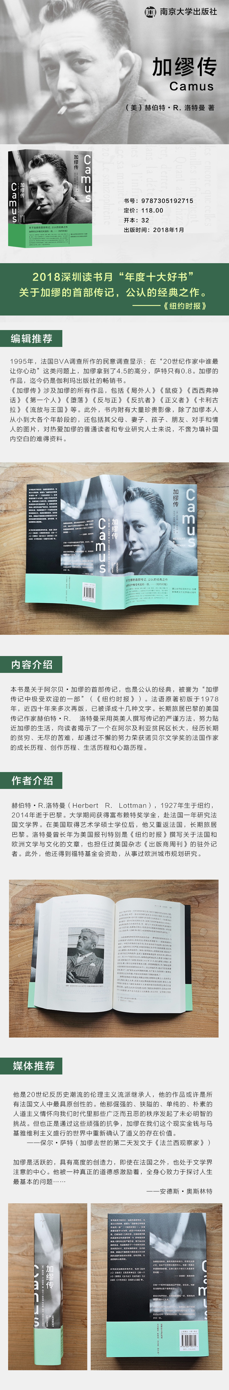 本书是关于阿尔贝·加缪的首部传记,也是公认的经典,被誉为“加缪传记中极受欢迎的一部”(《纽约时报》)。法语原著初版于1978年,近四十年来多次再版,已被译成十几种文字。长期旅居巴黎的美国传记作家赫伯特·R. 洛特曼采用英美人撰写传记的严谨方法,努力贴近加缪的生活,向读者揭示了一个在阿尔及利亚贫民区长大,经历长期的贫穷、无尽的苦难,却通过不懈的努力荣获诺贝尔文学奖的法国作家的成长历程、创作历程、生活历程和心路历程。
