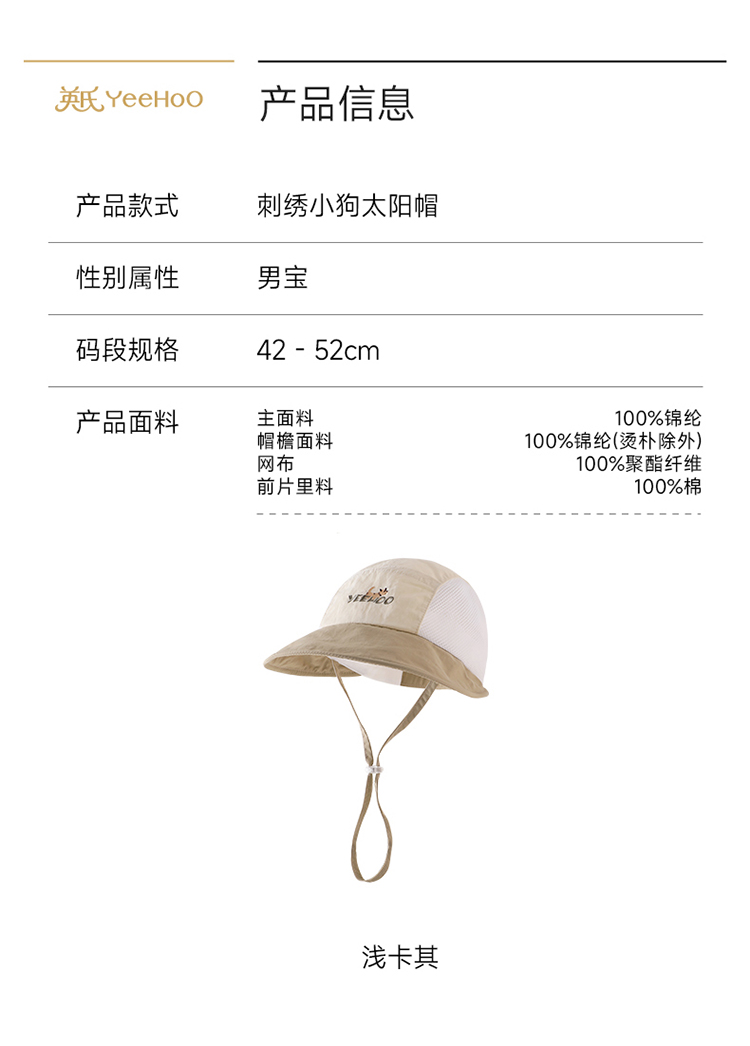 【商场同款】英氏儿童帽子男童夏季防晒太阳帽透气大帽檐遮阳帽子