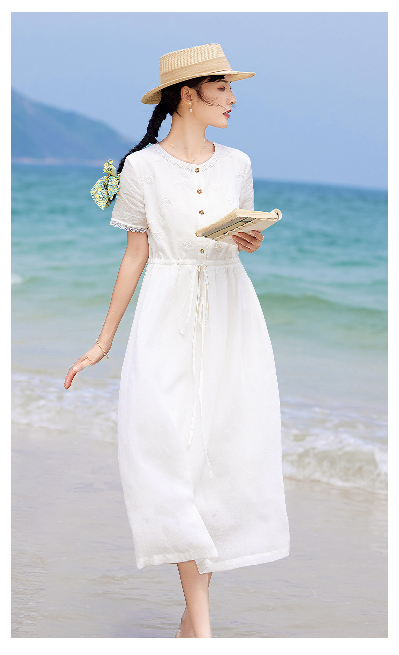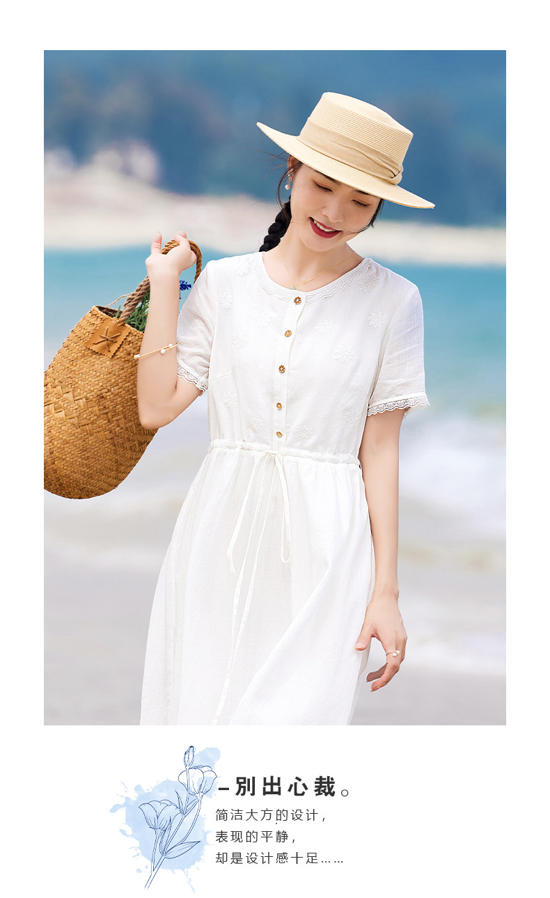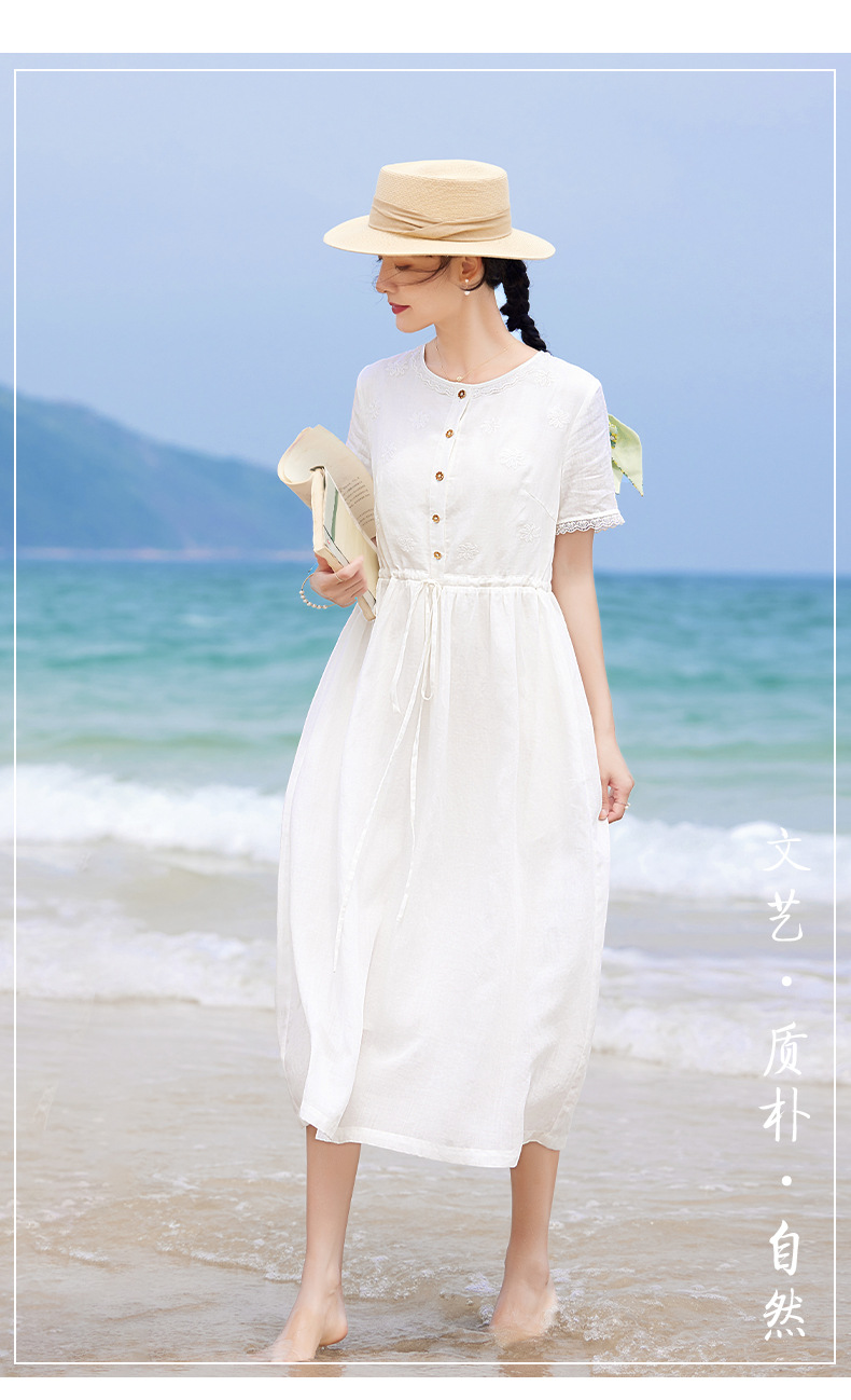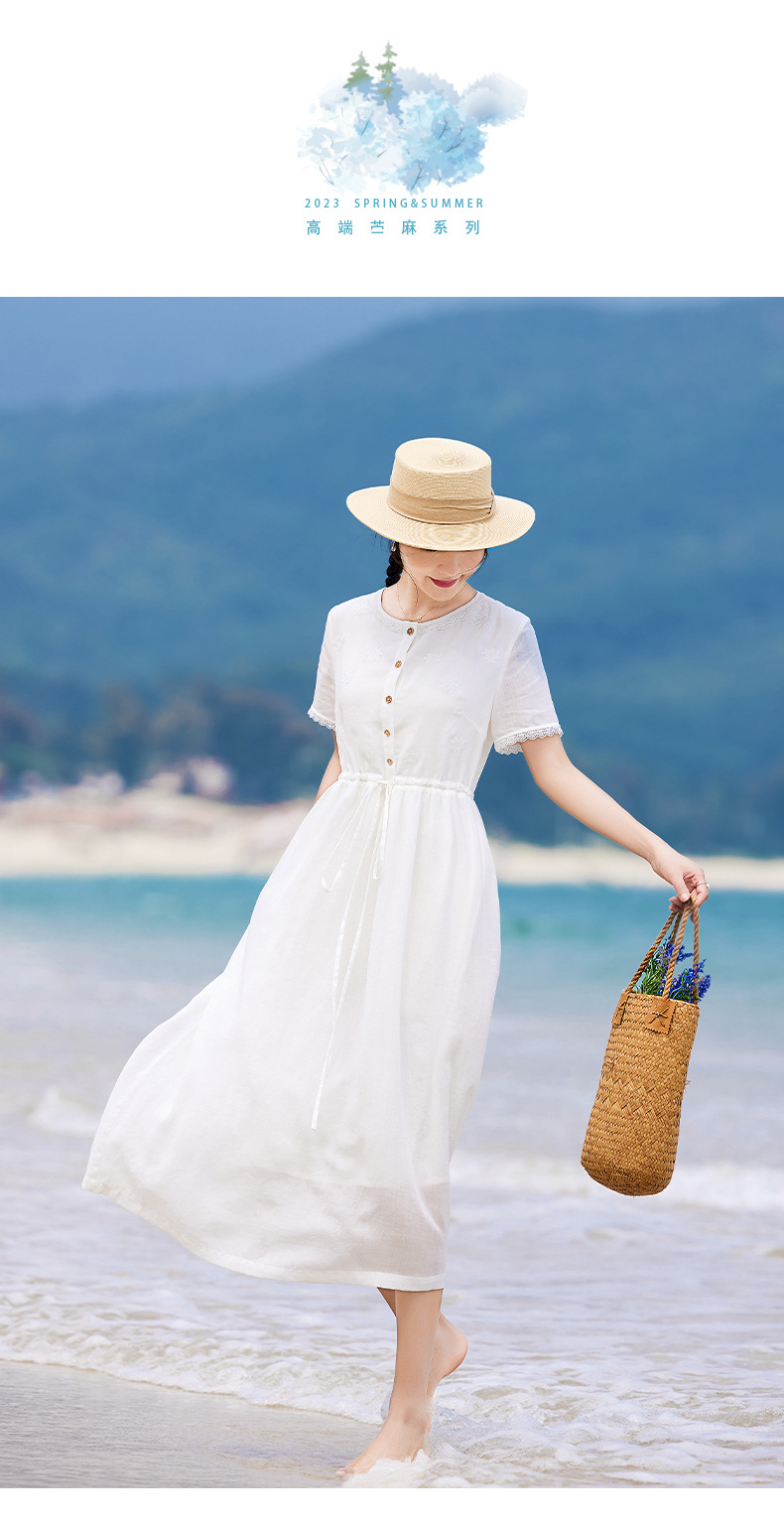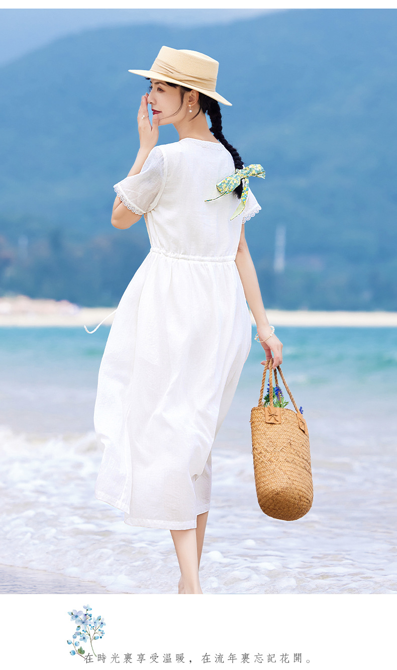 丁摩 白色苎麻法式减龄连衣裙文艺木耳花边短袖飘逸大摆裙