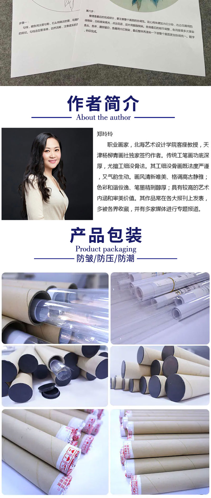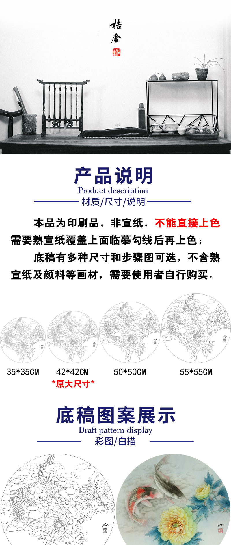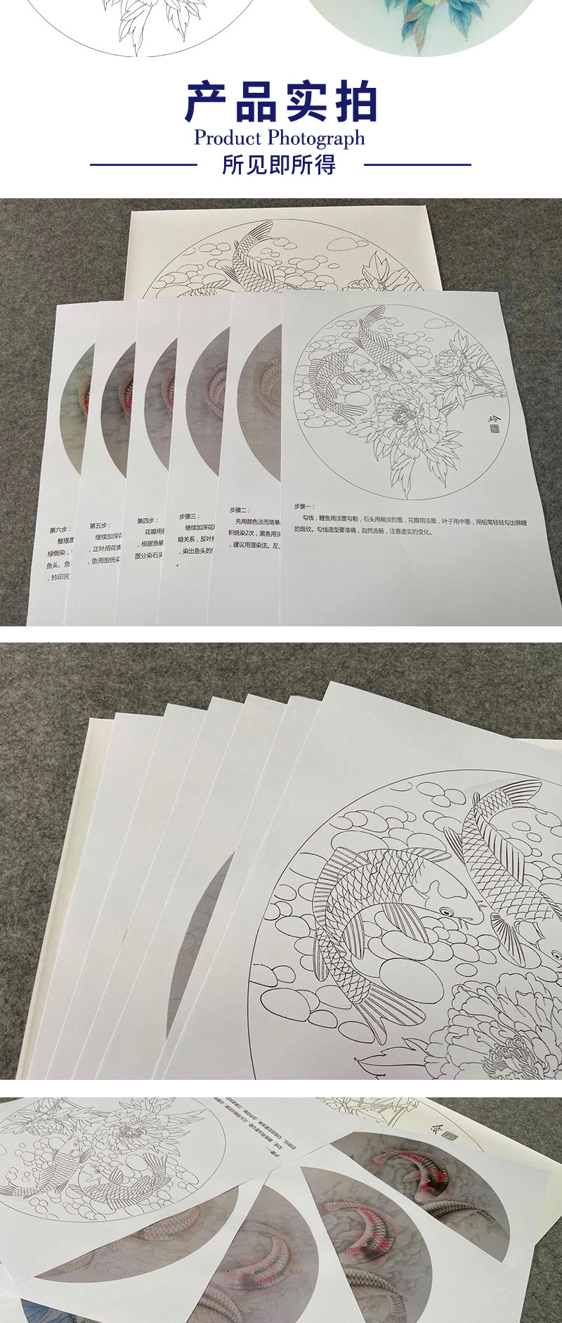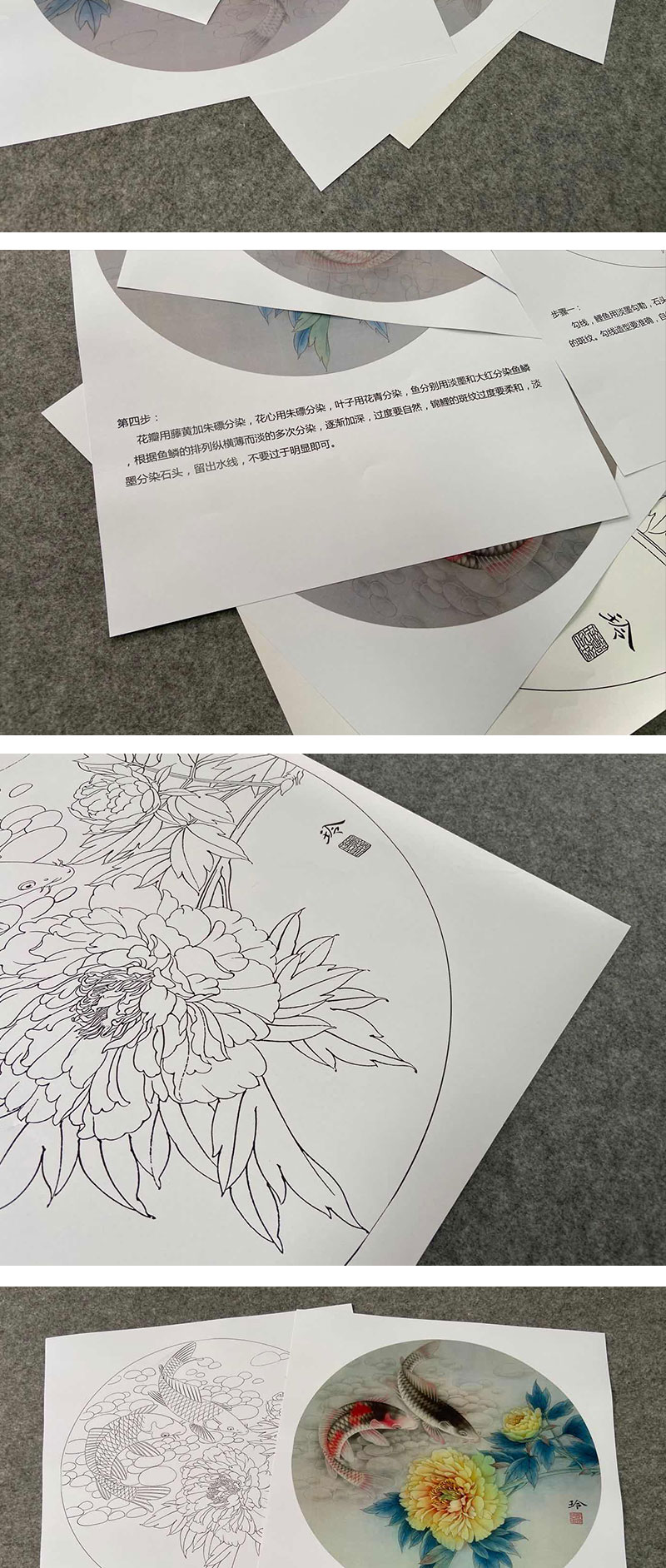 【有步骤、大彩图】郑玲玲工笔画白描底稿圆形小品《清水碧影》牡丹鲤鱼初学者临摹花鸟线稿ZL22