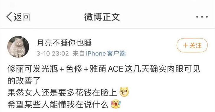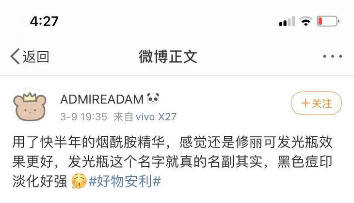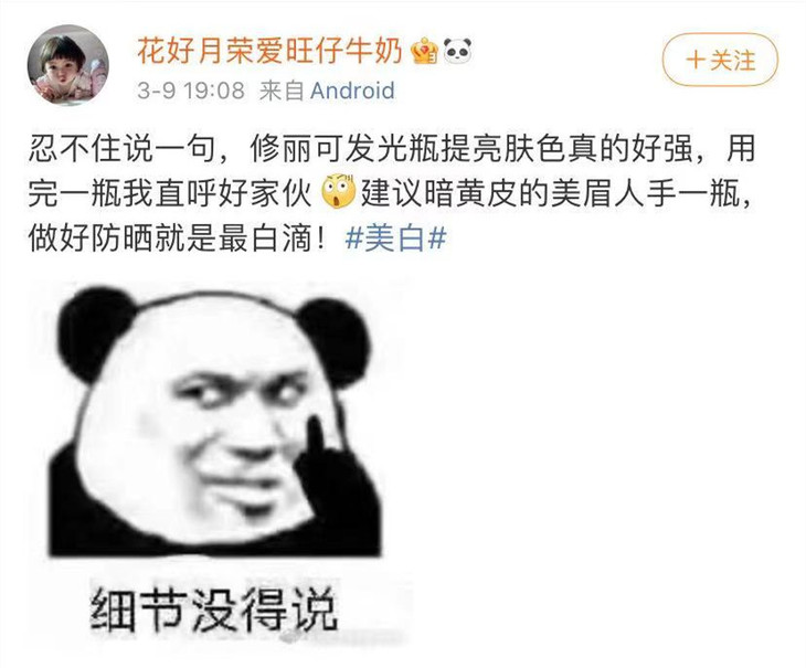 它可以很好的改善我肤色不均、蜡黄暗沉的状况,对新生的斑点和痘印也有很好的淡化效果。希望大家在接下来的秋冬中可以慢慢变白~成为人群中的发光小仙女~