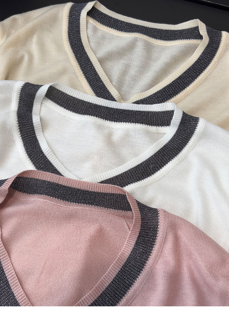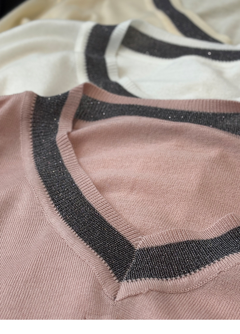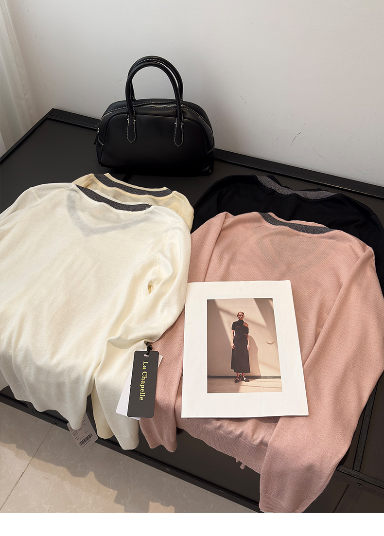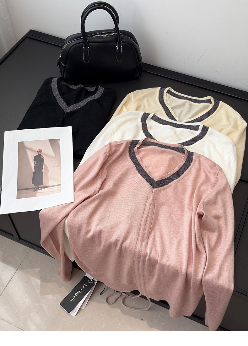 专柜实拍【绵羊毛/高质感】拉夏贝尔/La Chapelle设计感抽绳系带针织衫女秋季新款撞色V领长袖上衣