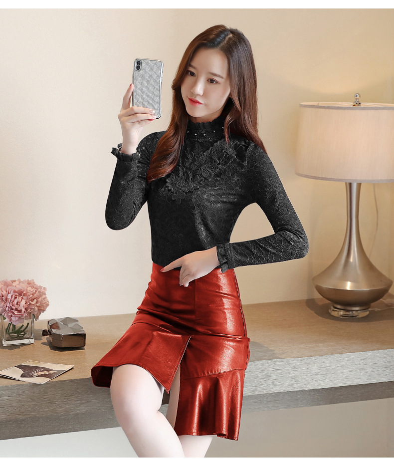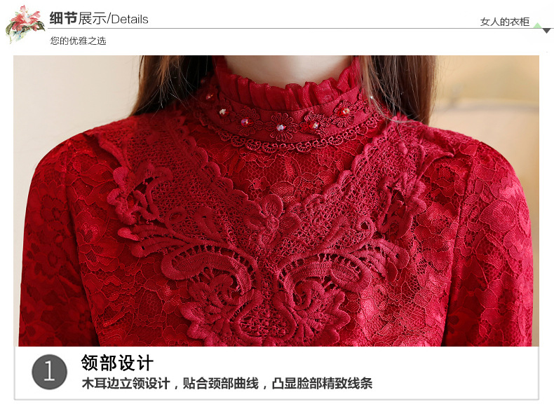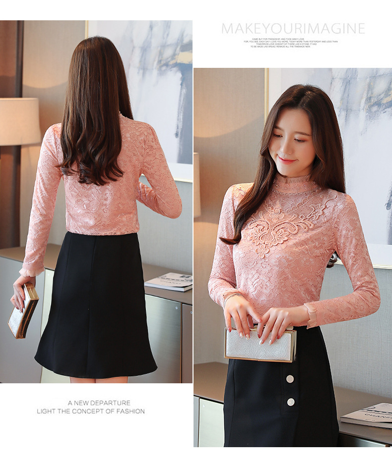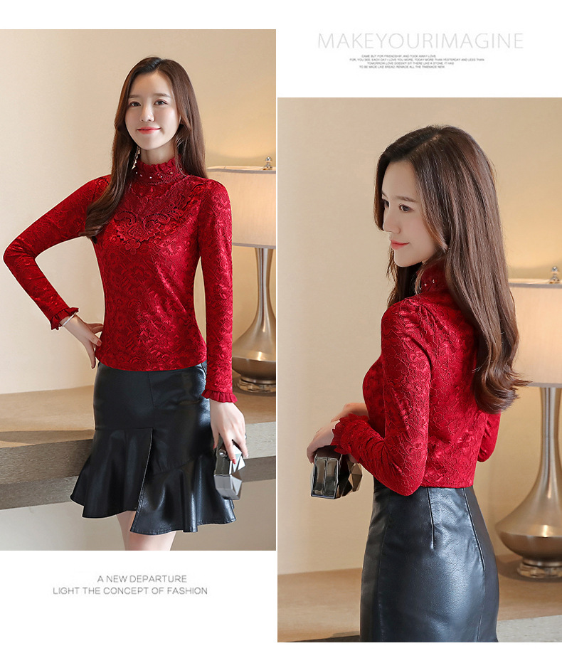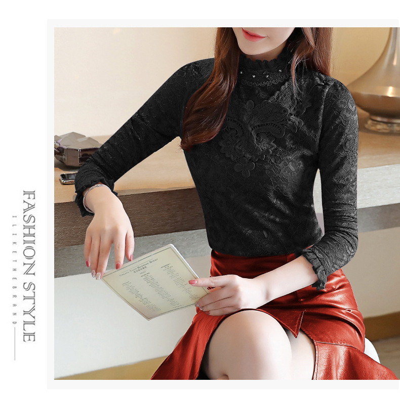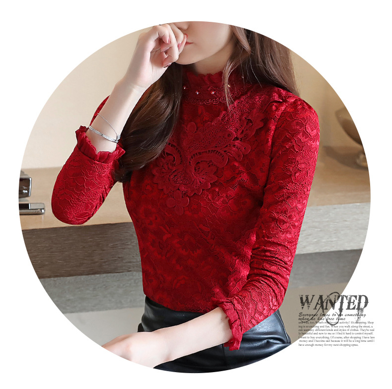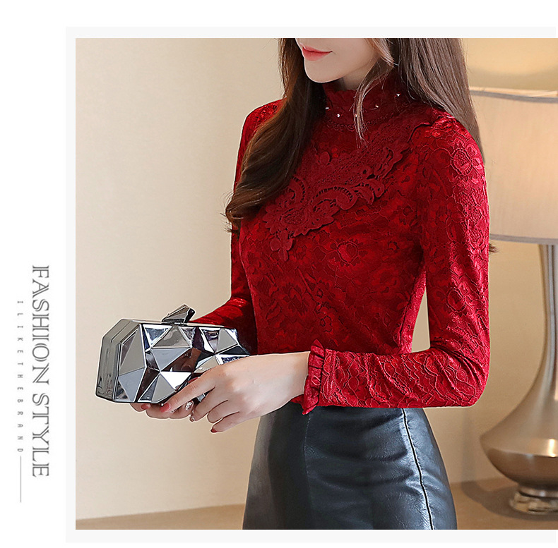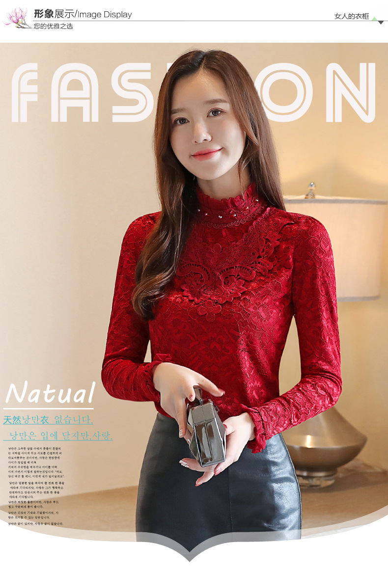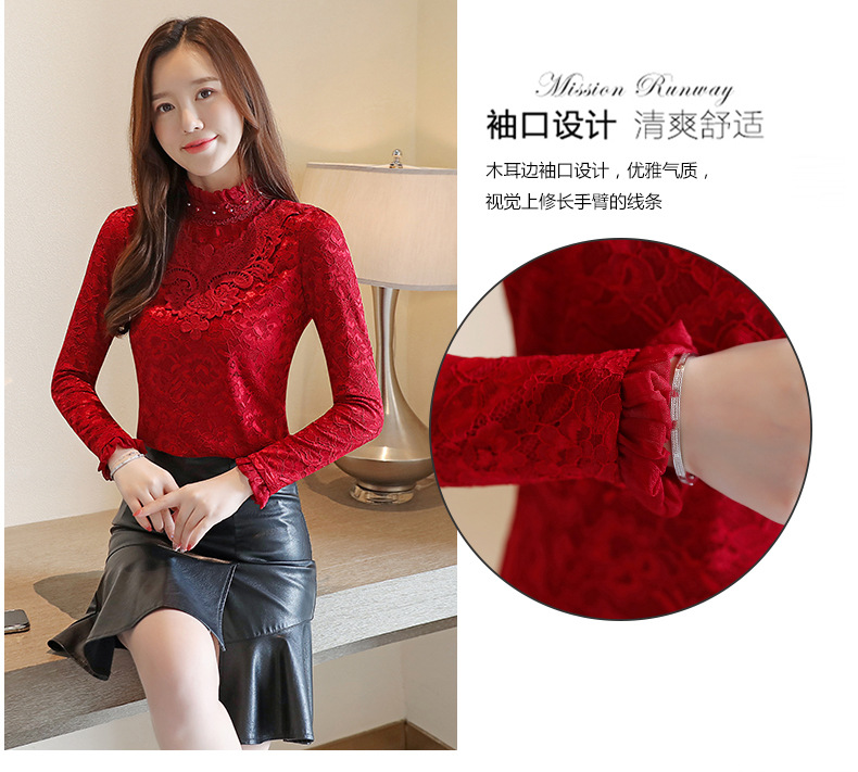 加绒加厚,蕾丝长袖打底衫韩版修身钉珠立领上衣AYL-8057