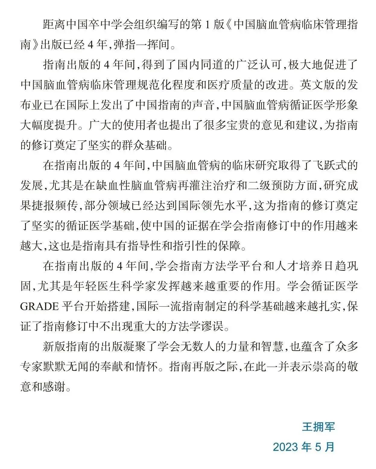 2019年中国卒中学会组织编写出版了第1版《中国脑血管病临床管理指南》,得到广泛关注和好评,为了保持内容与最新的临床证据及脑血管病领域的最佳干预管理手段相一致,以确保指南的时效性和先进性,中国卒中学会组织国内约100家医院100余名专家对本临床管理指南进行修订。指南涵盖脑血管病预防、诊疗、康复、组织化管理和卒中医疗质量控制等全方位临床管理内容,供从事卒中防治、护理、康复的相关专业人员使用,也为相关卫生行政部门提供指导意见。指南将对中国脑血管病的临床规范、医疗质量管理起到积极的推动作用,使中国的脑血管病患者享受到国际标准的医疗服务。