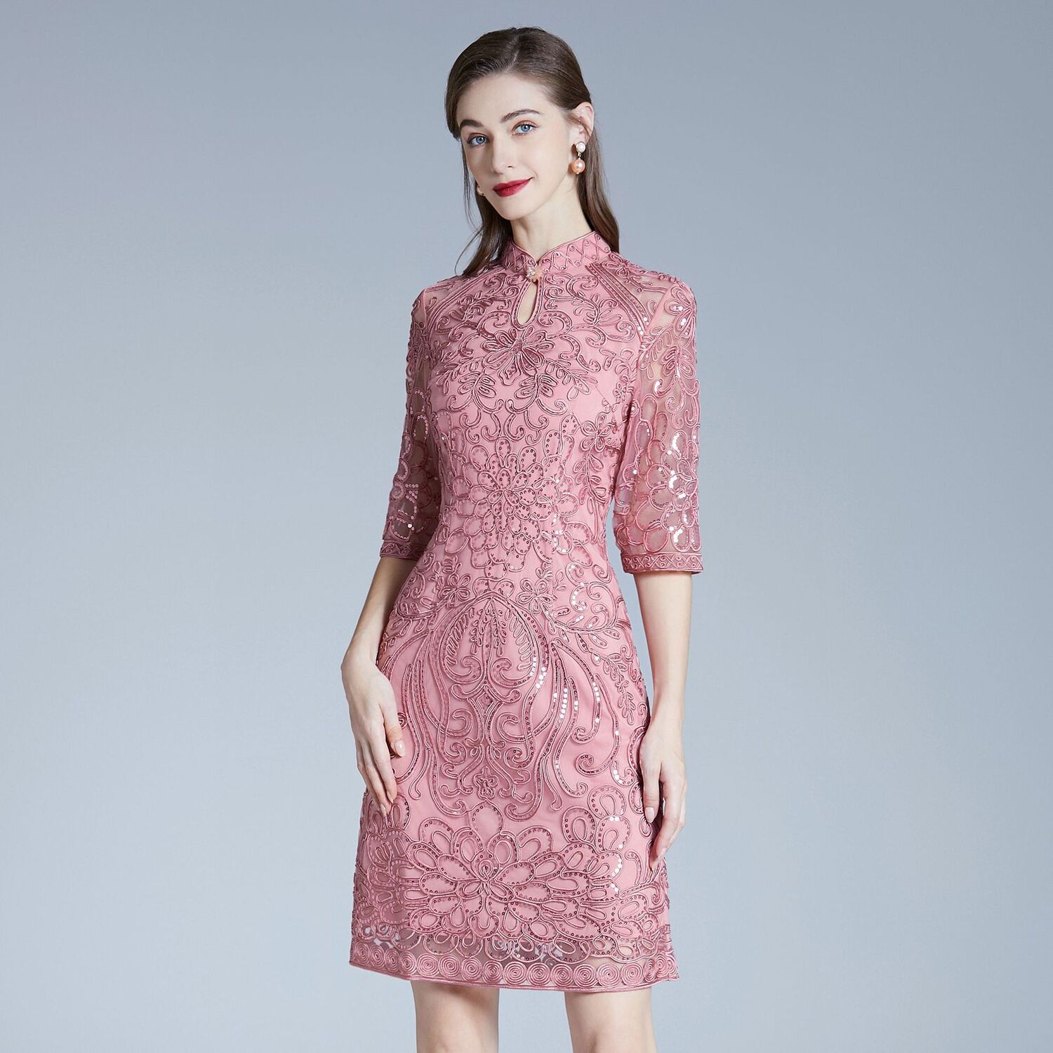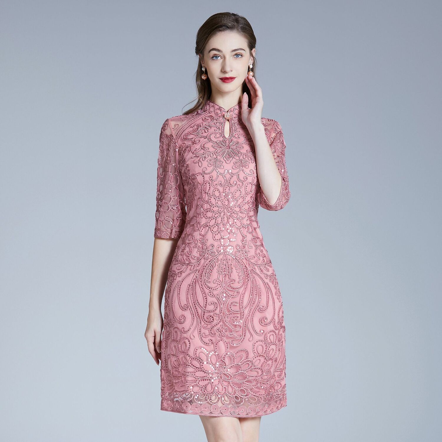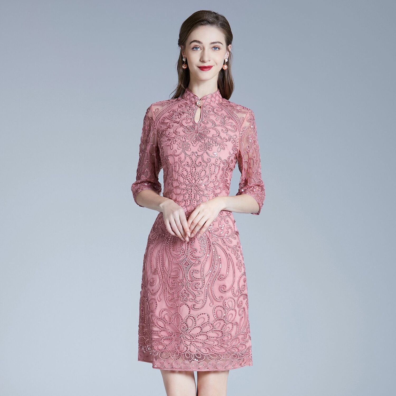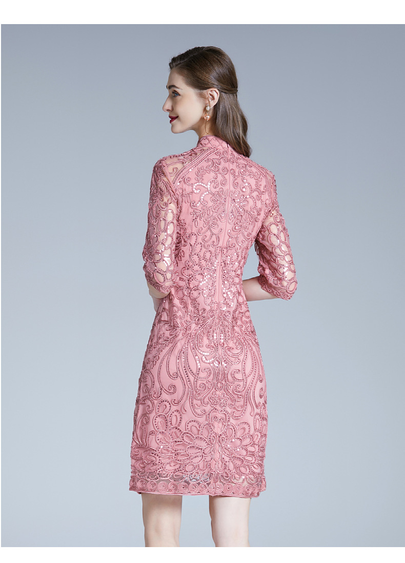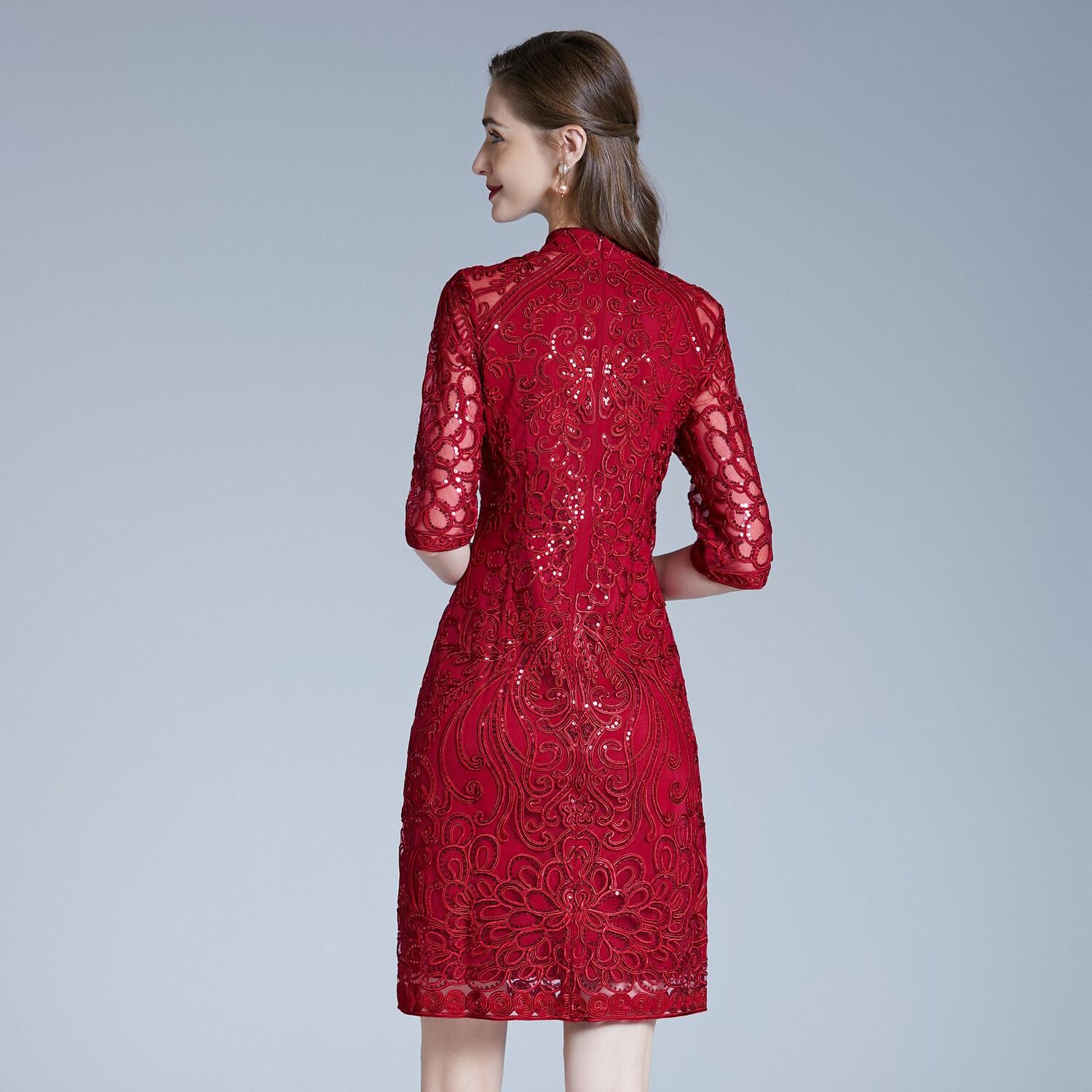DNO-2IA8634-1网纱礼服婚宴红色小个婆婆大码连衣裙