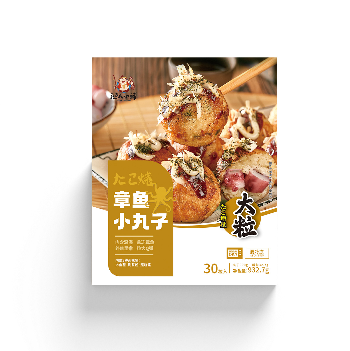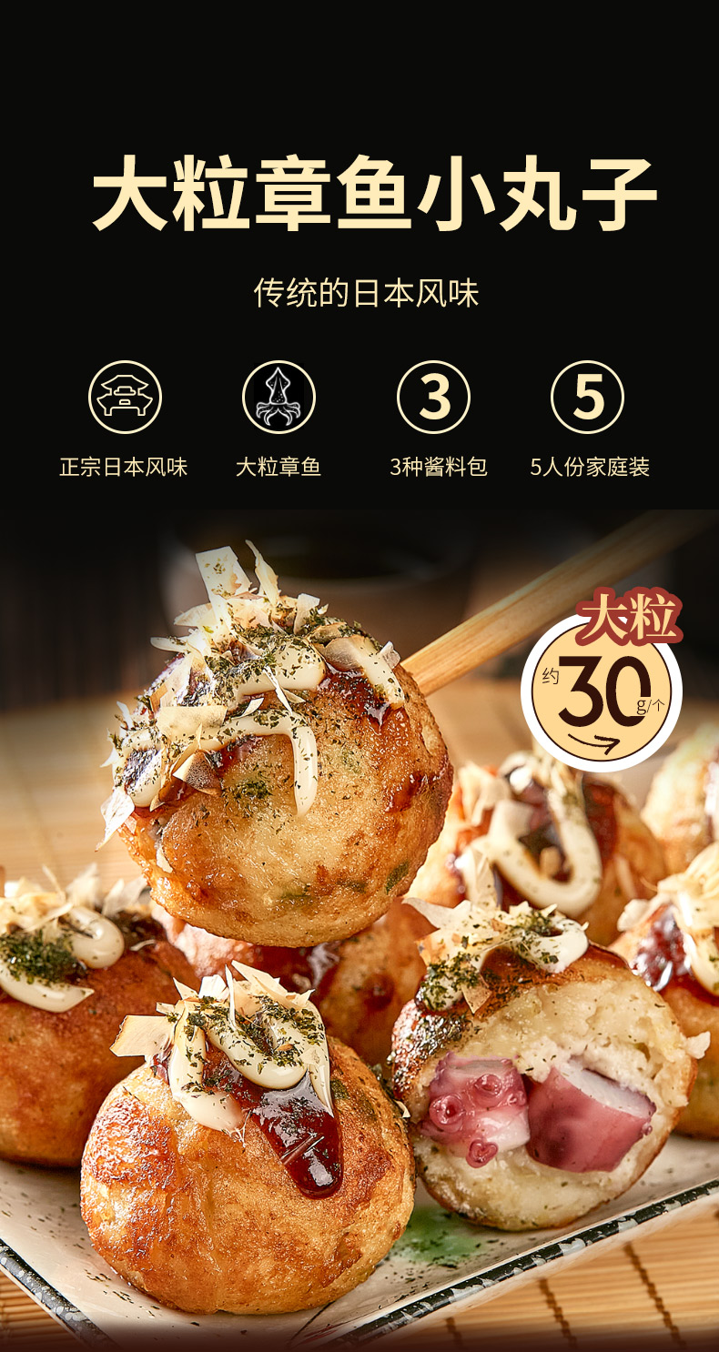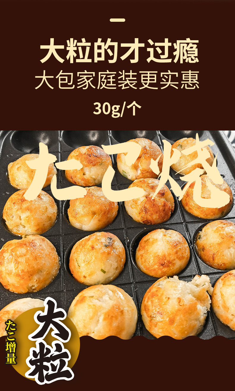 约30g/个的章鱼小丸子每颗里都有一块大大的章鱼肉。原材料采用黄海野生章鱼,章鱼粒超高占比,吃得出的新鲜,Q弹有嚼劲!让一颗小丸子的口感变得更丰富。
