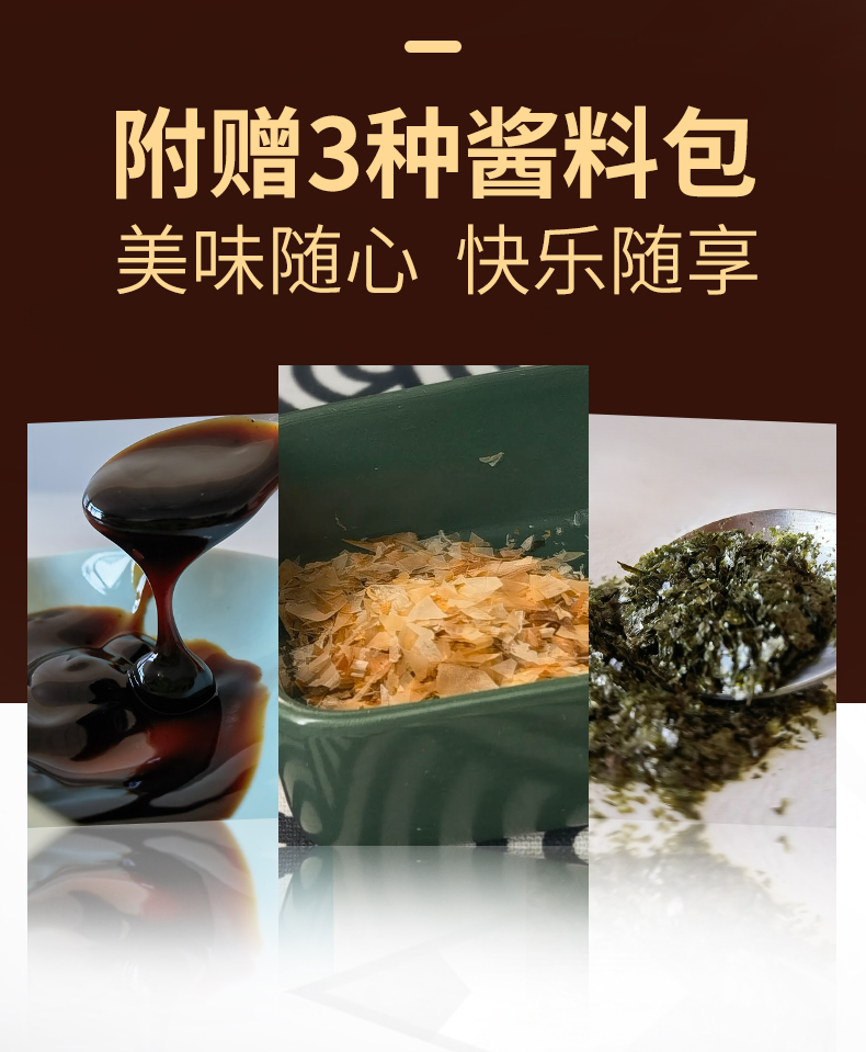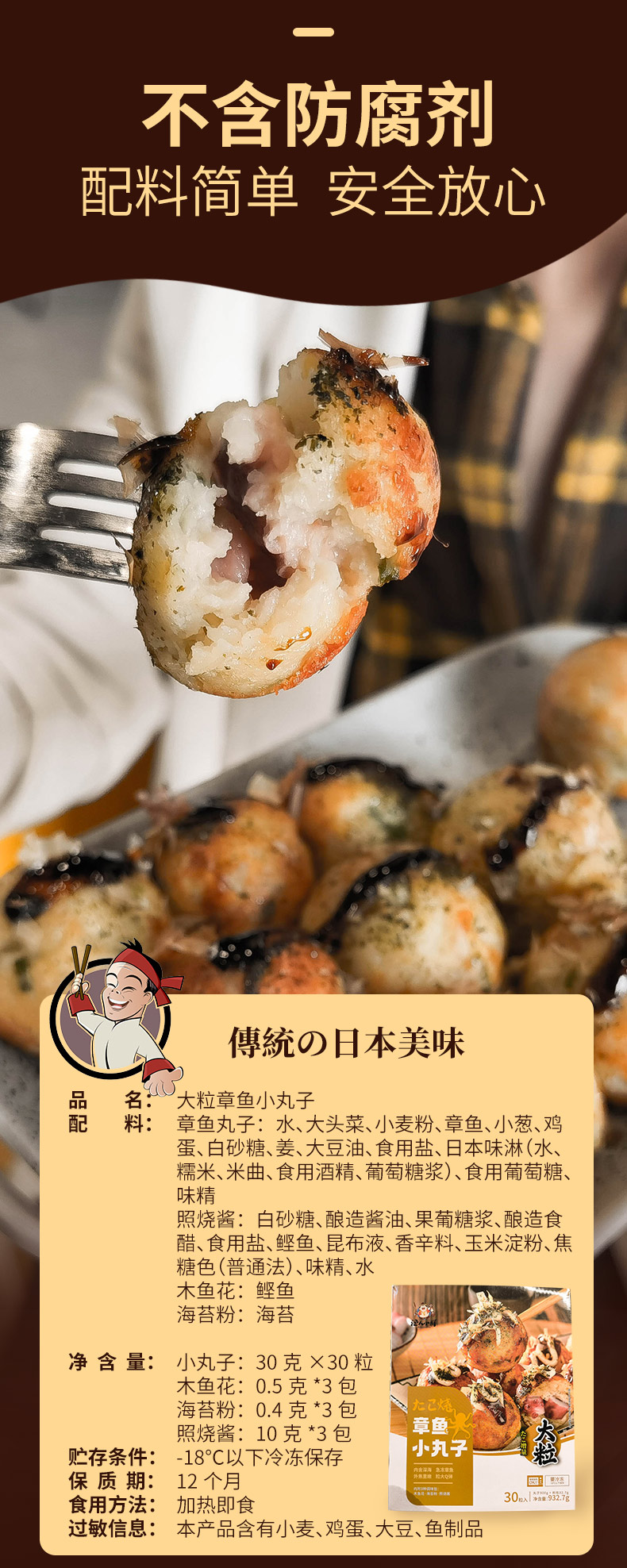 【配料】:水、大头菜、小麦粉、章鱼、小葱、鸡蛋、白砂糖、姜、大豆油、食用盐、日本味淋、食用葡萄糖、味精
