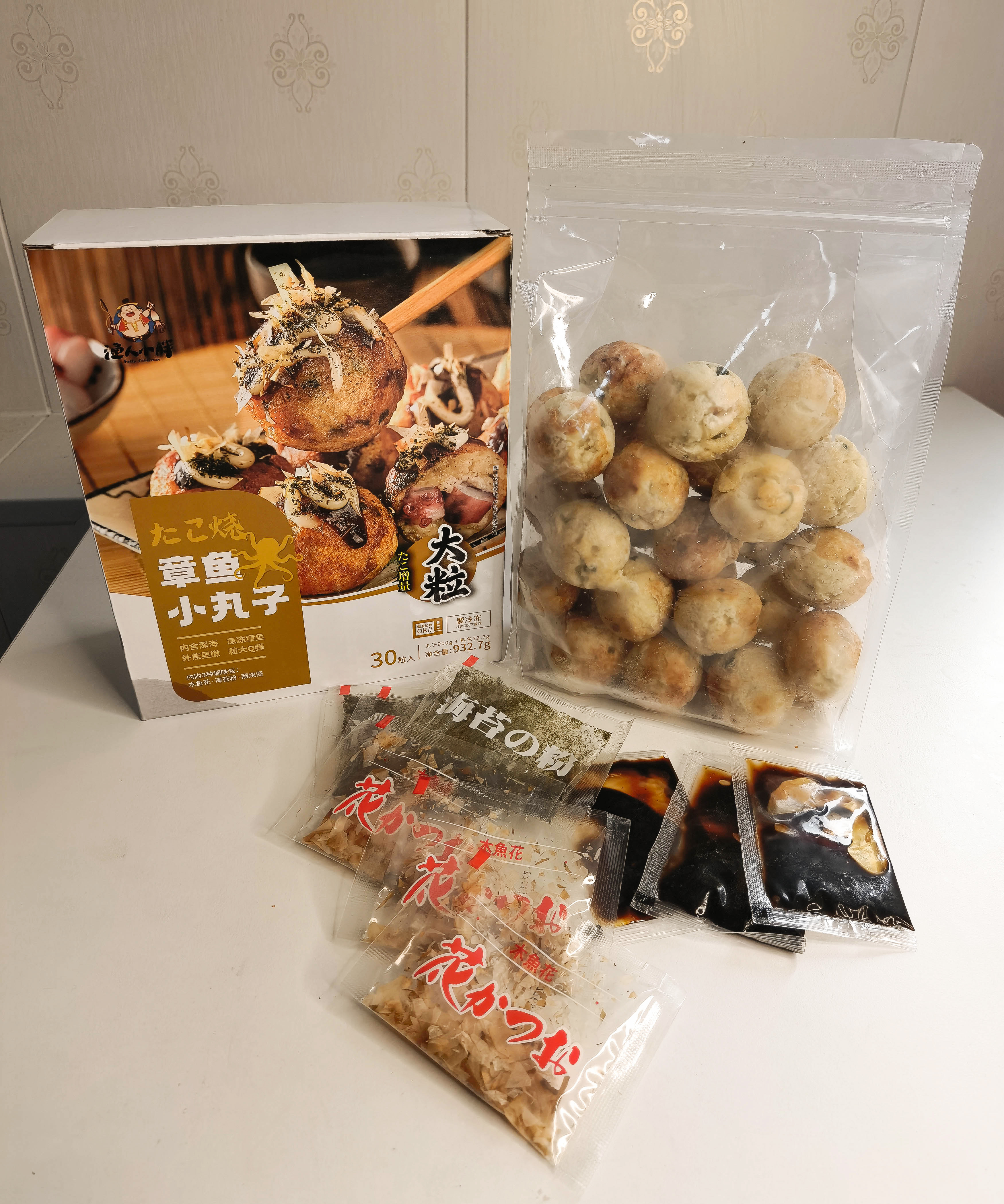 2.小丸子30g一个,章鱼和大头菜配以小葱提香,附赠照烧酱、海苔粉、木鱼花,个大料足 一口爆浆.