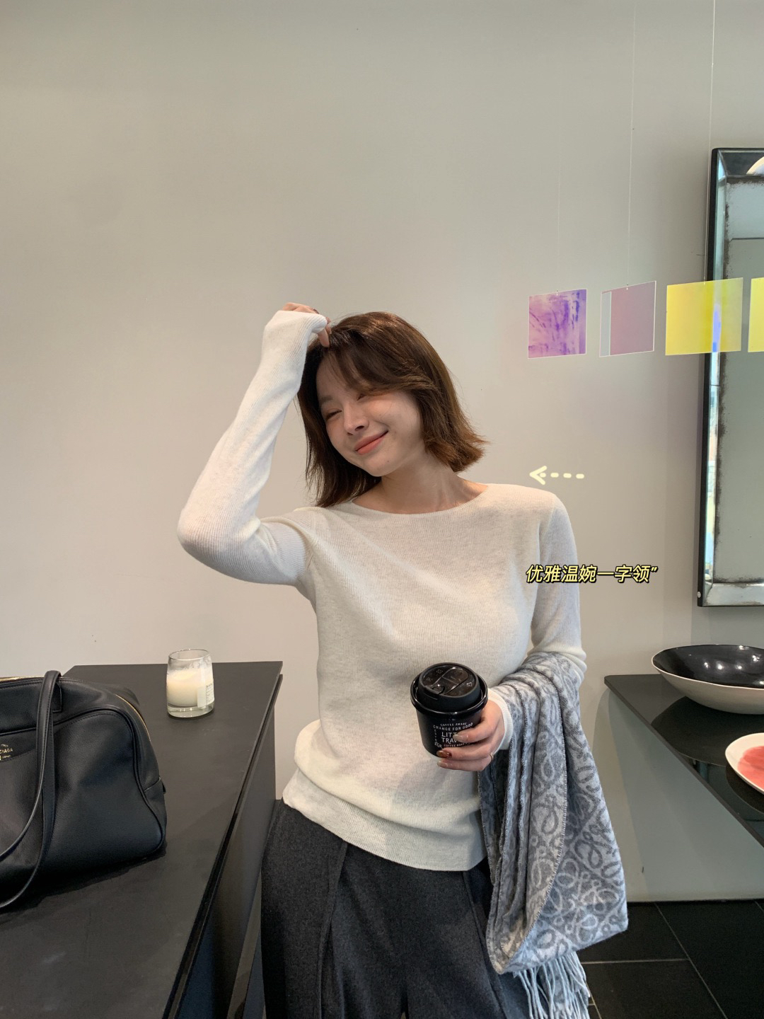 内搭在里面就是圆领的感觉 脱下衣服 很好看有气质的一字领