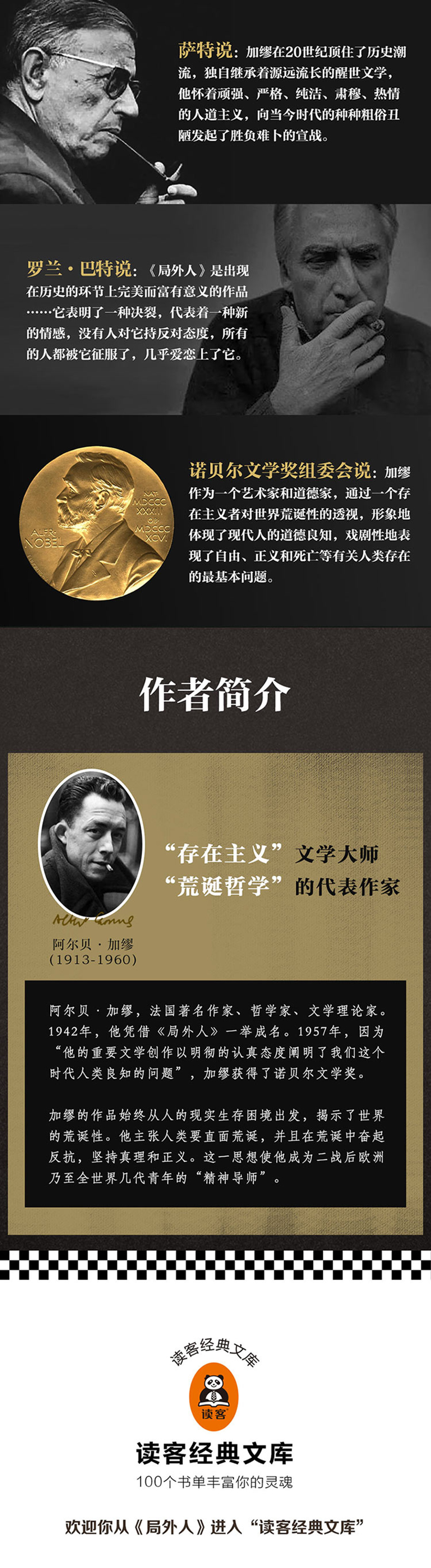 ◆他(加缪)作为一个艺术家和道德家,通过一个存在主义者对世界荒诞性的透视,形象地体现了现代人的道德良知,戏剧性地表现了自由、正义和死亡等有关人类存在的基本的问题。——1957年诺贝尔文学奖的颁奖词