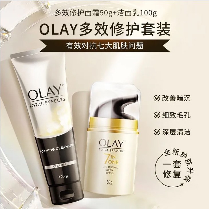 👑OLAY七重功效修护霜套装 👍新升级:有效对抗“七大”肌肤问题 💡面霜:保湿滋润、改善暗沉、淡化细纹、紧致毛孔、细致毛孔、减少色斑、亮肤嫩白 😍洗面奶:低泡配方、清洁彩妆残留、调节水油平衡、改善肌肤光泽 💦一套修护,肌肤问题迎刃而解! 【套盒包括】:面霜50g+洗面奶100ml