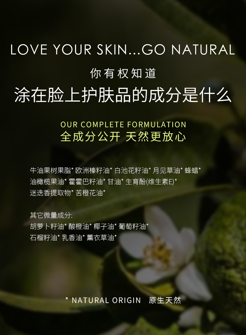 成分:牛油果树果脂油、椰子油、白池花籽油、月见草油、葡萄籽油、石榴籽油、霍霍巴籽油、蜂蜡、苦橙花提取物、乳香油、胡萝卜籽油、薰衣草油、生育酚(维生素E)、迷迭香叶油。