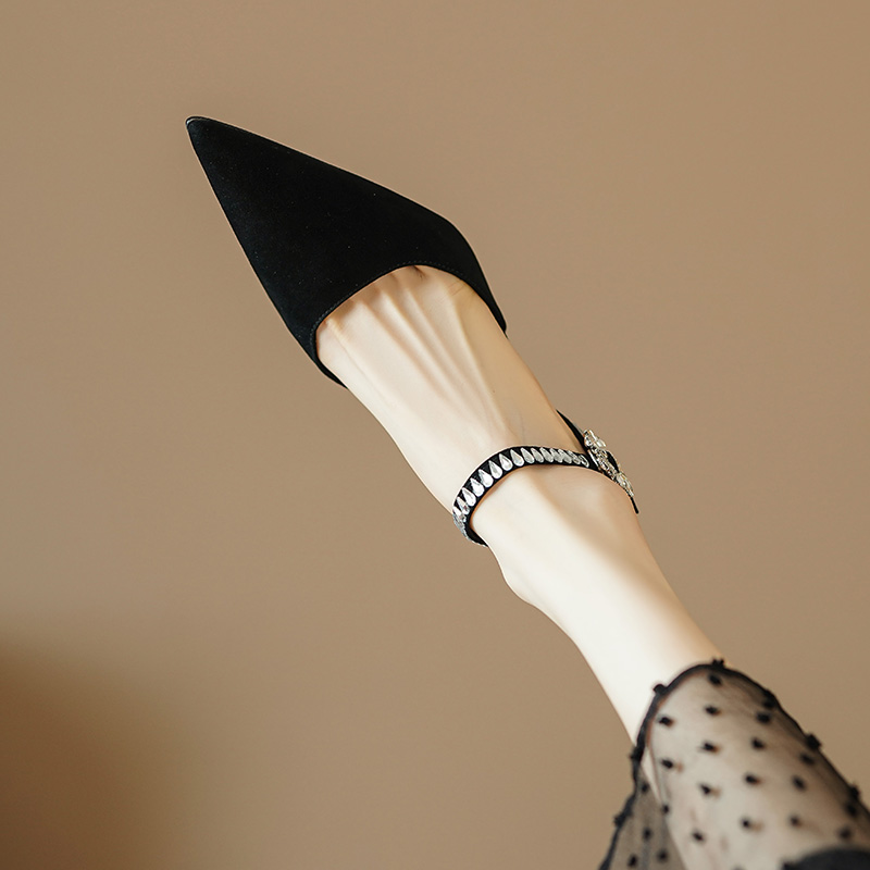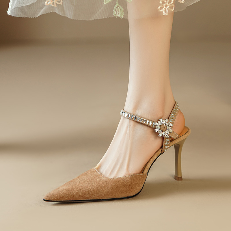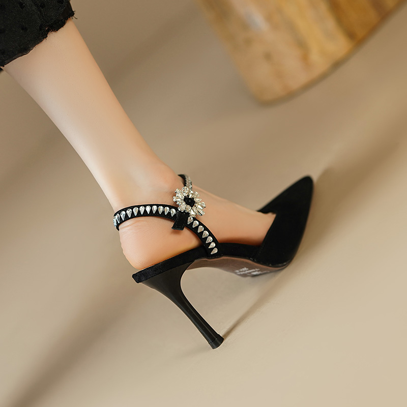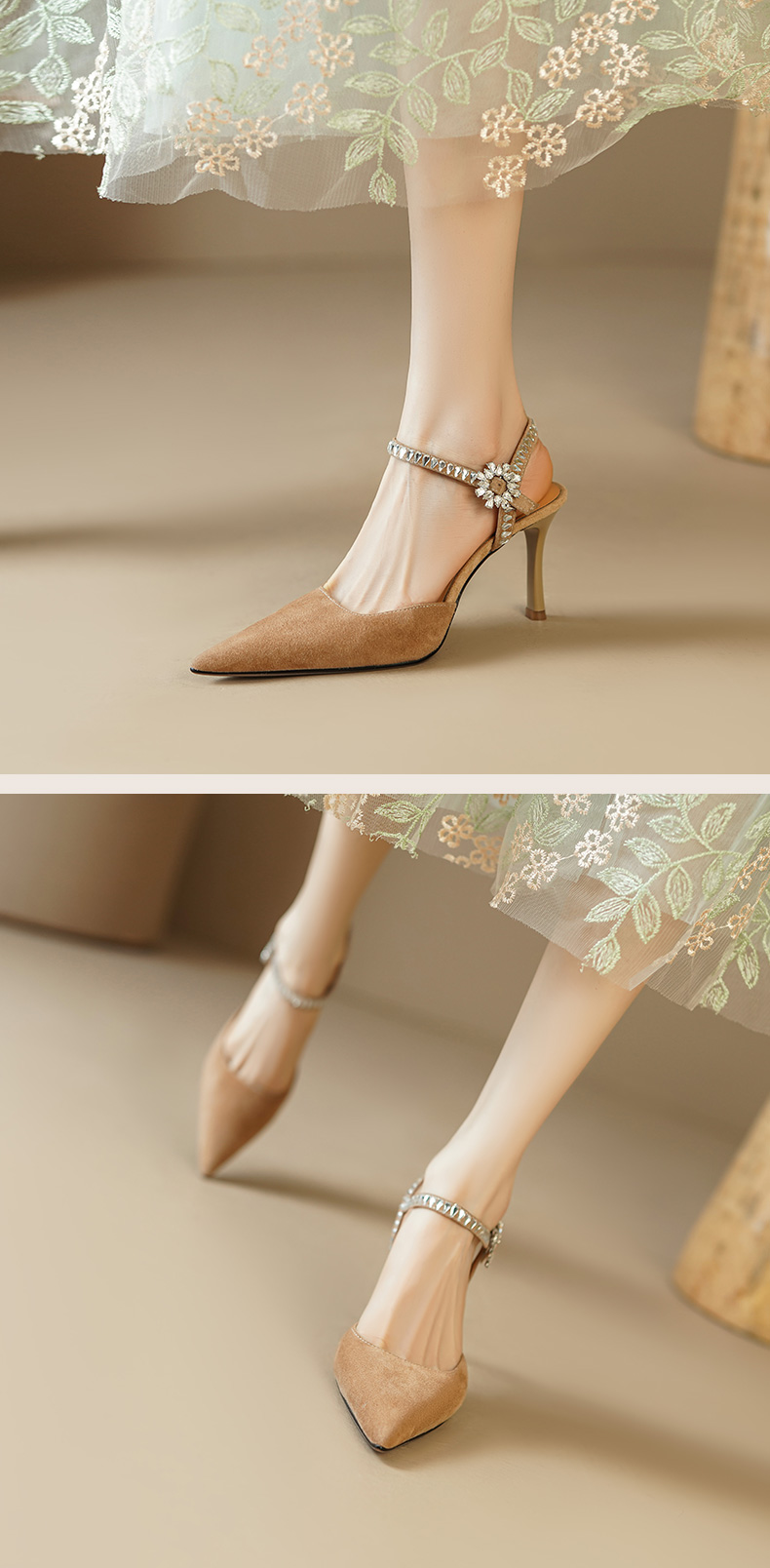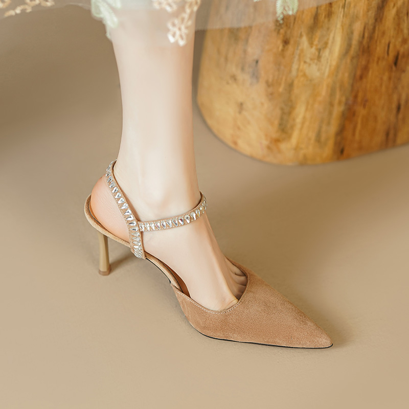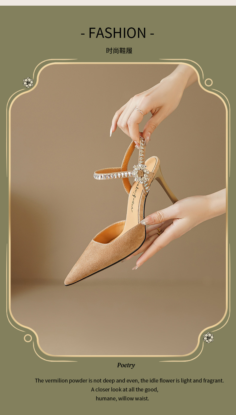 【预售5天】羊翻皮包头后空凉鞋女夏季新款女鞋欧美尖头水钻一字扣高跟鞋FDJ&YC--088