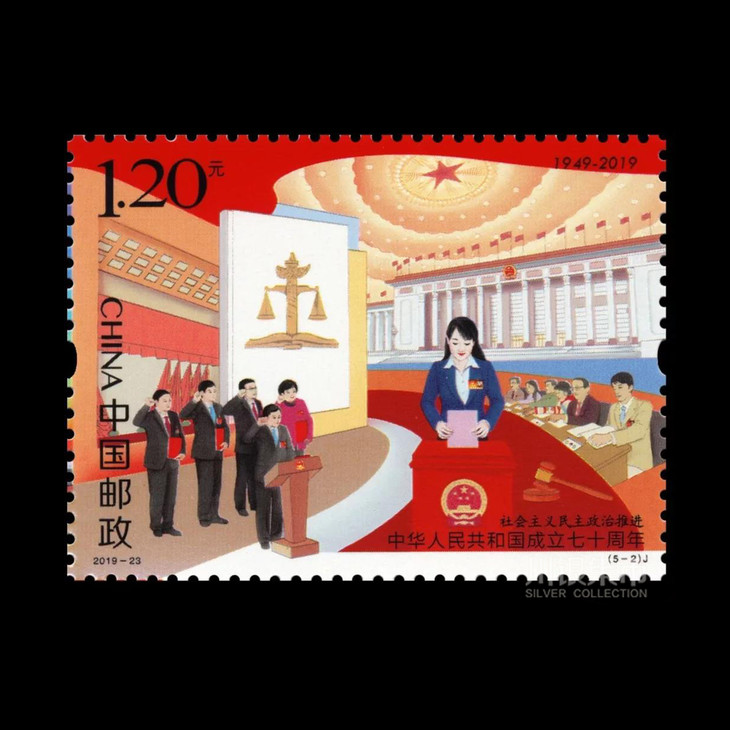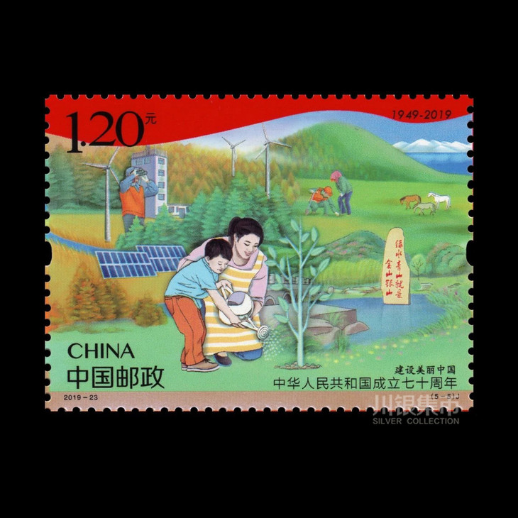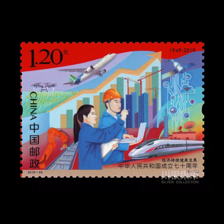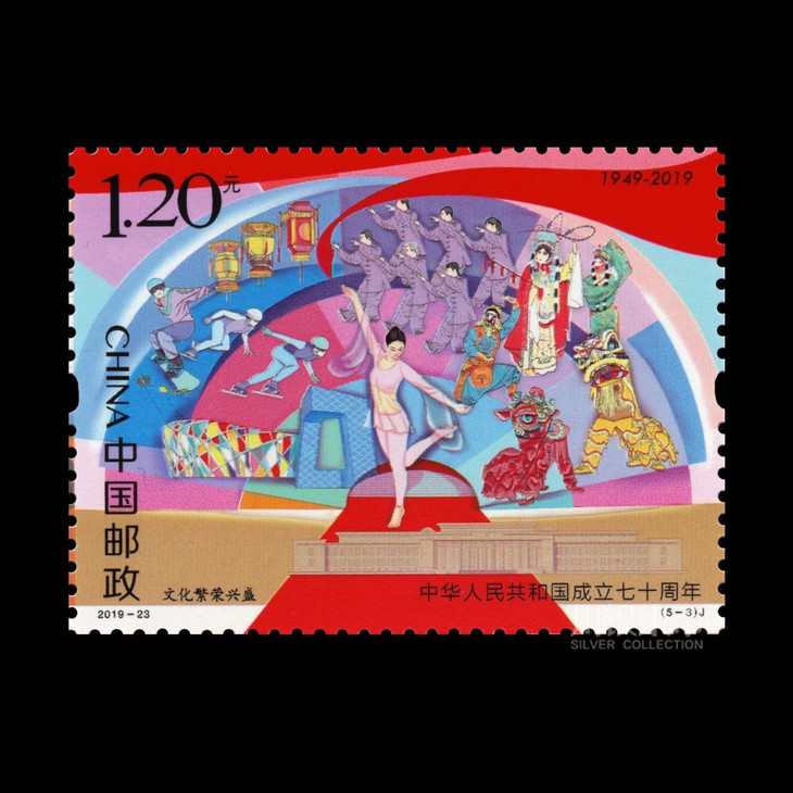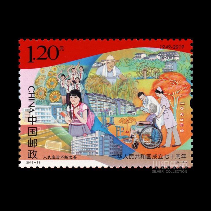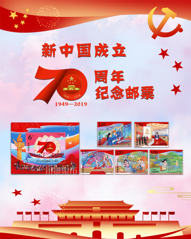 中国邮政定于2019年10月1日发行《中华人民共和国成立七十周年》纪念邮票1套5枚,小型张1枚。