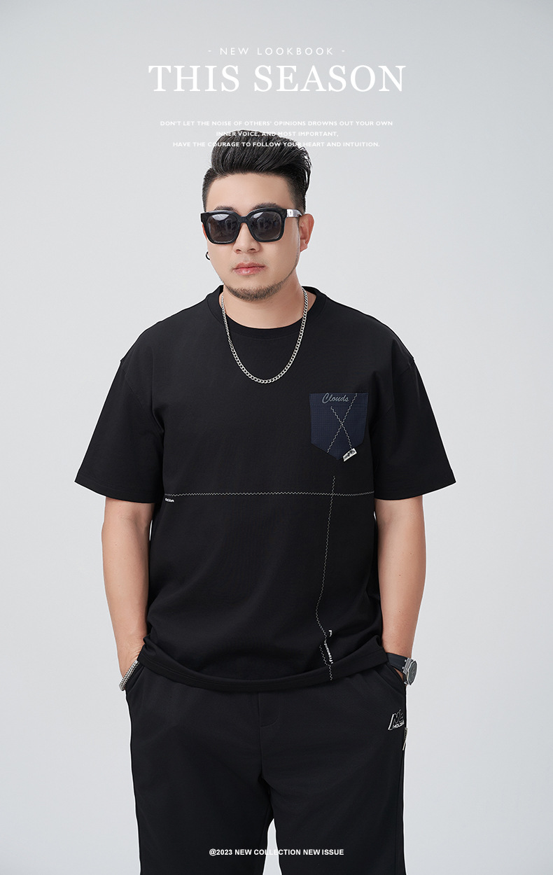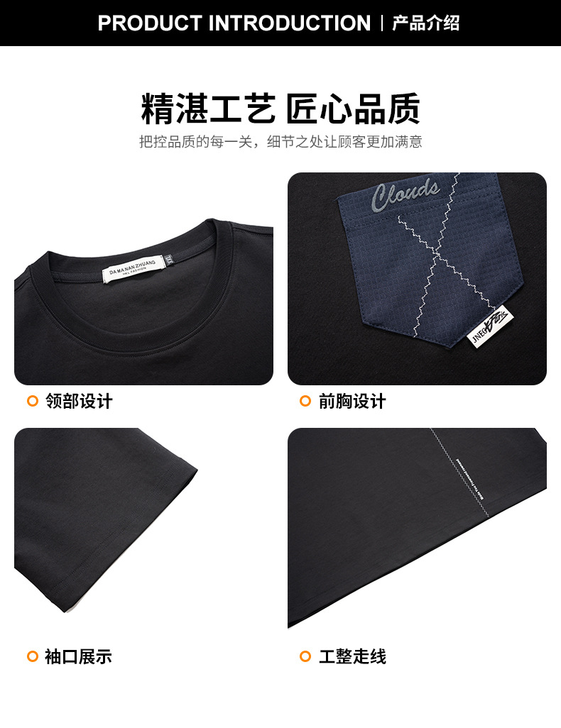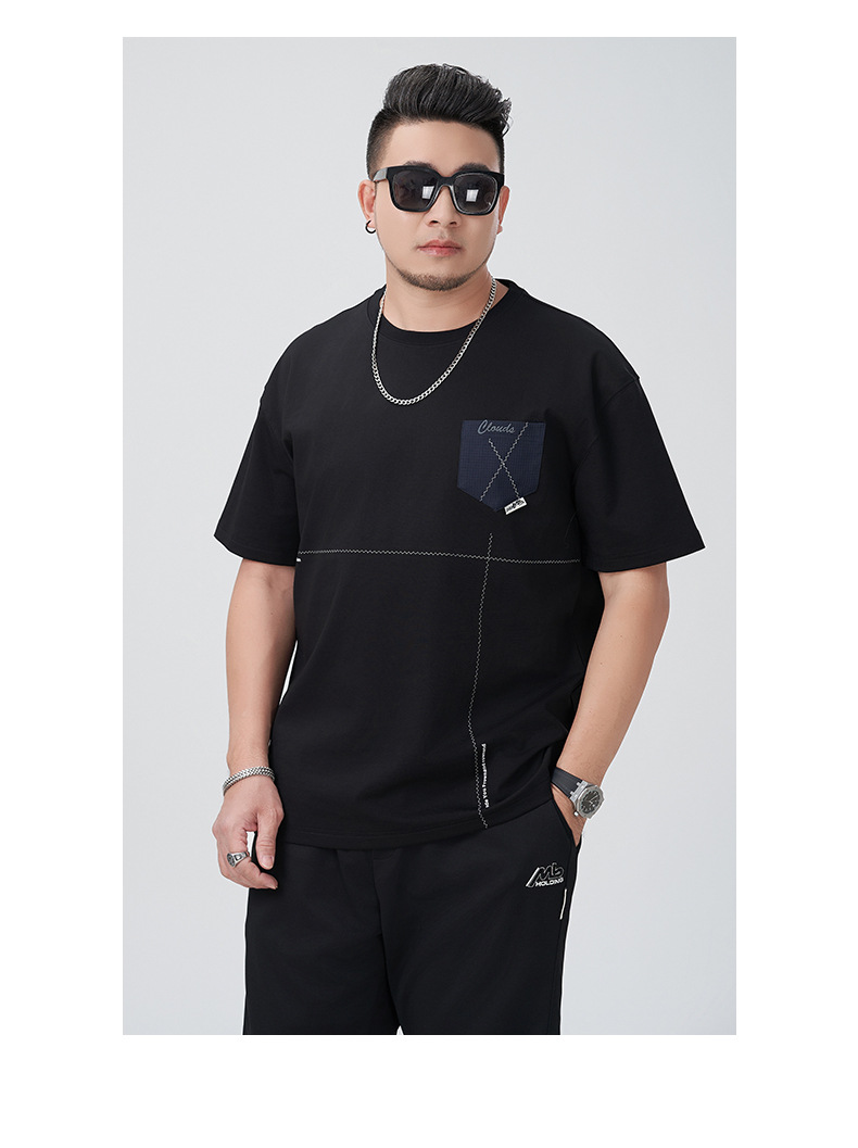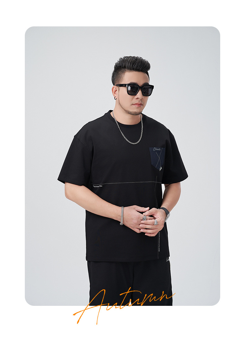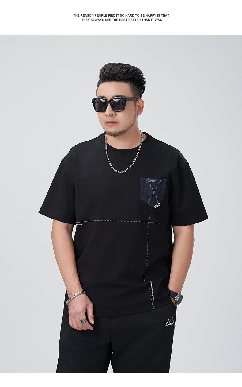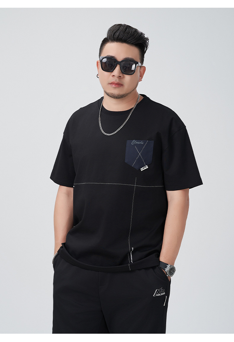 【DMH】大依优型大码印花短袖T恤落肩袖贴布口袋宽松半袖男装夏季新款上衣男士