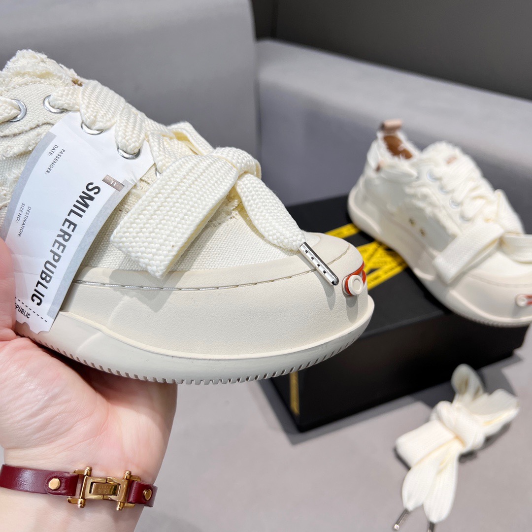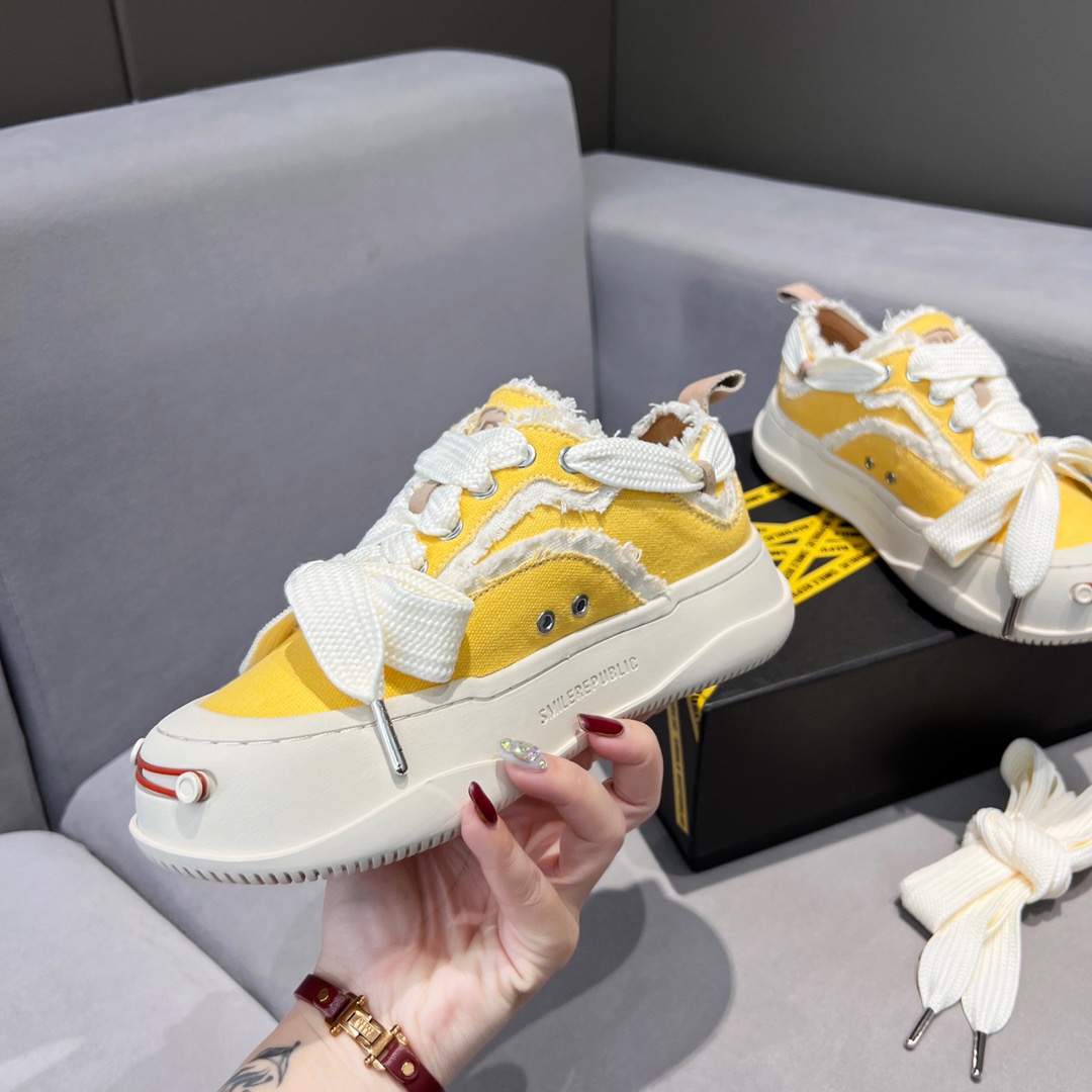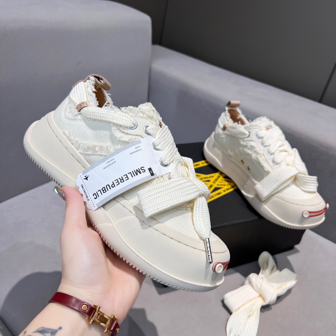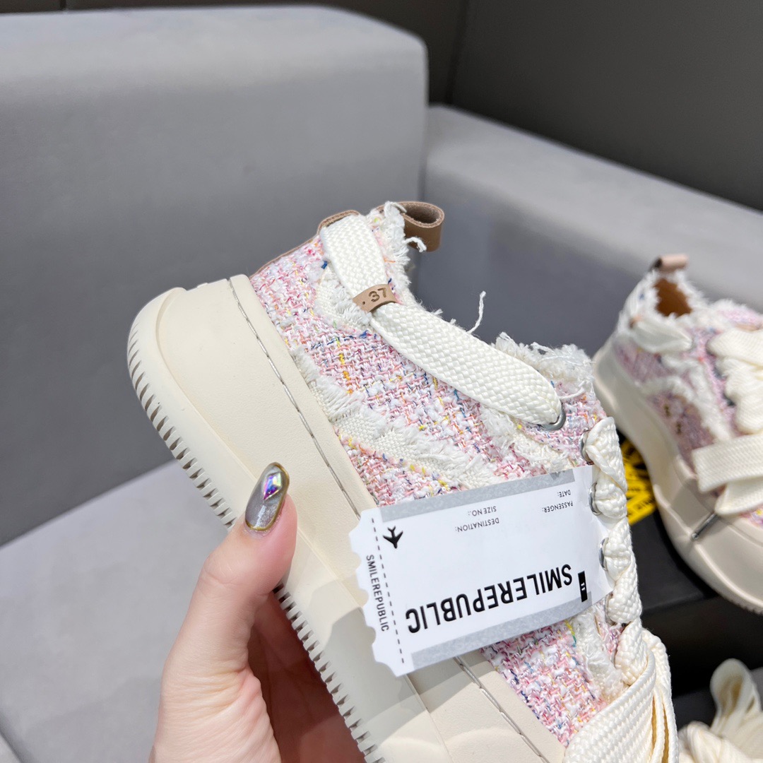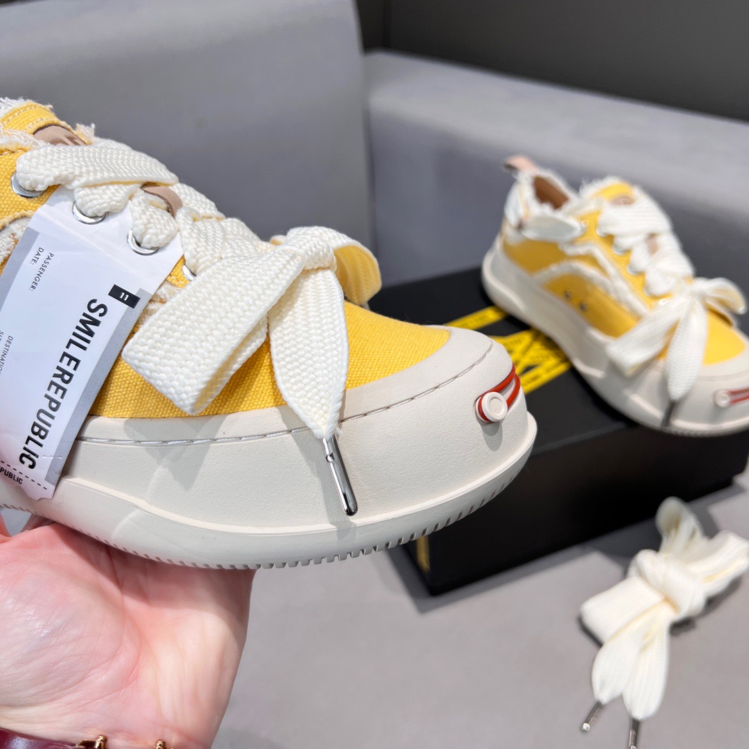 圆润的低帮厚底帆布鞋型,前端做了小凹槽+橡皮筋点缀修饰,呈现“开口笑”的设计!