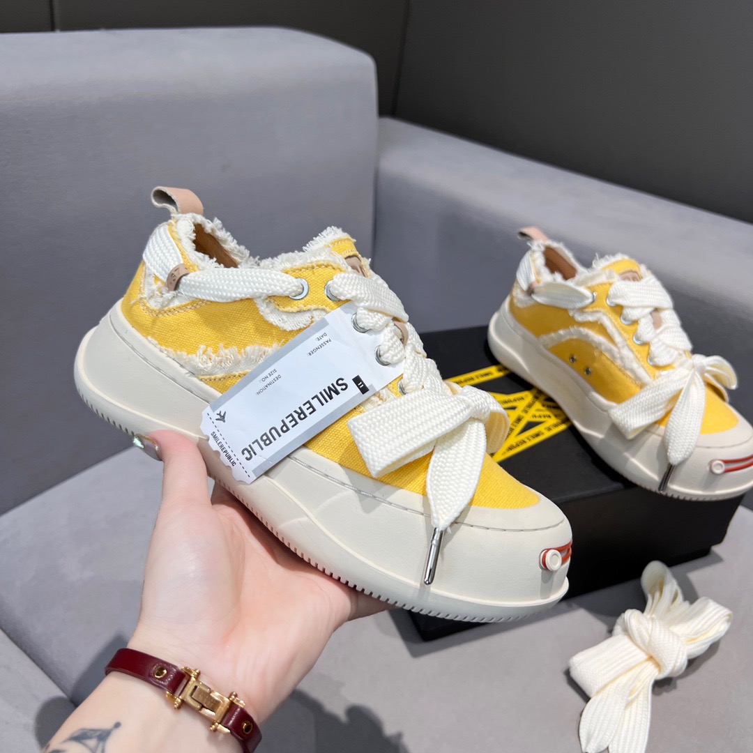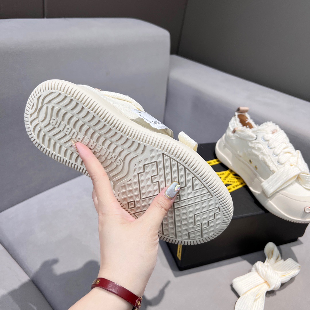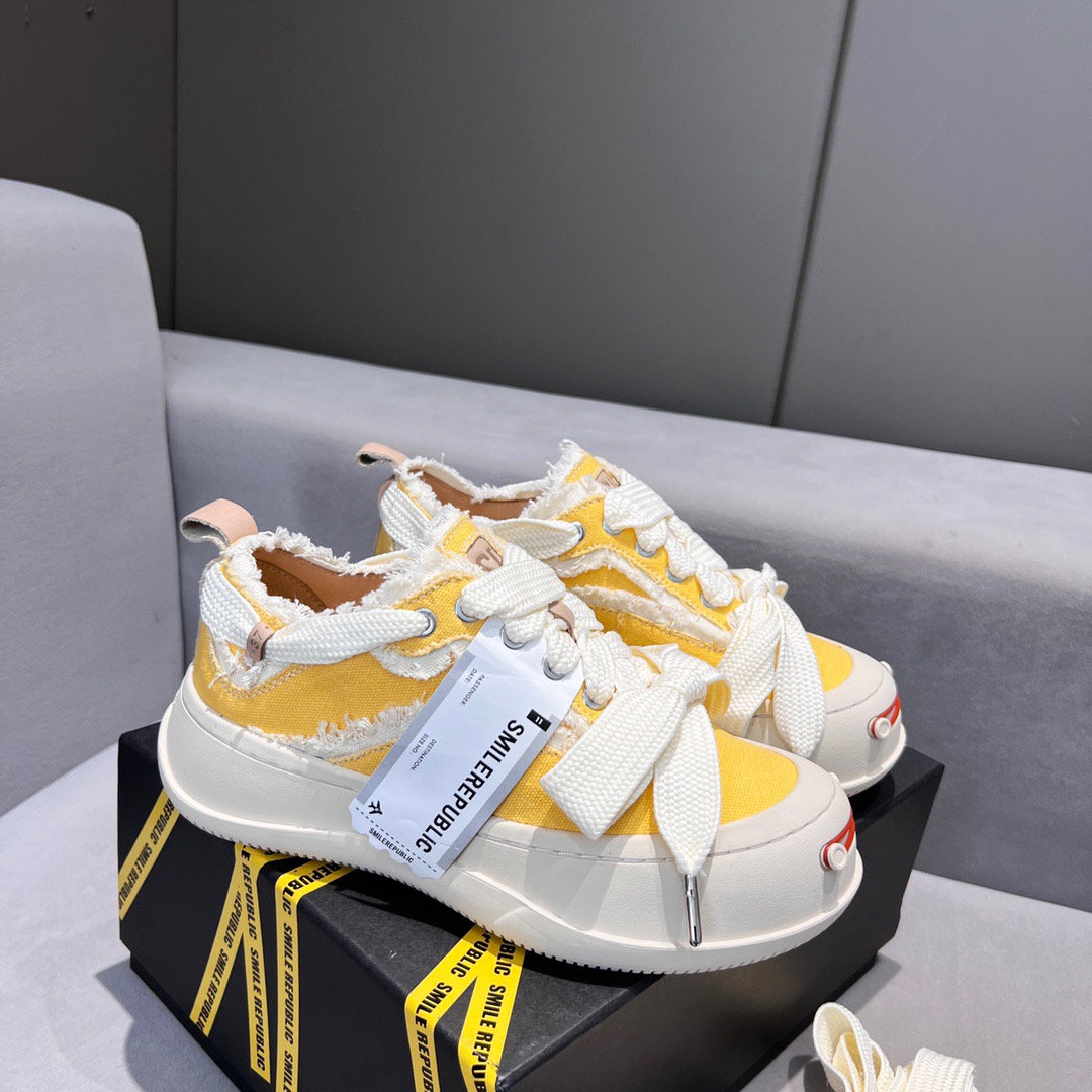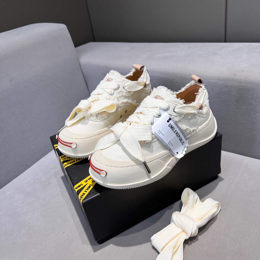 圆润的低帮厚底帆布鞋型,前端做了小凹槽+橡皮筋点缀修饰,呈现“开口笑”的设计!