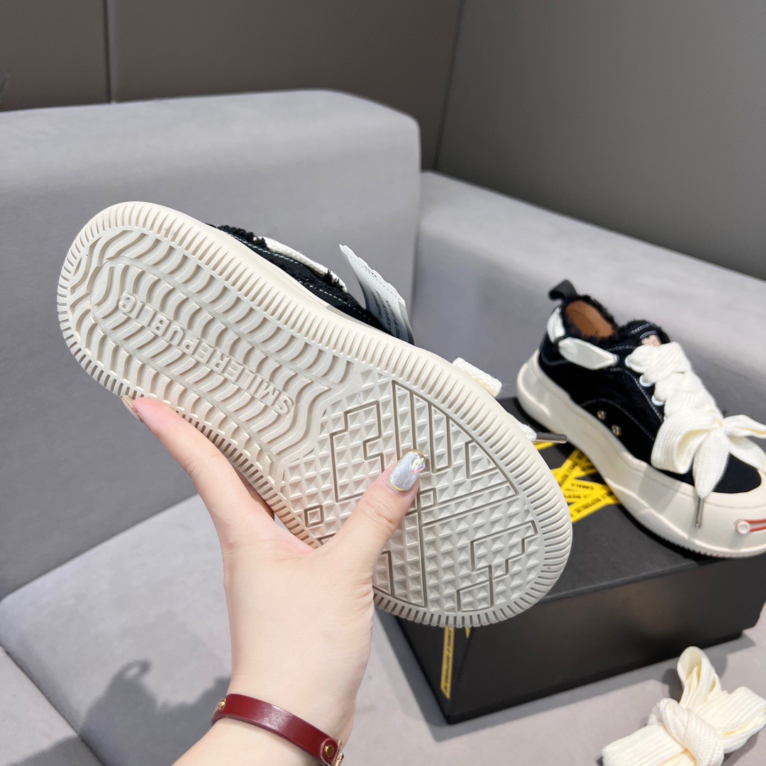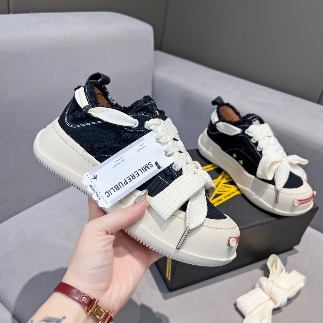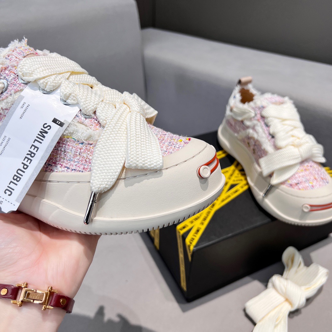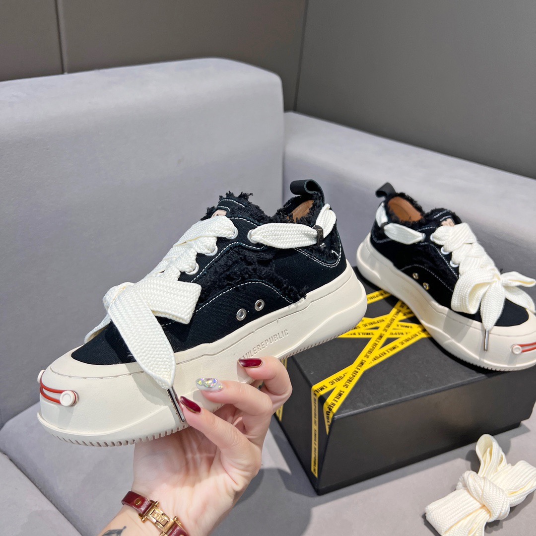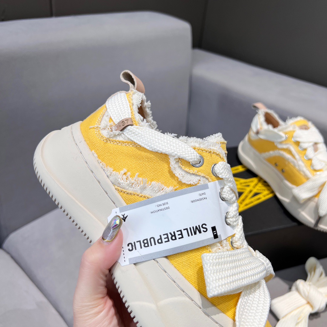 圆润的低帮厚底帆布鞋型,前端做了小凹槽+橡皮筋点缀修饰,呈现“开口笑”的设计!