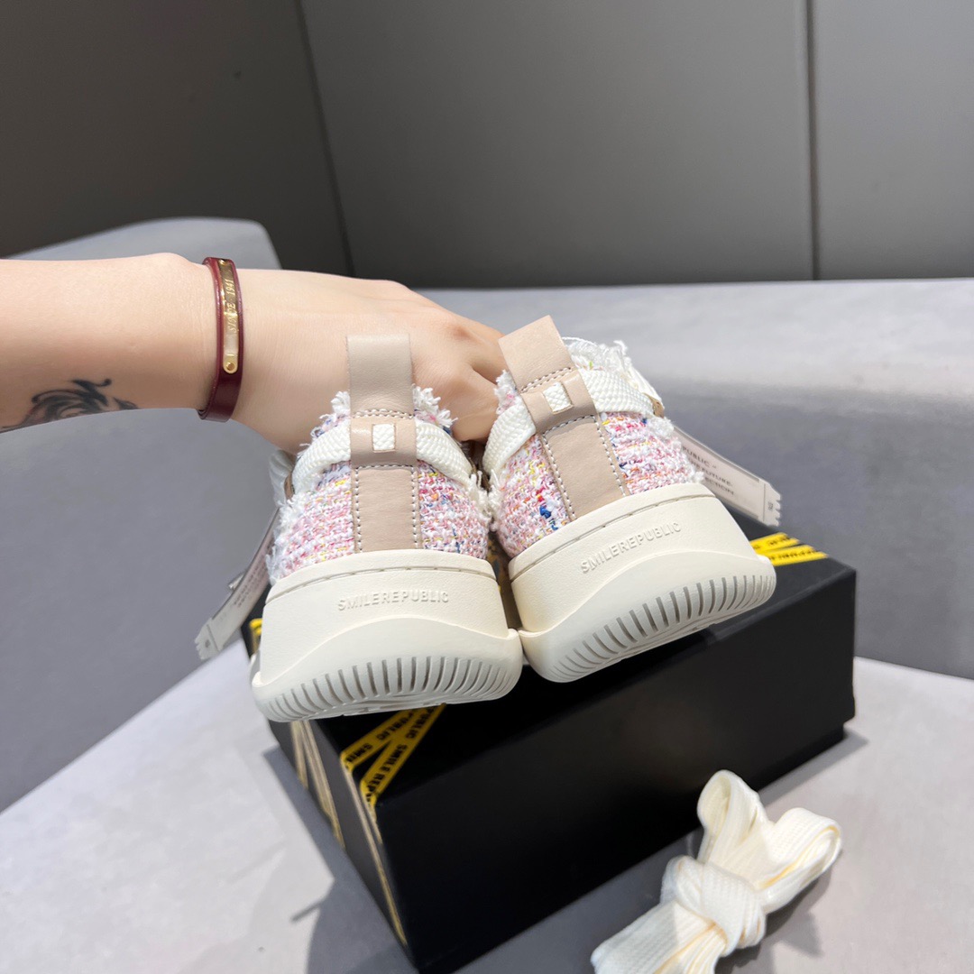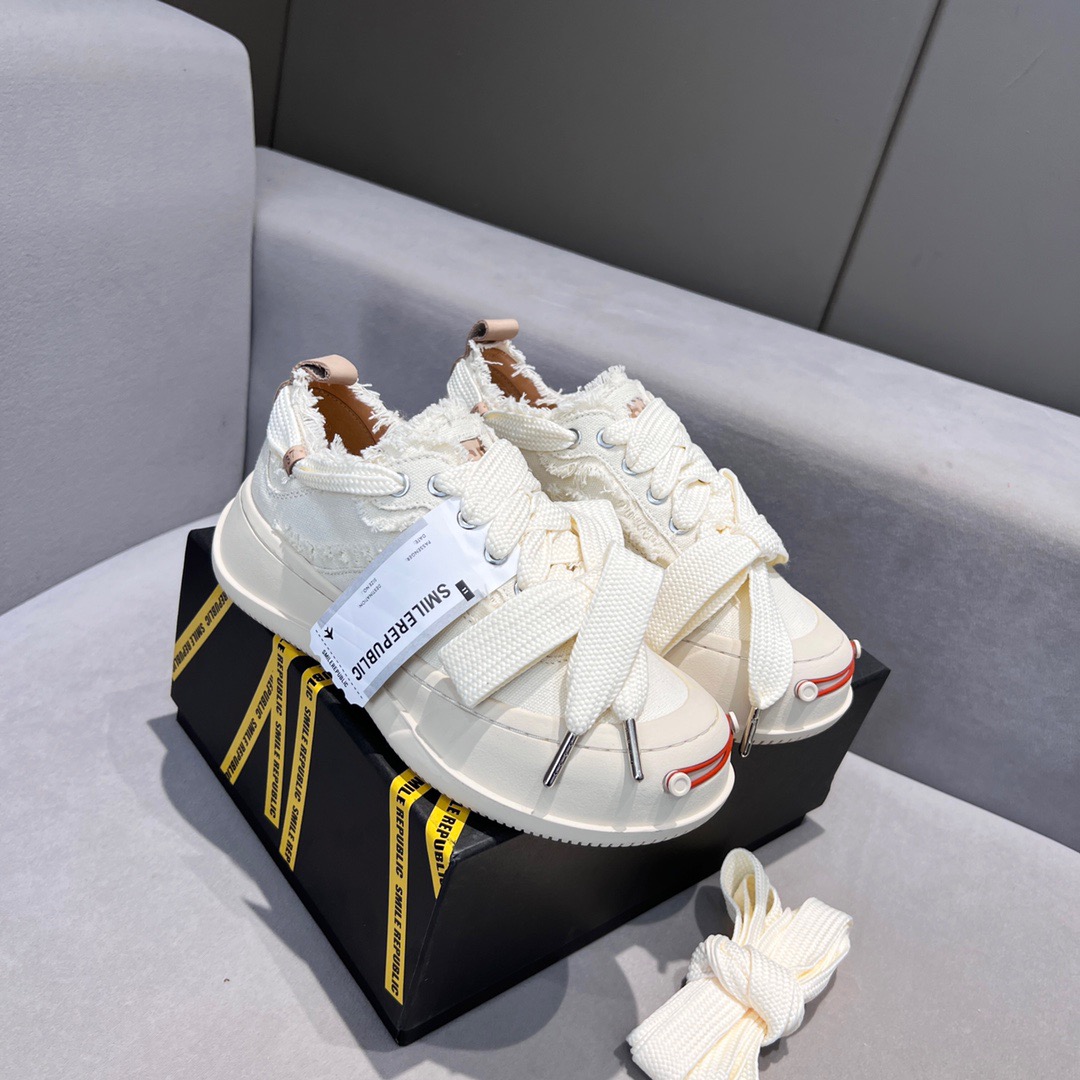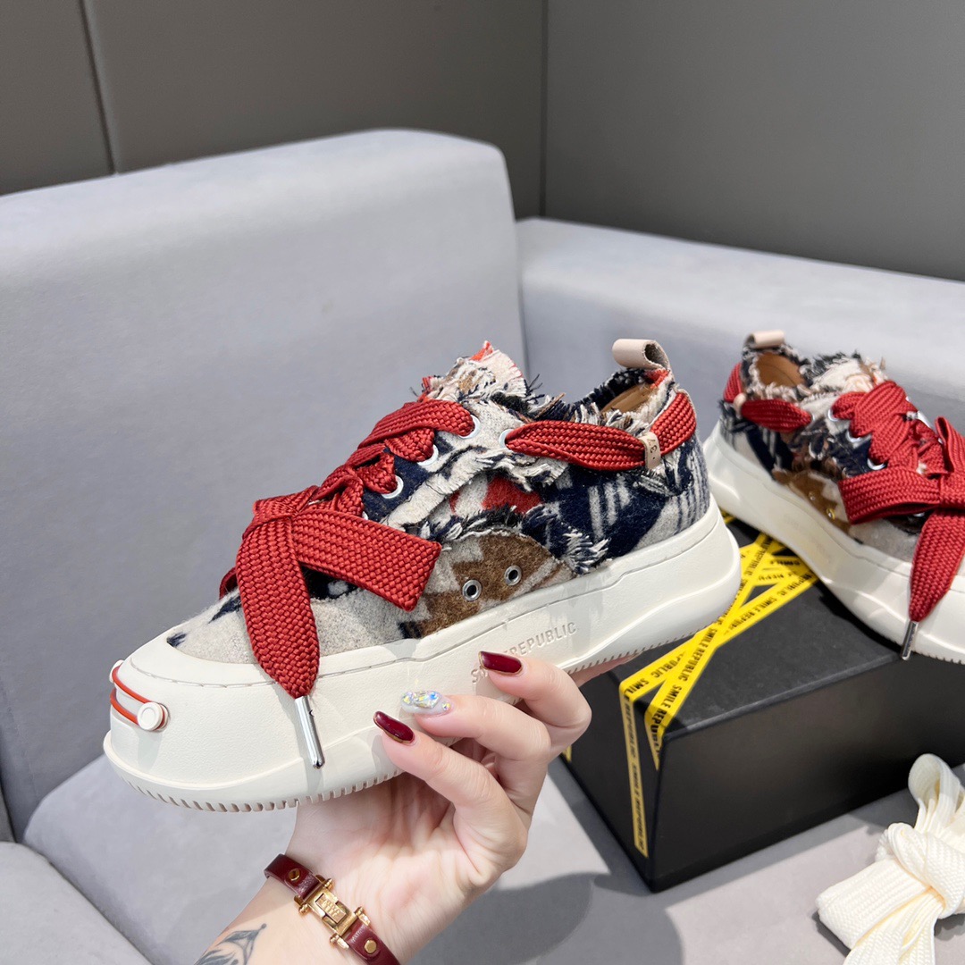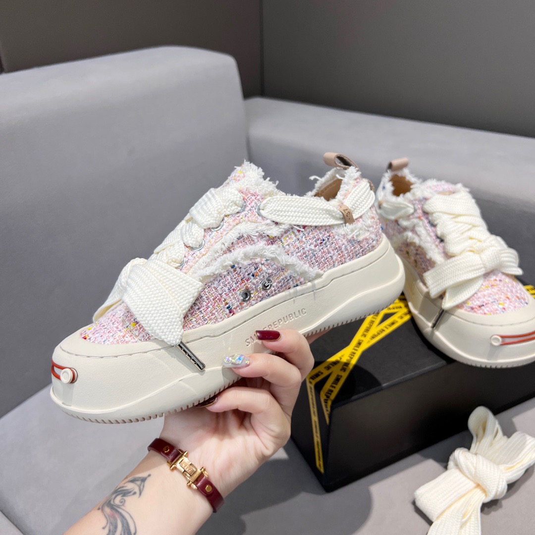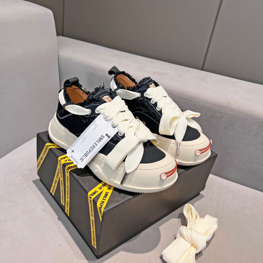 圆润的低帮厚底帆布鞋型,前端做了小凹槽+橡皮筋点缀修饰,呈现“开口笑”的设计!