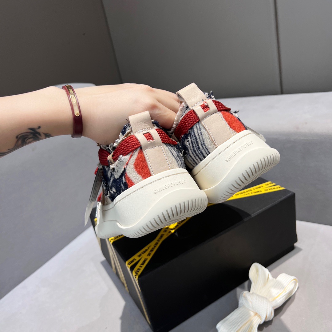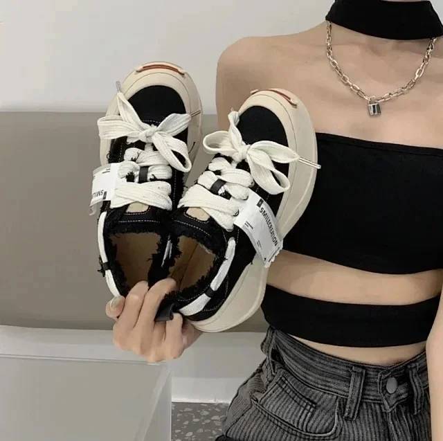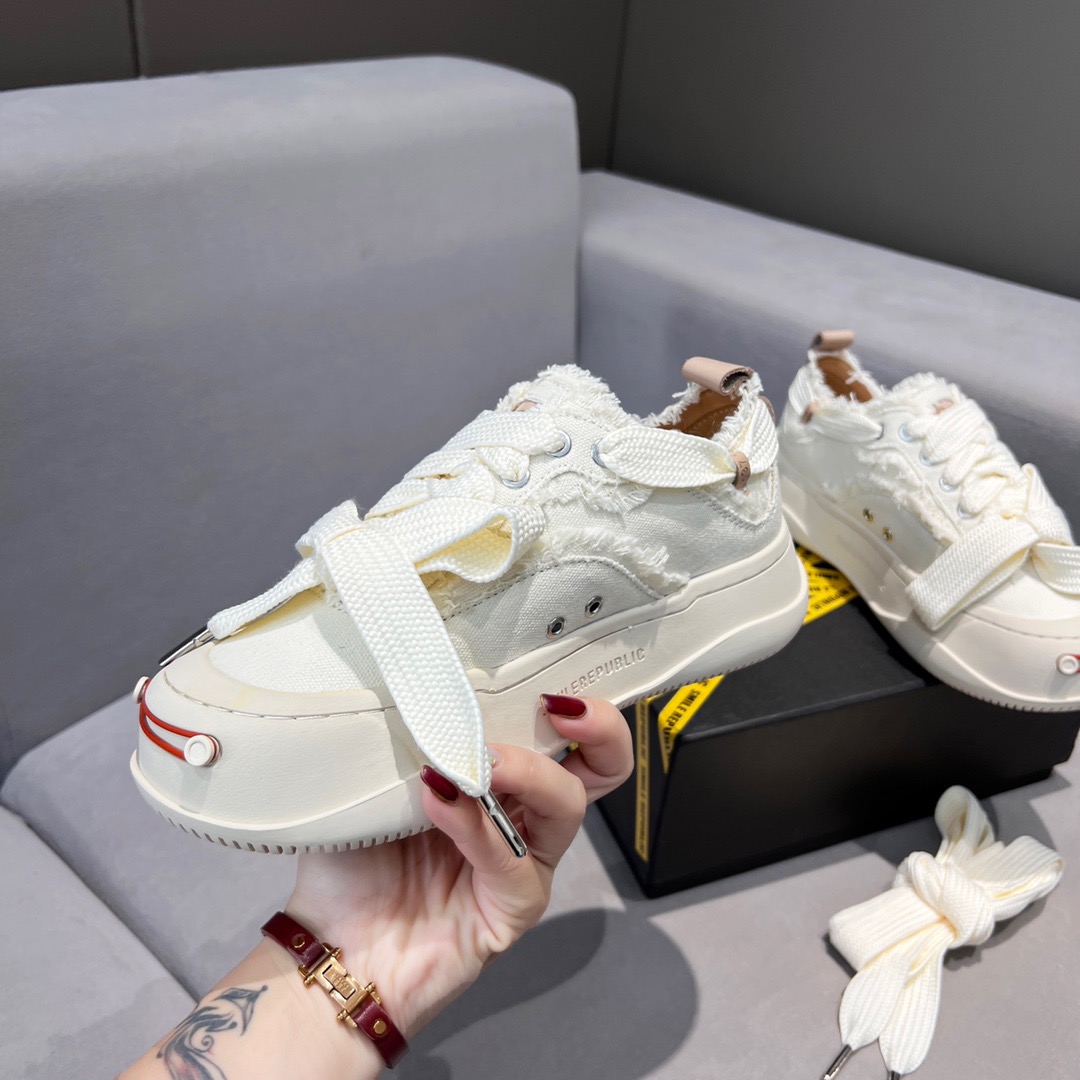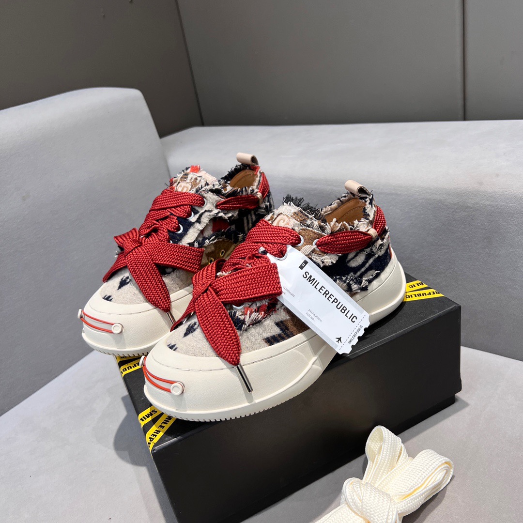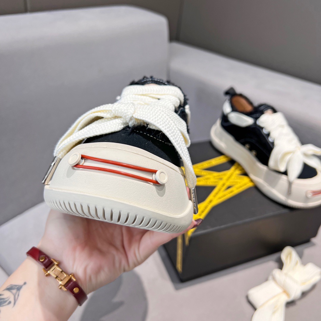 圆润的低帮厚底帆布鞋型,前端做了小凹槽+橡皮筋点缀修饰,呈现“开口笑”的设计!