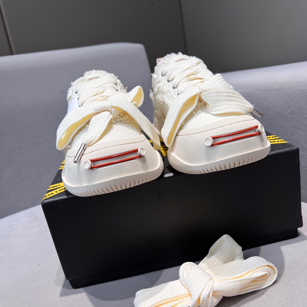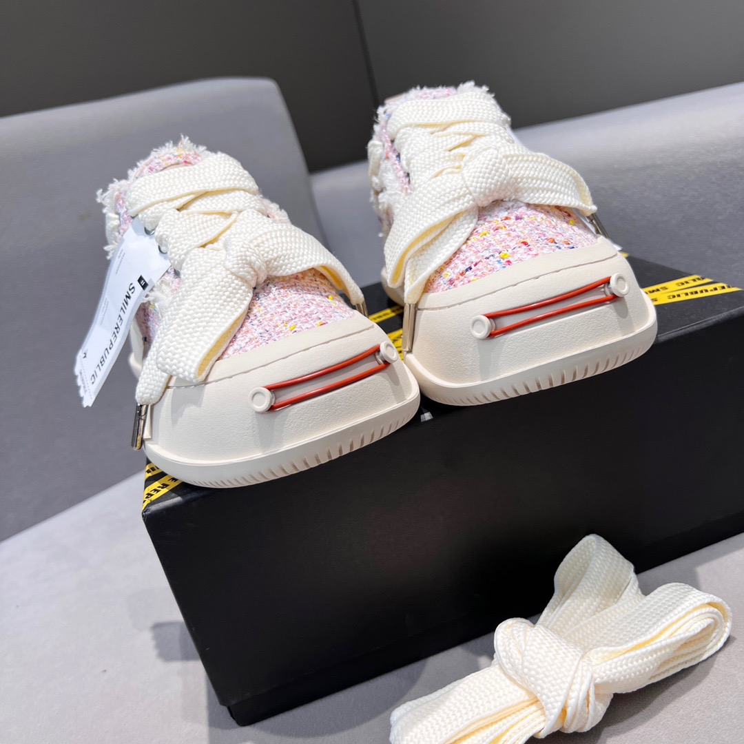 宽鞋绳绕鞋尾一圈,穿插至鞋头,并做了蝴蝶结前置的造型处理,侧面还有杜邦纸飞机票点缀!