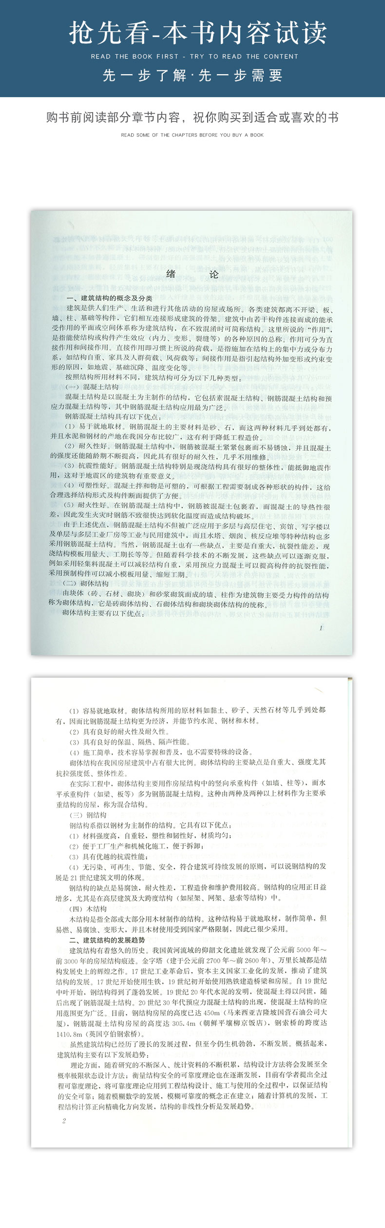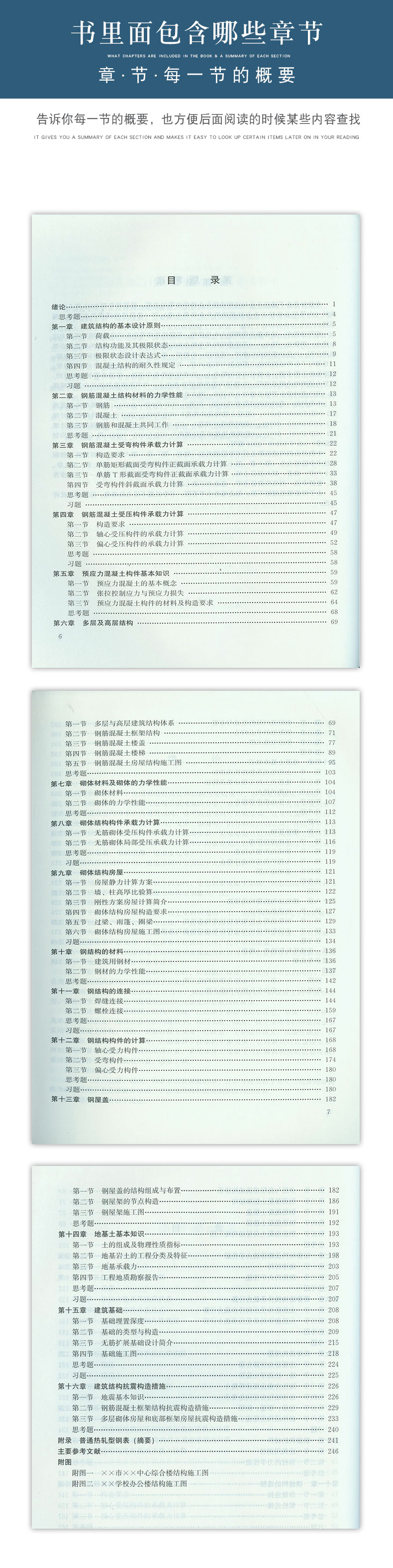绪论。第一章 建筑结构的基本设计原则;第二章 钢筋混凝土结构材料的力学性能;第三章 钢筋混凝土受弯构件承载力计算;第四章 钢筋混凝土受压构件承载力计算;第五章 预应力混凝土构件基本知识;第六章 多层及高层结构;第七章 砌体材料及砌体的力学性能;第八章 砌体结构构件承载力计算;第九章 砌体结构房屋;第十章 钢结构的材料;第十一章 钢结构的连接;第十二章 钢结构构件的计算;第十三章 钢屋盖;第十四章 地基土基本知识;第十五章 建筑基础;第十六章 建筑结构震构造措施。附录 普通热轧型钢表(摘要)。主要参考文献。附图。