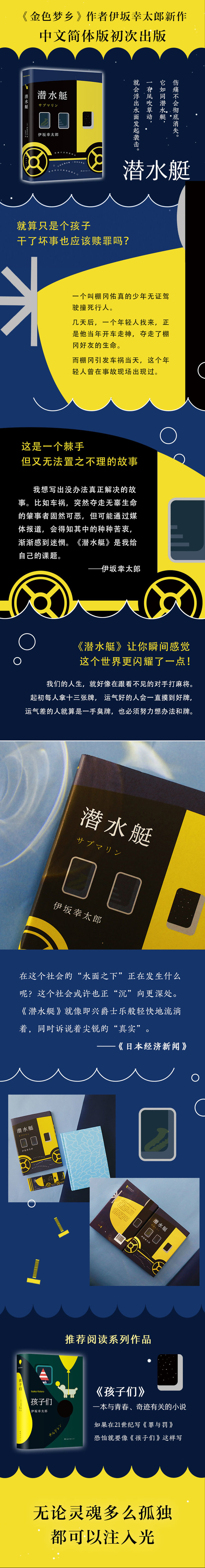 《潜水艇》是日本作家伊坂幸太郎的长篇小说,讲述了一个关于青春与希望的故事,虽然带有一点点残酷,却还是让人感到无比温暖。伊坂幸太郎说:“我想写出没办法真正解决的故事。比如车祸,突然夺走无辜生命的肇事者固然可恶,但可能通过媒体报道,我们会得知其中的种种苦衷,渐渐感到迷惘。《潜水艇》是我给自己的课题。”