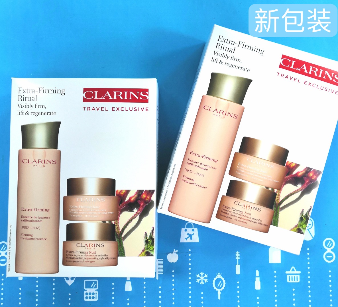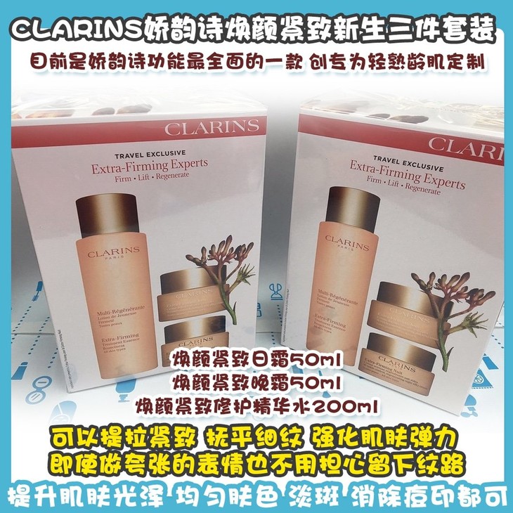 👑CLARINS娇韵诗焕颜紧致新生弹簧三件套装 👍目前是娇韵诗功能最全面的一款👏,首创专为轻熟龄肌定制。 😘含有:被美誉为“逆时光之面霜”的日霜晚霜。 ✨可提拉紧致,抚平细纹、强化肌肤弹力〽,即使做夸张的表情也不用担心留下纹路。 💦精华水补充肌肤水分,恢复轻熟肌弹性。 🌱全植物萃取,提升肌肤光泽,均匀肤色、淡斑、消除痘印都可。 【套装包括】:焕颜紧致日霜50ml➕焕颜紧致晚霜50ml➕焕颜紧致修护精华水200ml
