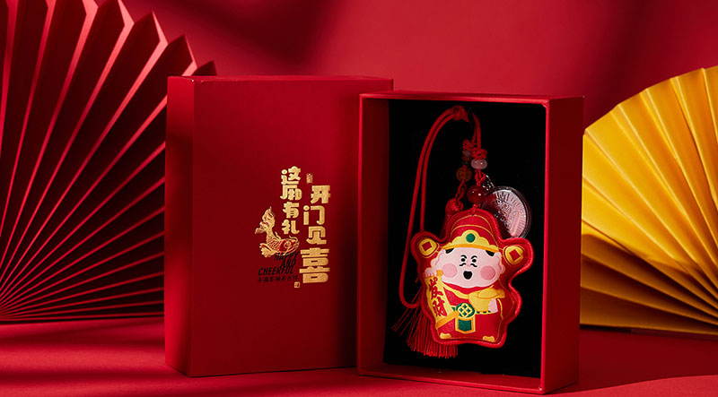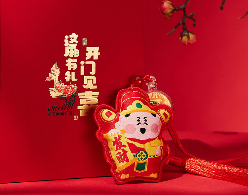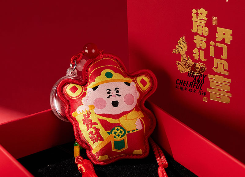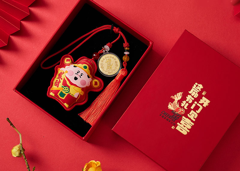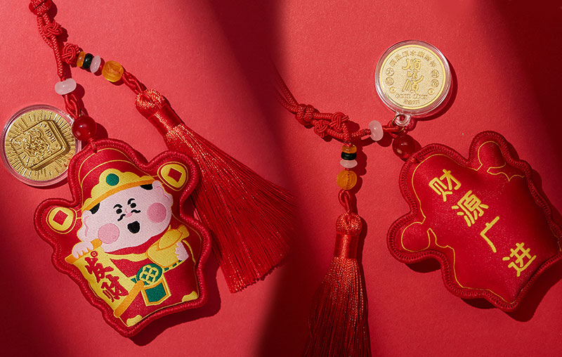 挂件上配有“顺风顺水顺财神”等字样的足金999小金片,寓意着在新的一年里,财运亨通、事业顺利,生活如意。