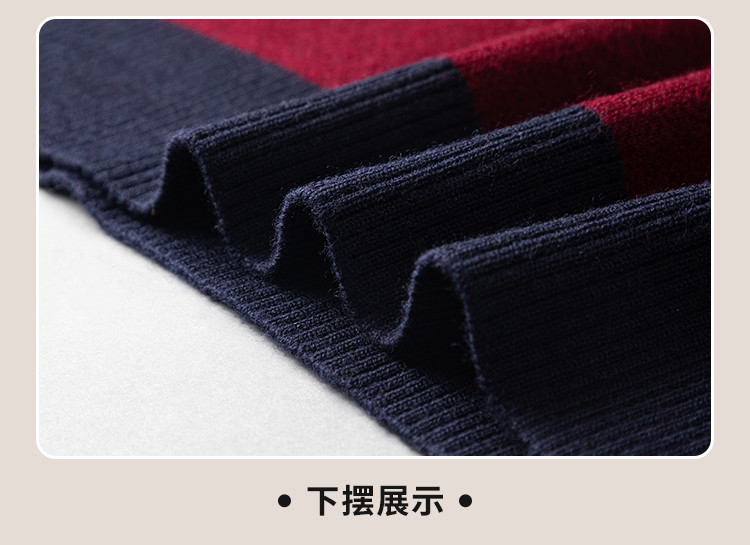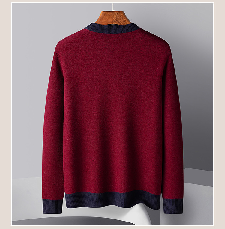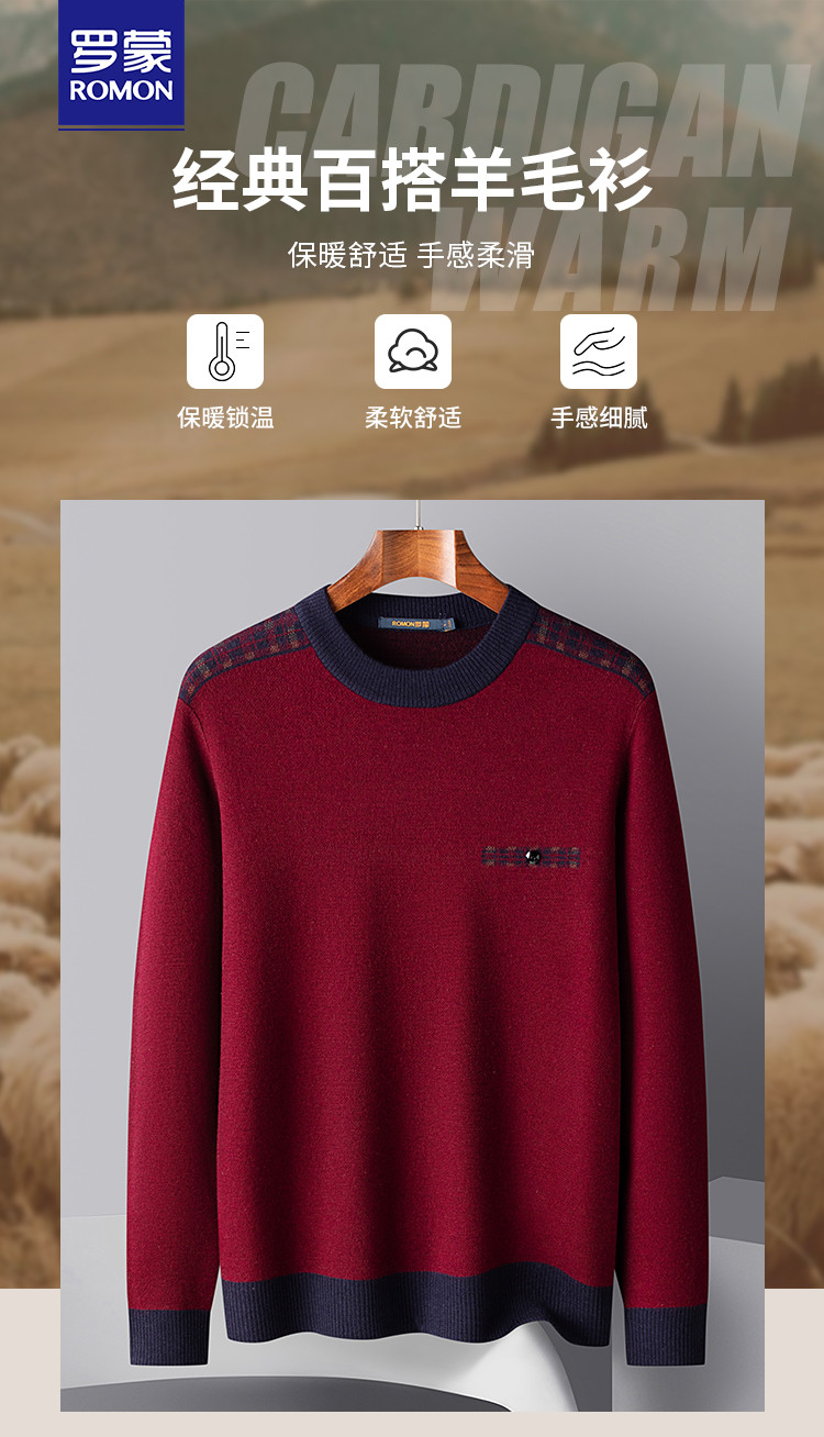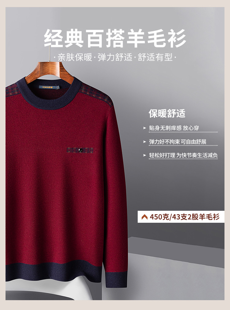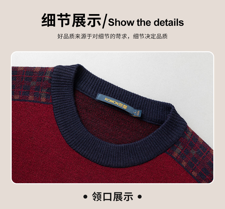 27DKGLB09【100羊毛 格纹肩章】罗蒙秋冬男装羊毛衫男士加厚保暖圆领拼色休闲针织毛衣男